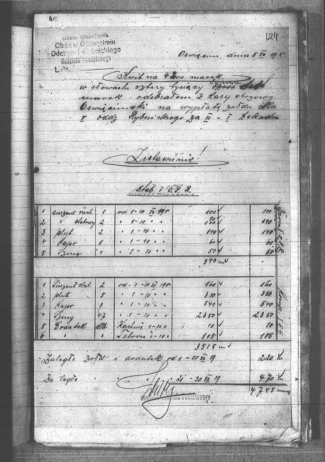 Tytuł Kwit za pobranie wypłaty za żołd dla I Oddziału Rybnickiego za I-III dekadę