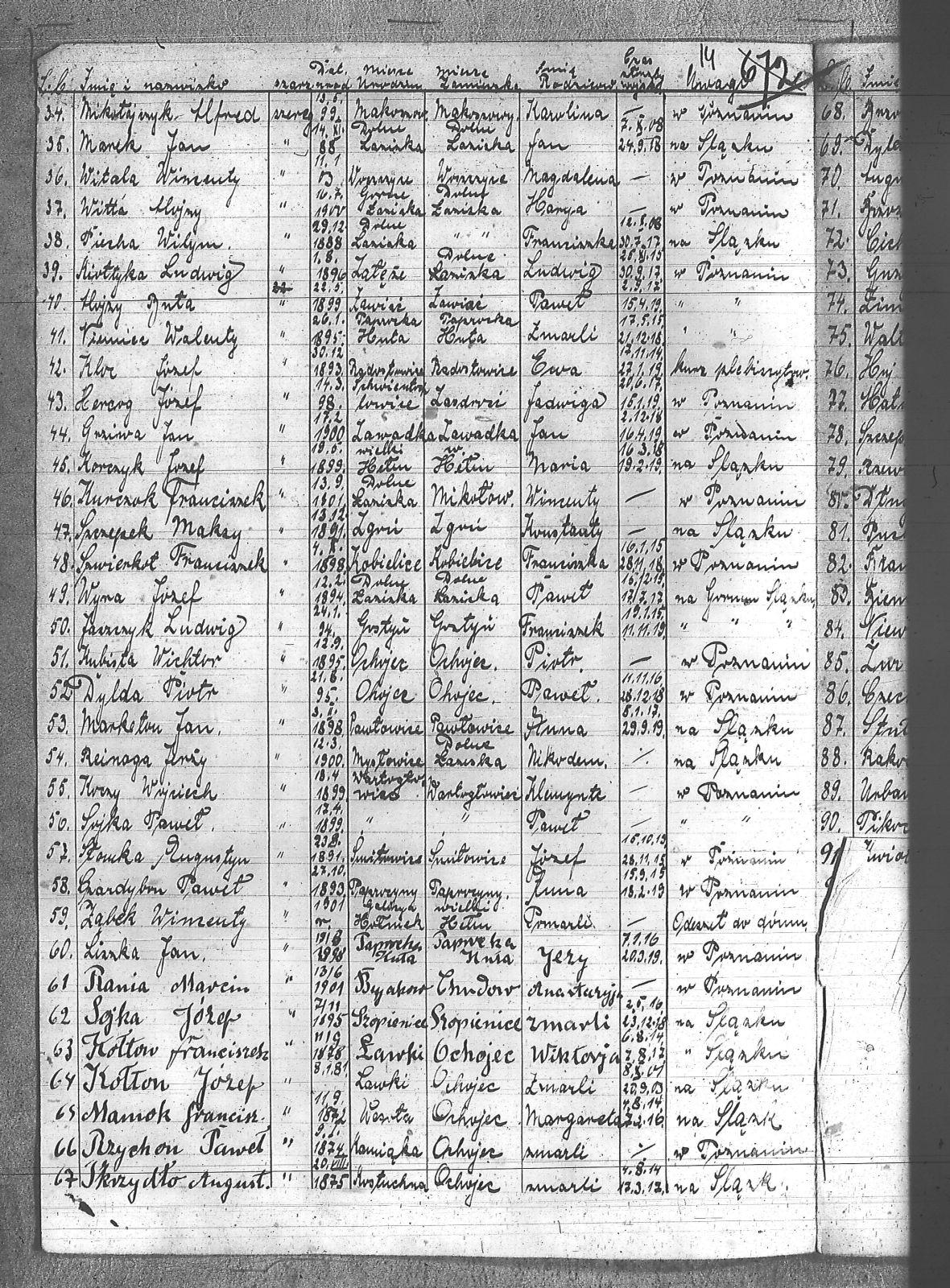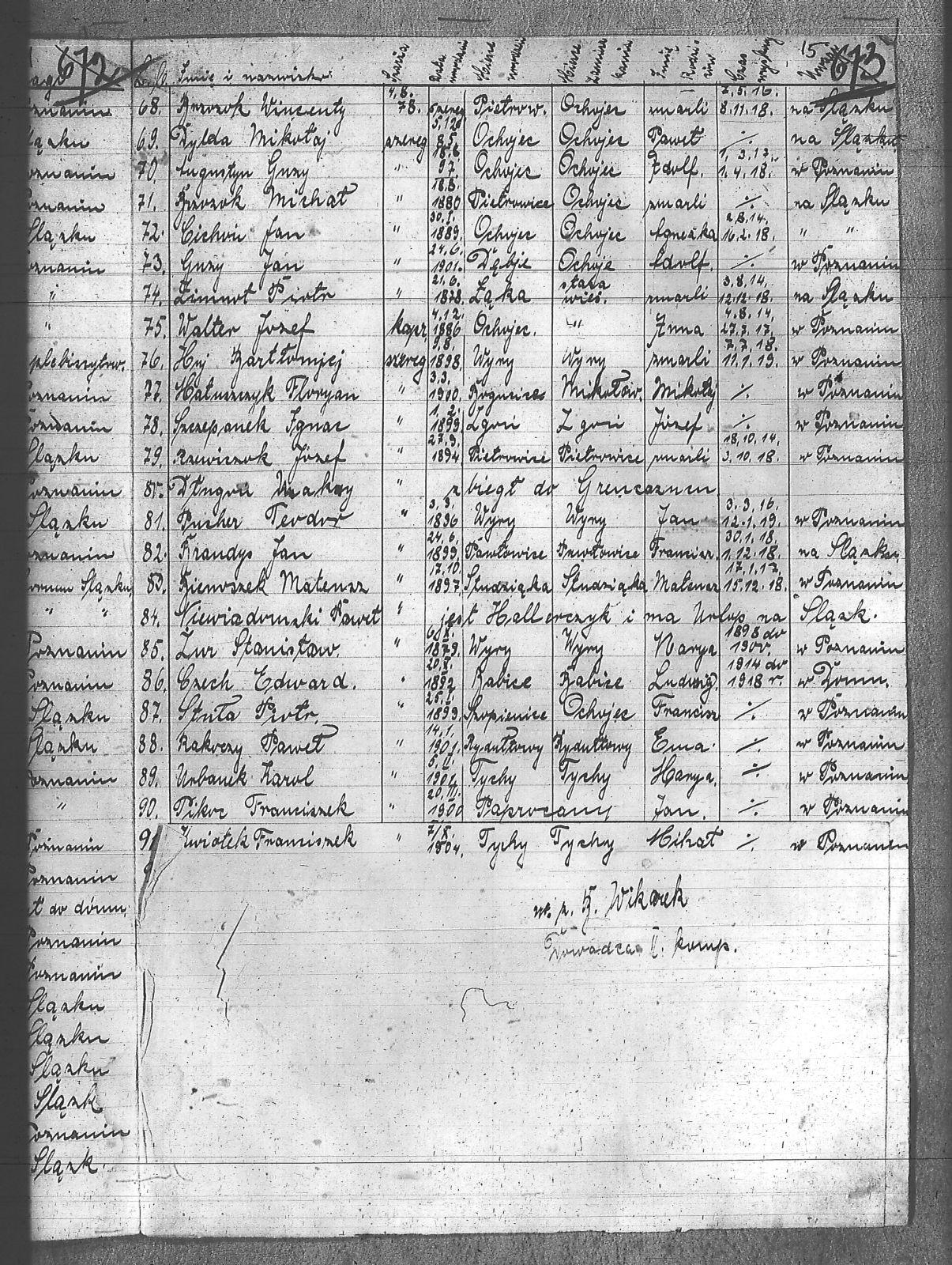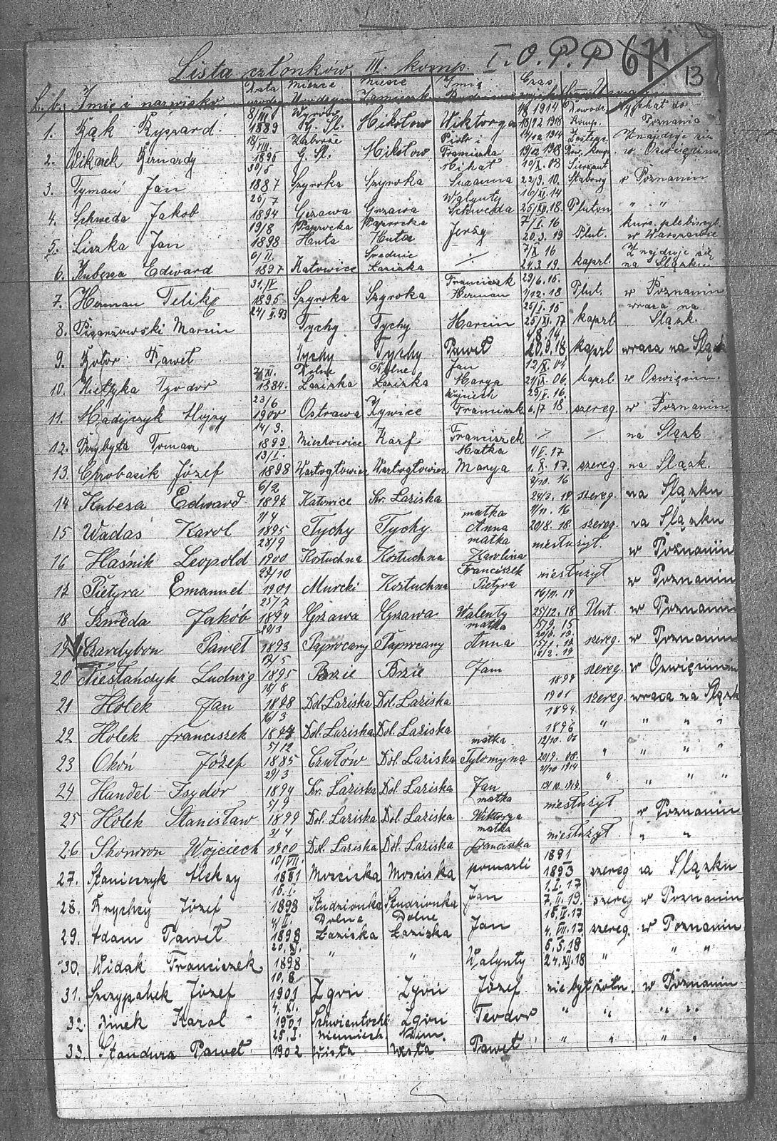 Adam, Paweł; Bąk, Ryszard; Bienoszek, Mateusz; Bimek, Karol; Botor, Paweł; Brandys, Jan; Brychcy, Józef; Brzozok, Michał; Brzozok, Wincenty; Buła, Alojzy; Chrobazik, Józef; Cichoń, Jan; Czardybon, Paweł; Czech, Edward; Długoń, Maksymilian; Dylda, Mikołaj; Dylda, Piotr; Grziwa, Jan; Guzy, Augustyn; Guzy, Jan; Handel, Isydor; Haśnik, Leopold; Hatuszczyk, Florian; Hercog, Józef; Herman, Feliks; Holek, Franciszek; Holek, Jan; Holek, Stanisław; Huj, Bartłomiej; Jaszczyk, Ludwik; Kiełtyka, Teodor; Kiołtyka, Ludwik; Kloc, Józef; Koczy, Wojciech; Korczyk, Józef; Kotłon, Franciszek; Kotłon, Józef; Kubesa, Edward; Kubista, Wiktor; Kulesza, Edward; Kurczok, Franciszek; Kwiatek, Franciszek; Liszka, Jan; Madejczyk, Alojzy; Mamok, Franciszek; Marek, Jan; Marketon, Jan; Mikołajczyk, Alfred; Niemiec, Walenty; Niesłańczyk, Kudwik; Niewiadomski, Paweł; Okoń, Józef; Piecha, Wilym; Pietyra, Emanuel; Pikoc, Franciszek; Pisażowski, Marcin; Przybyła, Tomasz; Pucha, Teodor; Rakoczy, Paweł; Rania, Marcin; Reinoga, Jerzy; Rzewiczok, Józef; Rzychon, Paweł; Skowron, Wojciech; Skrzydło, August; Słomka, Augustyn; Sojka, Józef; Sojka, Paweł; Standura, Paweł; Stańczyk, Aleksy; Stuła, Piotr; Szczepanek, Ignac; Szczepek, Maksymilian; Szczypanek, Józef; Szweda, Jakób; Szwierkot, Franciszek; Tyman, Jan; Urbanik, Karol; Wadaś, Karol; Walter, Józef; Widak, Franciszek; Wikarek, Bernard; Witala, Wincenty; Witta, Alojzy; Wyra, Józef; Zimnoł, Piotr; Żabek, Wincenty; Żur, Stanisław; |