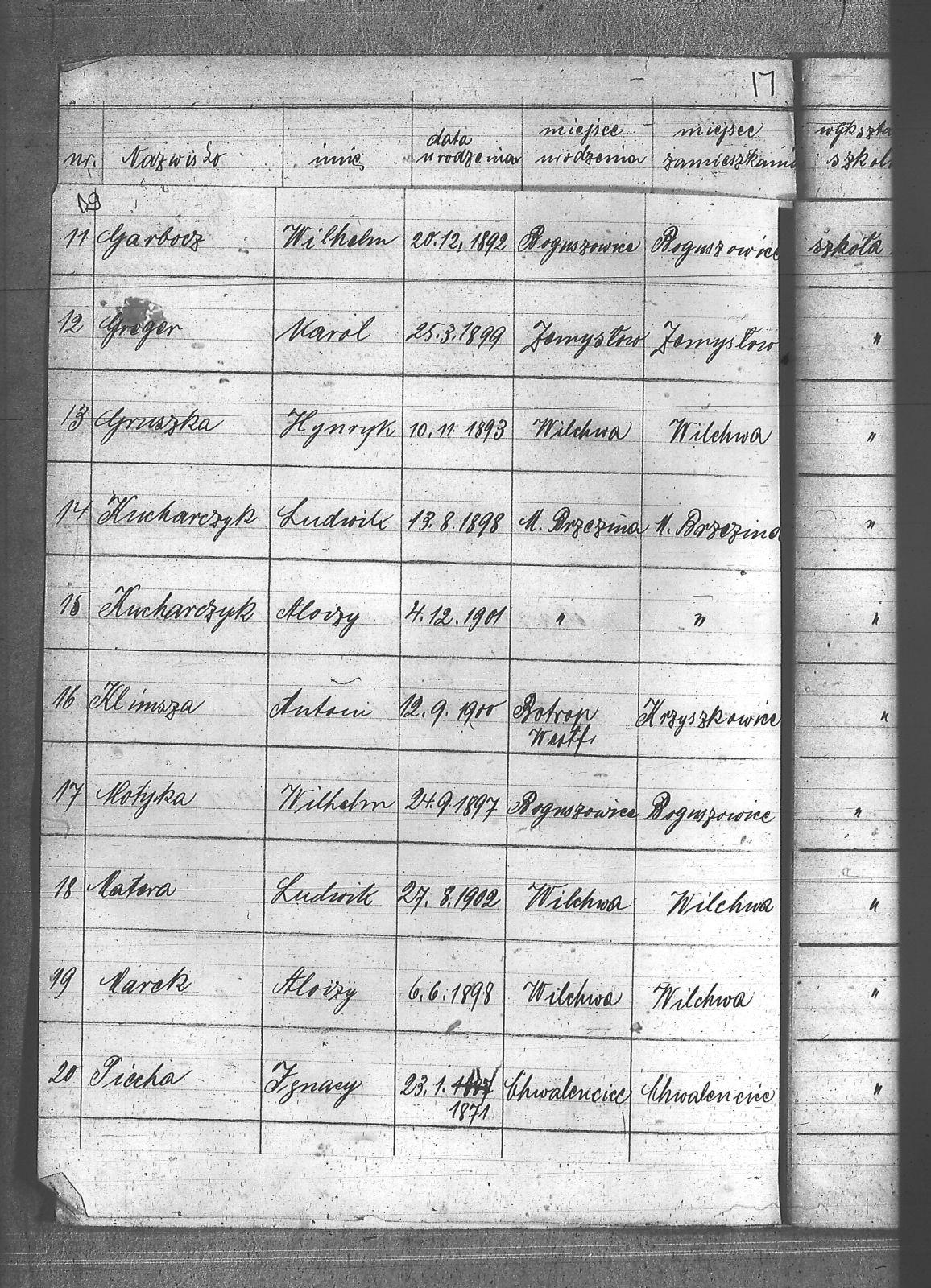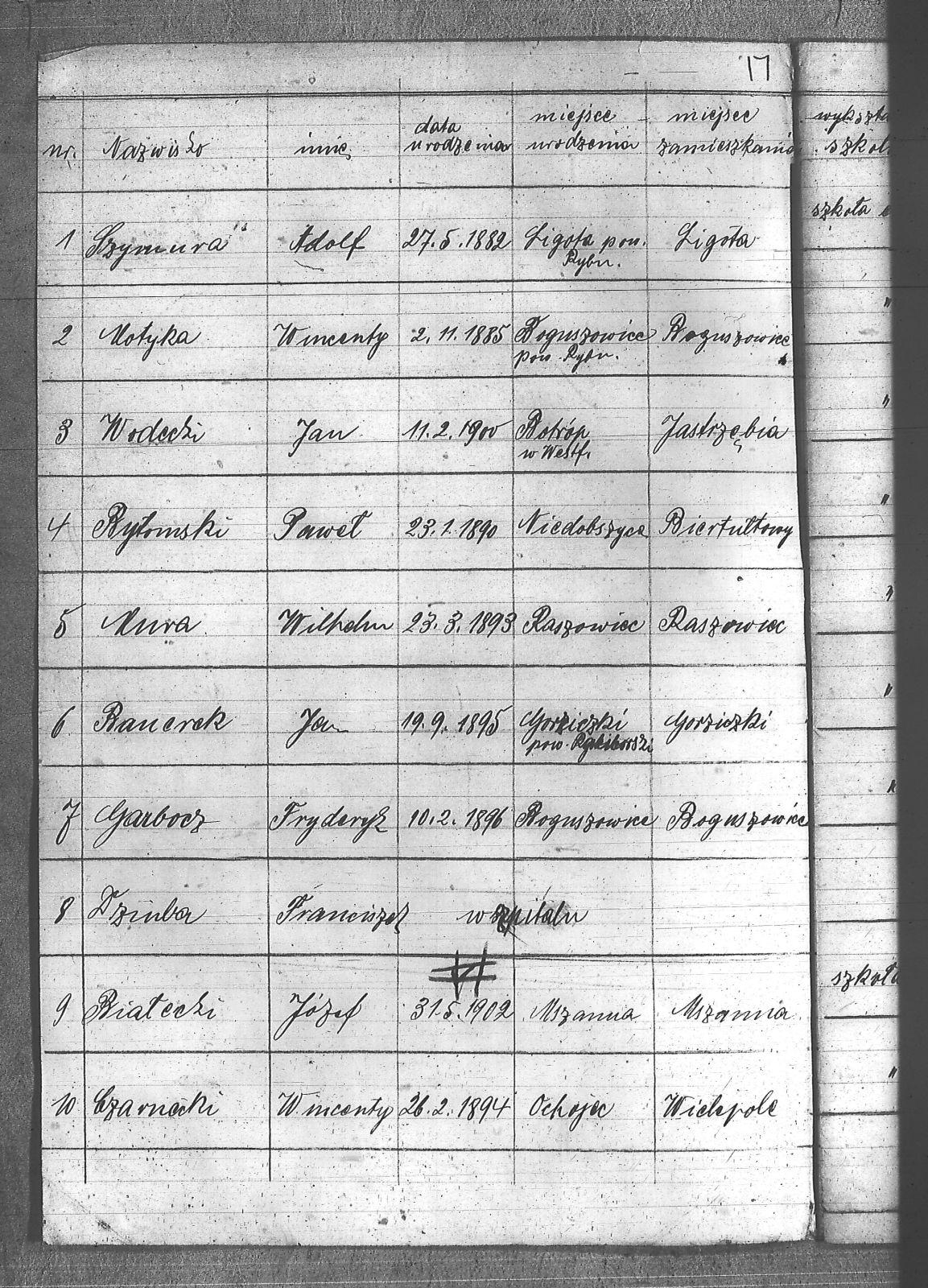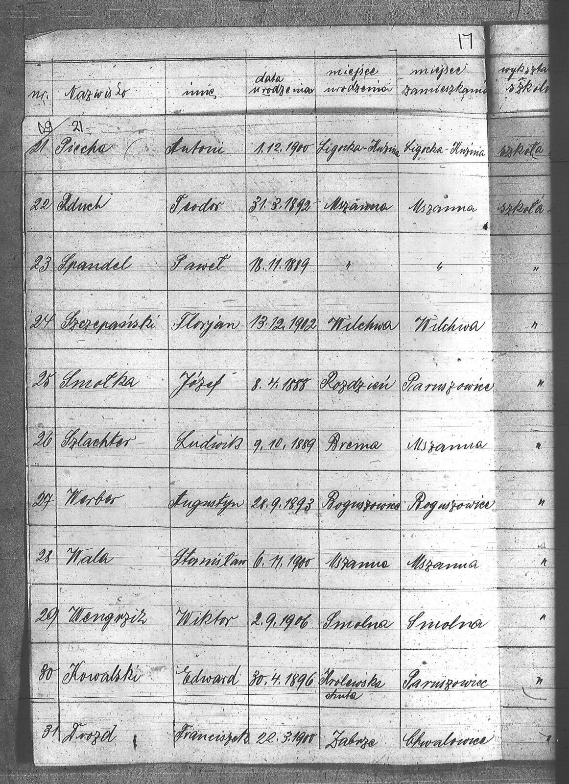 Banerek, Jan; Białecki, Józef; Bytomski, Paweł; Czarnecki, Wincenty; Drozd, Franciszek; Dziuba, Franciszek; Garbocz, Fryderyk; Garbocz, Wilhelm; Greger, Karol; Gruszka, Henryk; Klimsza, Antoni; Kowalski, Edward; Kucharczyk, Alojzy; Kucharczyk, Ludwik; Marek, Alojzy; Matera, Ludwik; Motyka, Wilhelm; Motyka, Wincenty; Mura, Wilhelm; Piecha, Antoni; Piecha, Ignacy; Rduch, Teodor; Smołka, Józef; Spandel, Paweł; Szczepański, Florian; Szlachter, Ludwik; Szymura, Adolf; Wala, Stanisław; Wengrzik, Wiktor; Werber, Augustyn; Wodecki, Jan; |