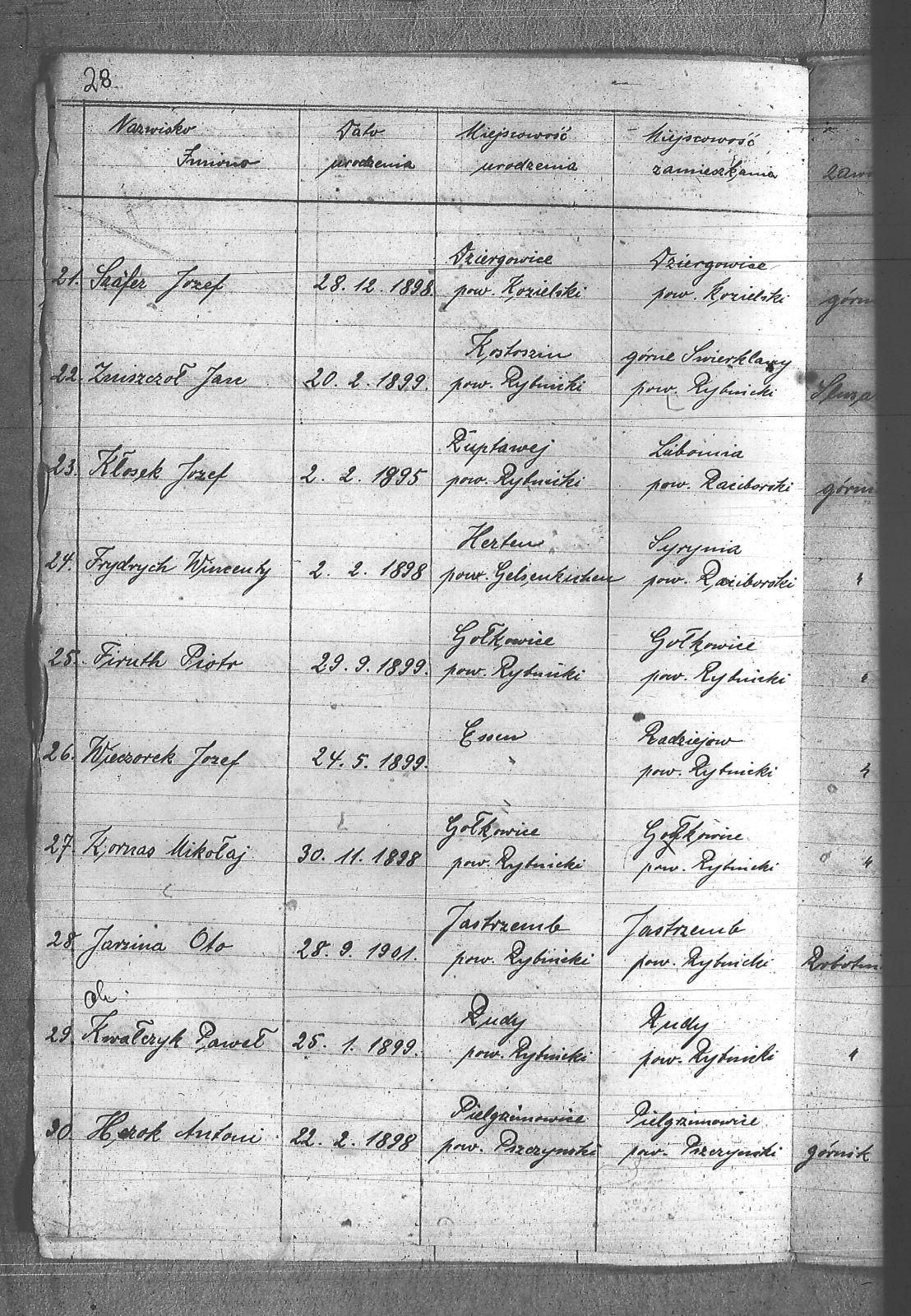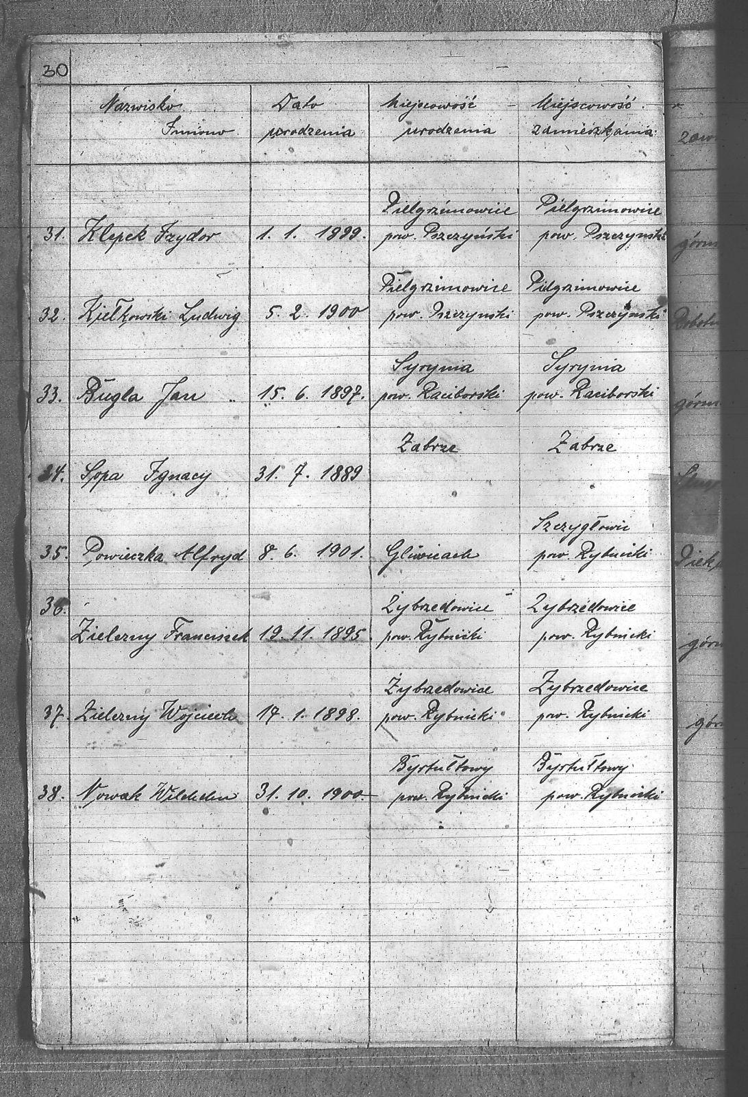 Adamczyk, Zygfryd; Bugla, Jan; Faber, Józef; Firuth, Piotr; Frydrych, Wincenty; Frysz, Joachim; Gabor, Alojzy; Garbas, Józef; Gawełczyk, Ludwik; Herok, Antoni; Hoła, Alojzy; Jacob, Karol; Jarzina, Otto; Kielkowski, Wojciech; Kiełkowski, Ludwik; Kinda, Stanisław; Klepek, Izydor; Kłosek, Józef; Kłosok, Józef; Kołeczko, Stefan; Kornas, Mikołaj; Kwałczyk, Paweł; Lach, Antoni; Matuszczyk, Alojzy; Nowak, Wilhelm; Powieczka, Alfred; Rusok, Konstanty; Salamon, Jan; Sopa, Ignacy; Stania, Paweł; Stasiowski, Jan; Szafer, Józef; Szuła, Izydor; Tomaszek, Leopold; Wieczorek, Józef; Zielezny, Franciszek; Zielezny, Wojciech; Zniszczoł, Jan; |