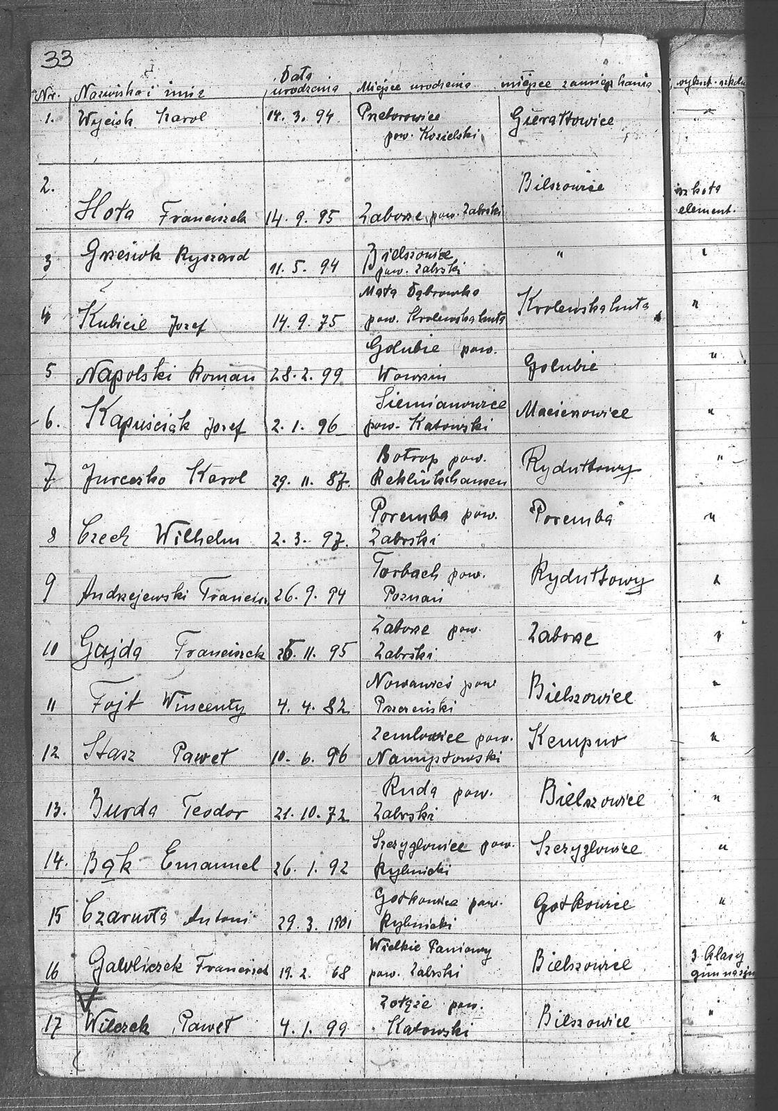 | Osoby | Andrzejewski, Franciszek; Bąk, Emanuel; Burda, Teodor; Czarnota, Antoni; Czech, Wilhelm; Fellman, Stefan; Fojt, Wincenty; Gajda, Franciszek; Gawliczek, Franciszek; Głąbica, Alojzy; Grzesiok, Ryszard; Hoła, Franciszek; Jureczko, Karol; Kalemba, Henryk; Kapuściak, Józef; Kądziołka, Jan; Kielecki, Jan; Kubiciel, Józef; Napolski, Roman; Nawrot, Józef; Stasz, Paweł; Wilczek, Paweł; Wycisk, Karol; |