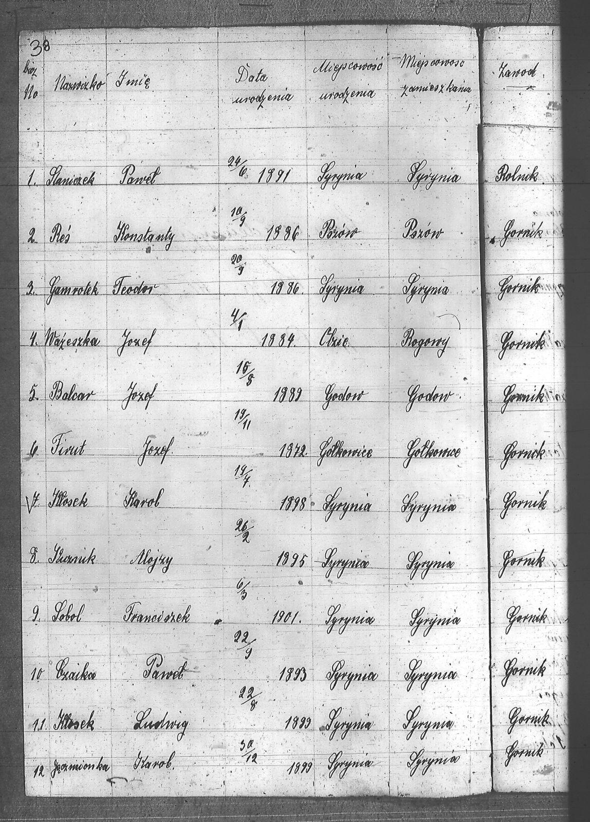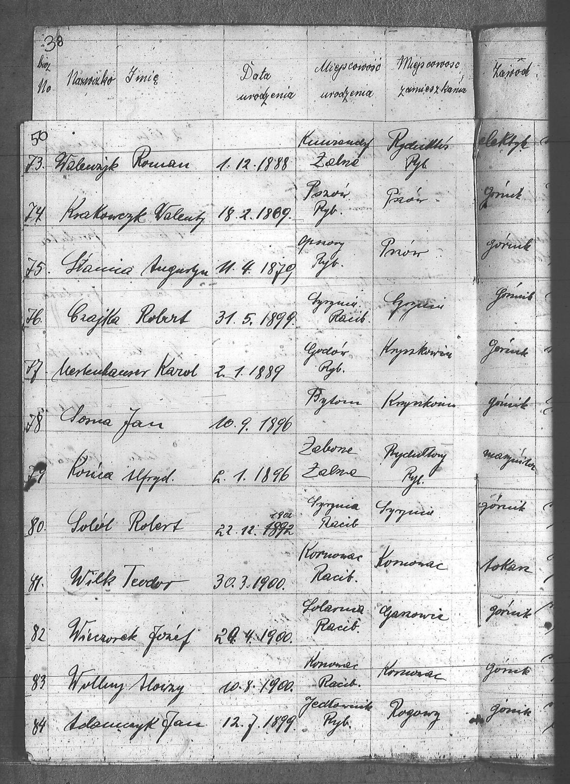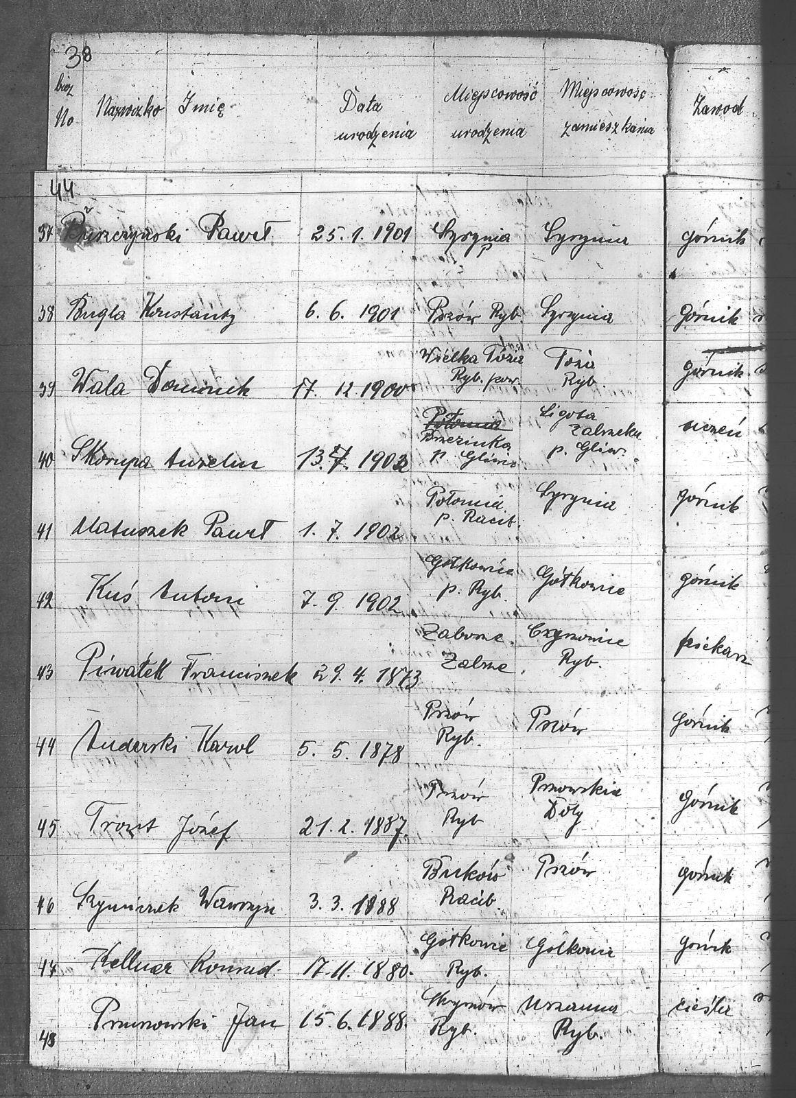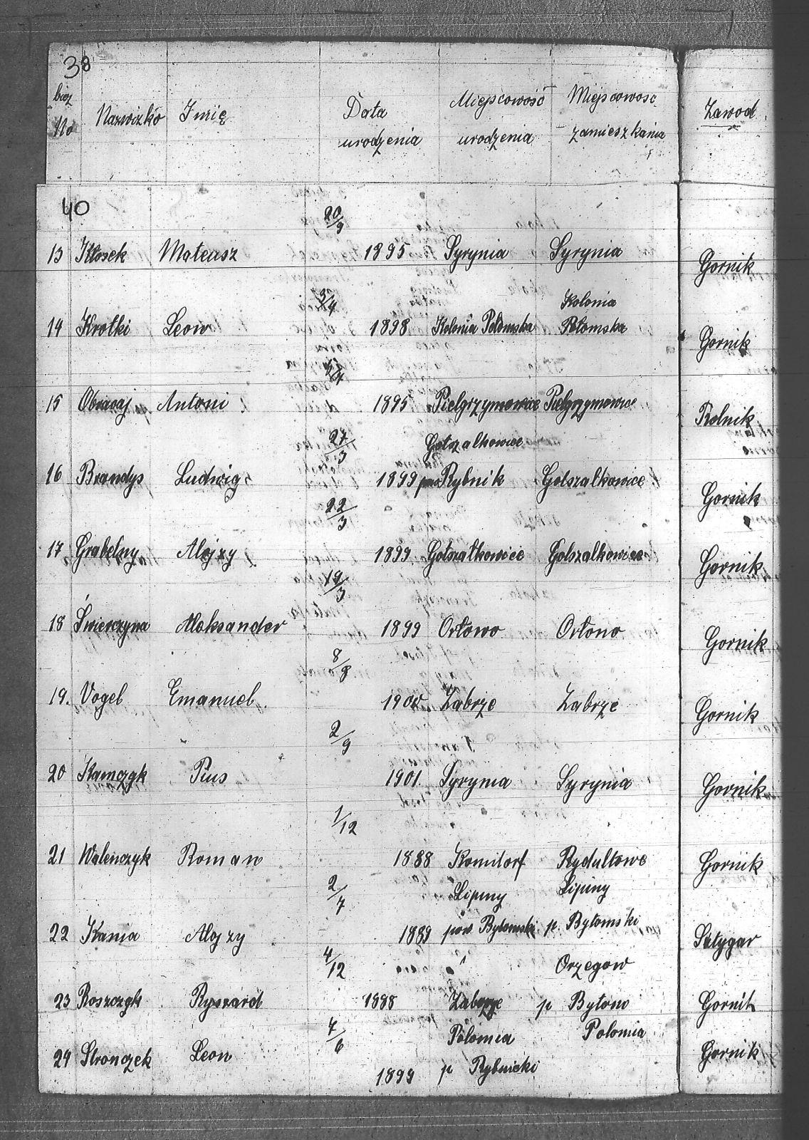Adamczyk, Jan; Anderski, Karol; Balcar, Józef; Bańko, Ludwik; Barnabas, Franciszek; Berger, Konstanty; Boszczek, Ryszard; Brandes, Franciszek; Brandys, Ludwik; Brzezinka, Józef; Bugla, Konstanty; Bugla, Paweł; Bugla, Rajmund; Burzczyński, Paweł; Burzywoda, Walenty; Ceglarski, Józef; Czajka, Franciszek; Czajka, Paweł; Czajka, Robert; Firut, Józef; Frydrych, Jan; Furgoł, Piotr; Gamrotek, Teodor; Gasz, Adolf; Godowski, Antoni; Grobelny, Alojzy; Jargoń, Mateusz; Jęczmionka, Karol; Jęczmionka, Karol II; Jęczmionka, Teodor; Jochem, Antoni; Kamczyk, Pius; Kania, Alojzy; Kellner, Konrad; Kłosek, Alojzy; Kłosek, Karol; Kłosek, Ludwig; Kłosek, Mateusz; Koczy, Teoofil; Kollorz, Wilhelm; Kotula, Józef; Kotulla, Franciszek; Kowalczyk, Józef; Kozica, Alfred; Kozider, Mikołaj; Kozioł, Alojzy; Krakowczyk, Walenty; Krótki, Leon; Kubica, Jan; Kura, Franciszek; Kuś, Antoni; Kuznik, Alojzy; Łukaszczyk, Teofil; Matuszek, Paweł; Mazurek, Ludwik; Merkuhauser, Karol; Miczek, Franciszek; Niemiec, Józef; Nier, Franciszek; Obracaj, Antoni; Ochmann, Józef; Olszewski, Emil; Piwałek, Franciszek; Pnunowski, Jan; Pytlik, Wincenty; Reś, Konstanty; Serwatka, Aleksander; Sittek, Emil; Siwek, Paweł; Skorupa, Anzelm; Slronczek, Leon; Sobik, Józef; Sobol, Franciszek; Soból, Robert; Sonicka, Maksymilian; Sosna, Franciszek; Sosna, Jan; Stania, Augustyn; Staniczek, Paweł; Stryczek, Jan; Szafran, Ludwik; Szulik, Wincenty; Szuła, Piotr; Szymiczek, Wawrzyn; Szymura, Emil; świerczyna, Aleksander; Talaska, Bolesław; Tkocz, Jerzy; Toszek, Franciszek; Tront, Józef; Trydrych, Ignacy; Vogel, Emanuel; Wala, Dominik; Walenczyk, Roman; Waleńczyk, Roman; Warzeszka, Józef; Wawrorz, Jan; Wiatr, Jan; Wieczorek, Józef; Wilk, Teodor; Wollny, Alojzy; Zembok, Paweł; Zganiacz, Franciszek; Zientek, Franciszek; Zientek, Teodor; Żuler, Augustyn; |