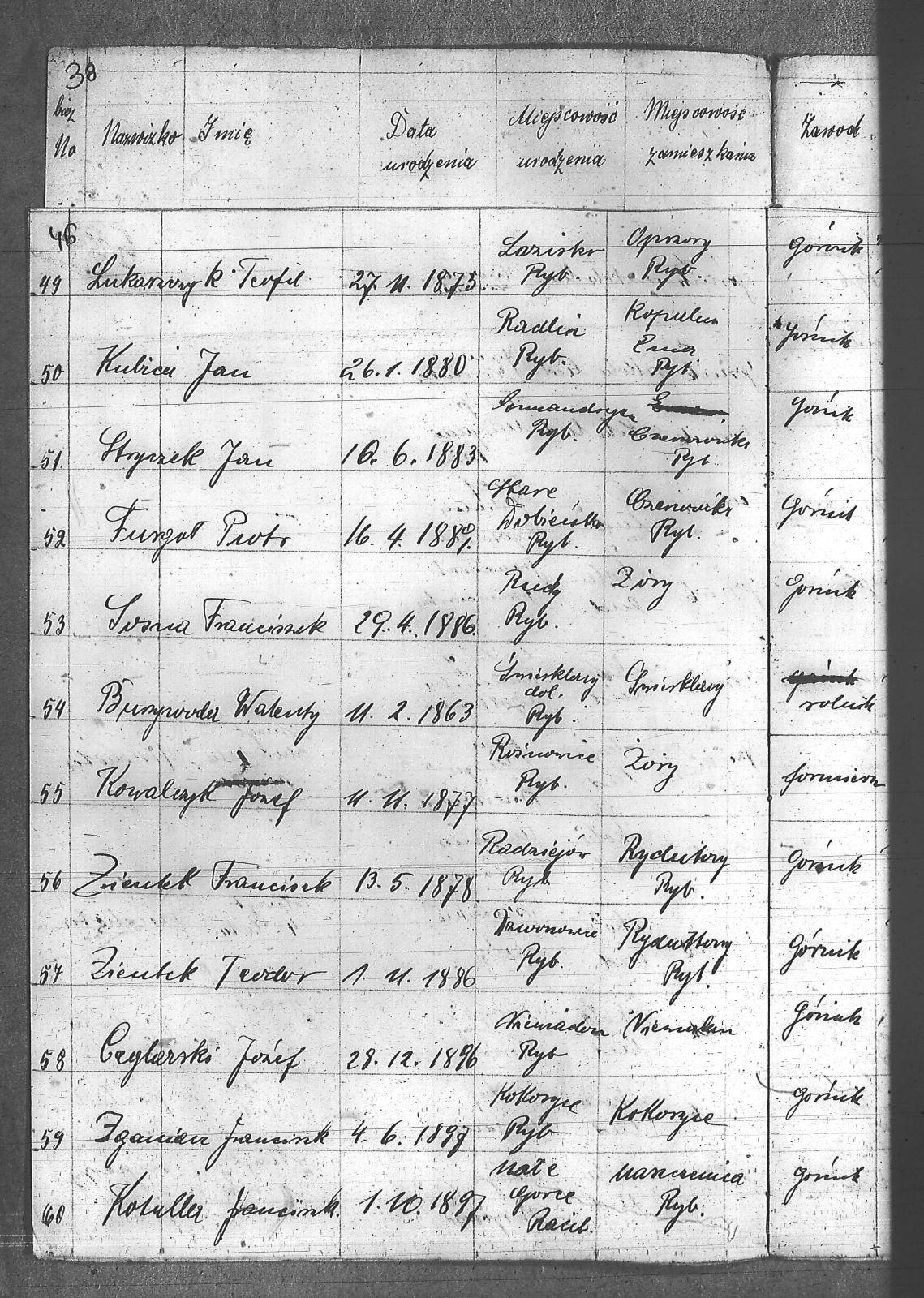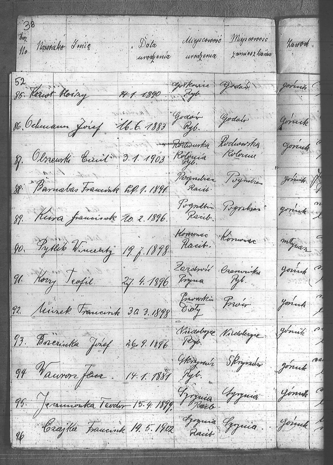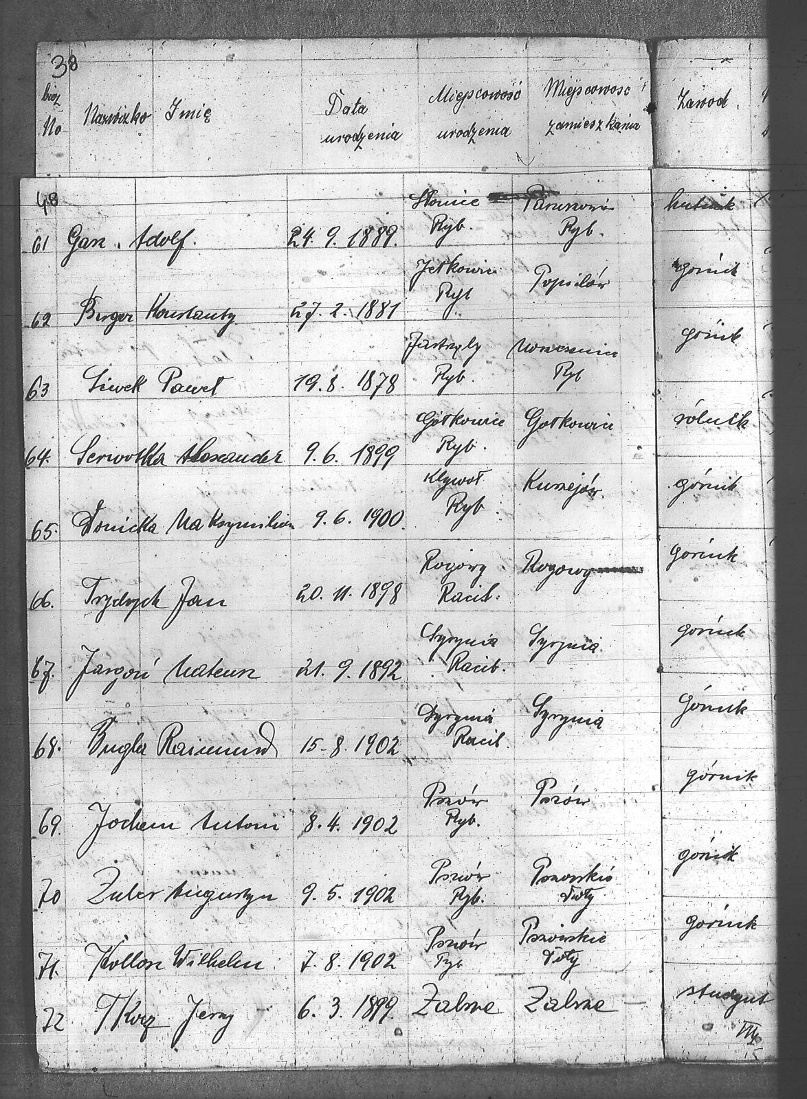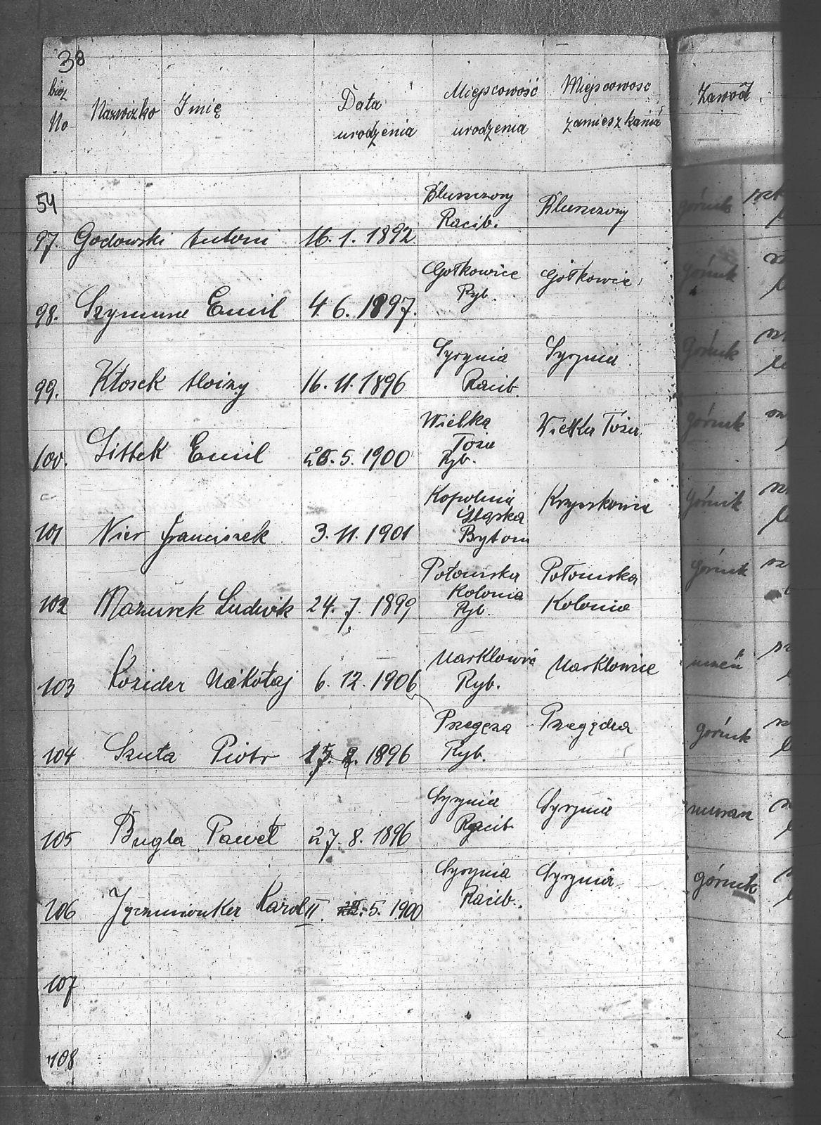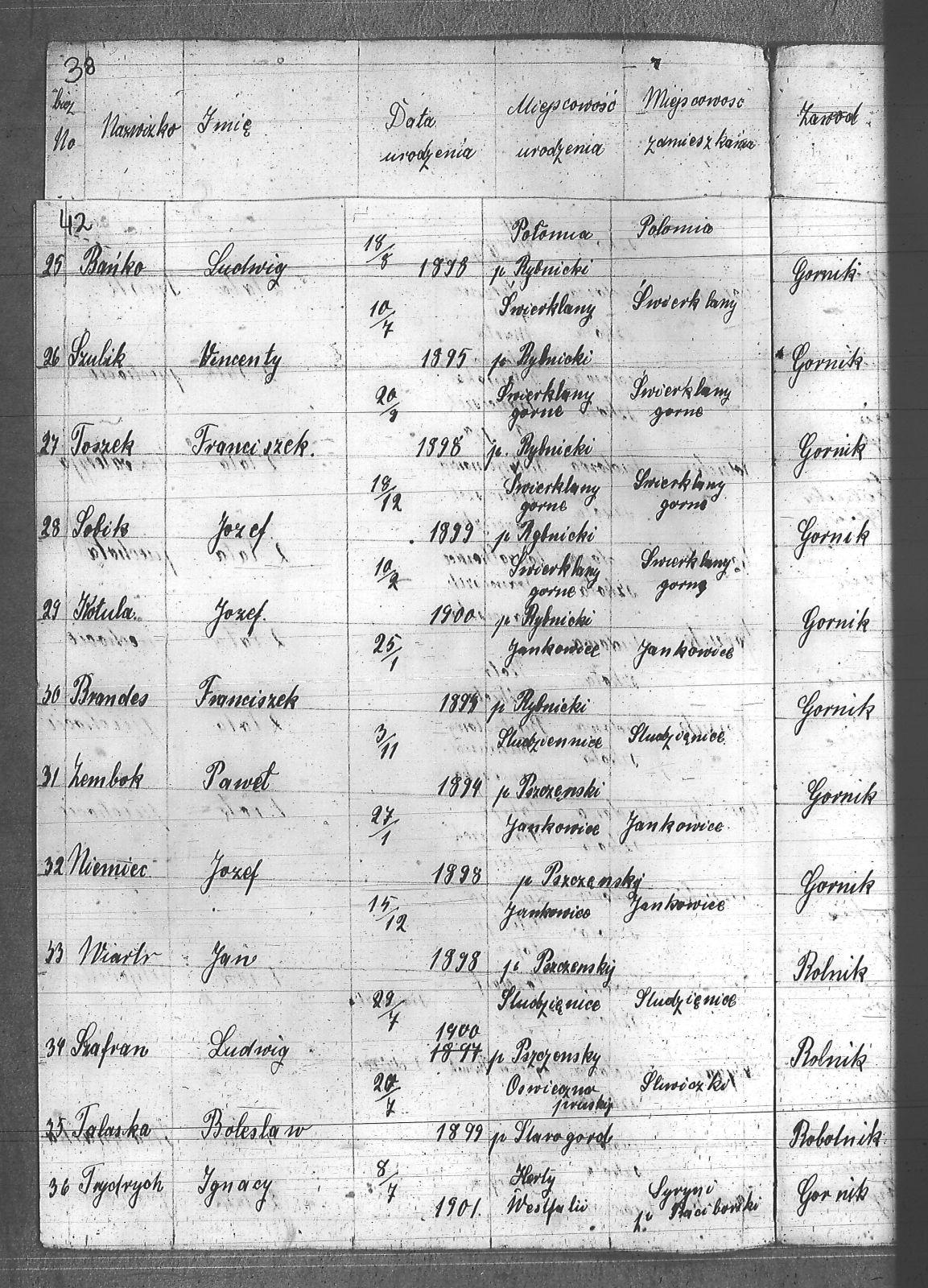 Adamczyk, Jan; Anderski, Karol; Balcar, Józef; Bańko, Ludwik; Barnabas, Franciszek; Berger, Konstanty; Boszczek, Ryszard; Brandes, Franciszek; Brandys, Ludwik; Brzezinka, Józef; Bugla, Konstanty; Bugla, Paweł; Bugla, Rajmund; Burzczyński, Paweł; Burzywoda, Walenty; Ceglarski, Józef; Czajka, Franciszek; Czajka, Paweł; Czajka, Robert; Firut, Józef; Frydrych, Jan; Furgoł, Piotr; Gamrotek, Teodor; Gasz, Adolf; Godowski, Antoni; Grobelny, Alojzy; Jargoń, Mateusz; Jęczmionka, Karol; Jęczmionka, Karol II; Jęczmionka, Teodor; Jochem, Antoni; Kamczyk, Pius; Kania, Alojzy; Kellner, Konrad; Kłosek, Alojzy; Kłosek, Karol; Kłosek, Ludwig; Kłosek, Mateusz; Koczy, Teoofil; Kollorz, Wilhelm; Kotula, Józef; Kotulla, Franciszek; Kowalczyk, Józef; Kozica, Alfred; Kozider, Mikołaj; Kozioł, Alojzy; Krakowczyk, Walenty; Krótki, Leon; Kubica, Jan; Kura, Franciszek; Kuś, Antoni; Kuznik, Alojzy; Łukaszczyk, Teofil; Matuszek, Paweł; Mazurek, Ludwik; Merkuhauser, Karol; Miczek, Franciszek; Niemiec, Józef; Nier, Franciszek; Obracaj, Antoni; Ochmann, Józef; Olszewski, Emil; Piwałek, Franciszek; Pnunowski, Jan; Pytlik, Wincenty; Reś, Konstanty; Serwatka, Aleksander; Sittek, Emil; Siwek, Paweł; Skorupa, Anzelm; Slronczek, Leon; Sobik, Józef; Sobol, Franciszek; Soból, Robert; Sonicka, Maksymilian; Sosna, Franciszek; Sosna, Jan; Stania, Augustyn; Staniczek, Paweł; Stryczek, Jan; Szafran, Ludwik; Szulik, Wincenty; Szuła, Piotr; Szymiczek, Wawrzyn; Szymura, Emil; świerczyna, Aleksander; Talaska, Bolesław; Tkocz, Jerzy; Toszek, Franciszek; Tront, Józef; Trydrych, Ignacy; Vogel, Emanuel; Wala, Dominik; Walenczyk, Roman; Waleńczyk, Roman; Warzeszka, Józef; Wawrorz, Jan; Wiatr, Jan; Wieczorek, Józef; Wilk, Teodor; Wollny, Alojzy; Zembok, Paweł; Zganiacz, Franciszek; Zientek, Franciszek; Zientek, Teodor; Żuler, Augustyn; |