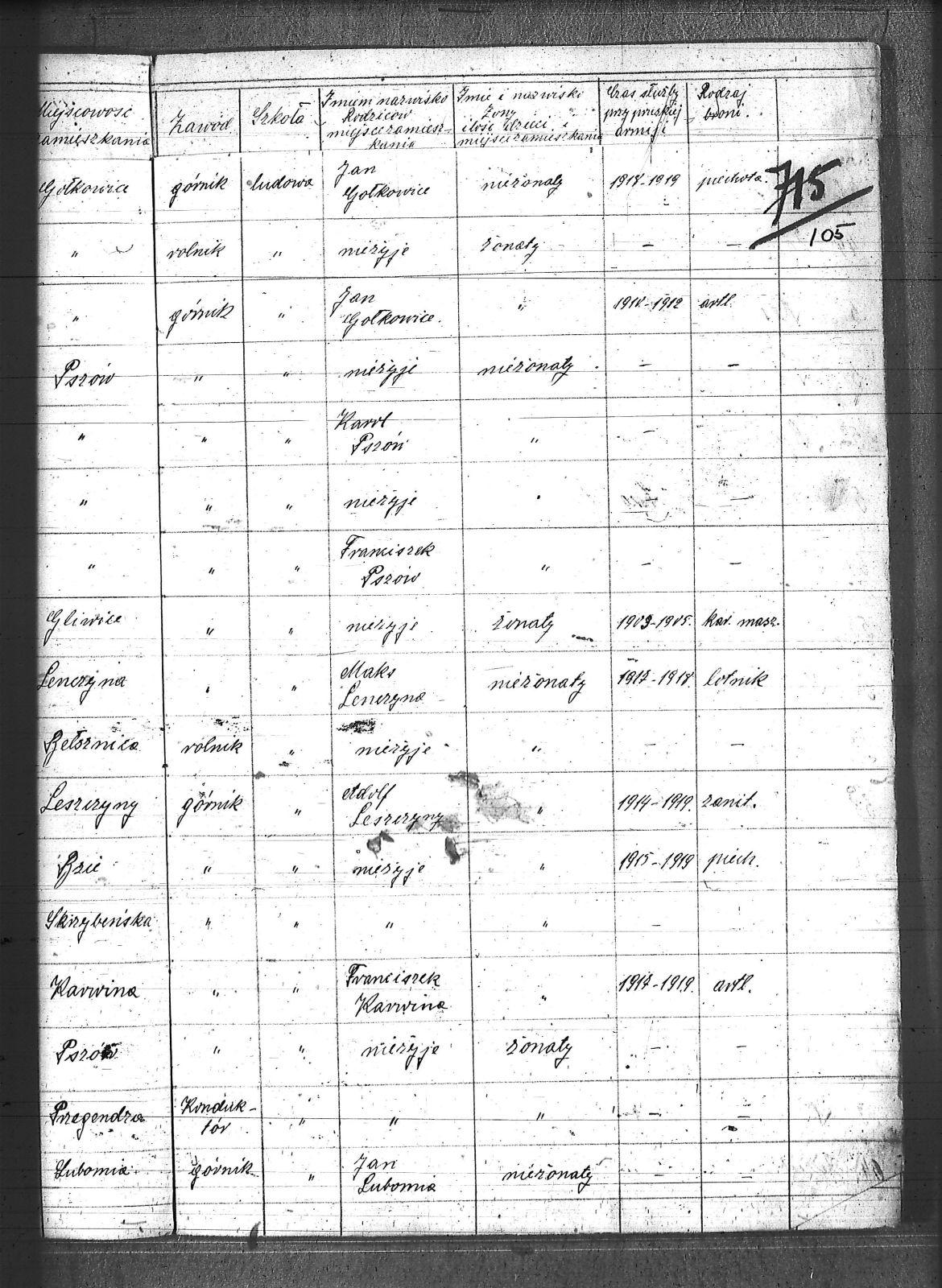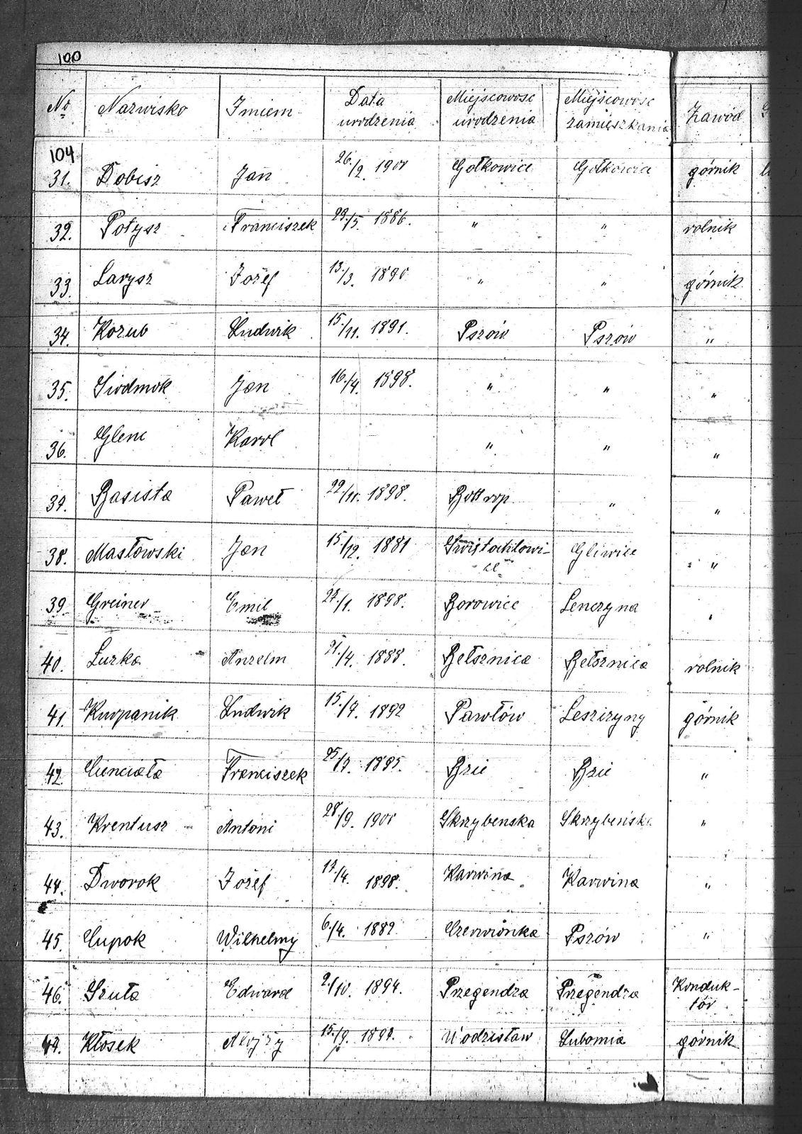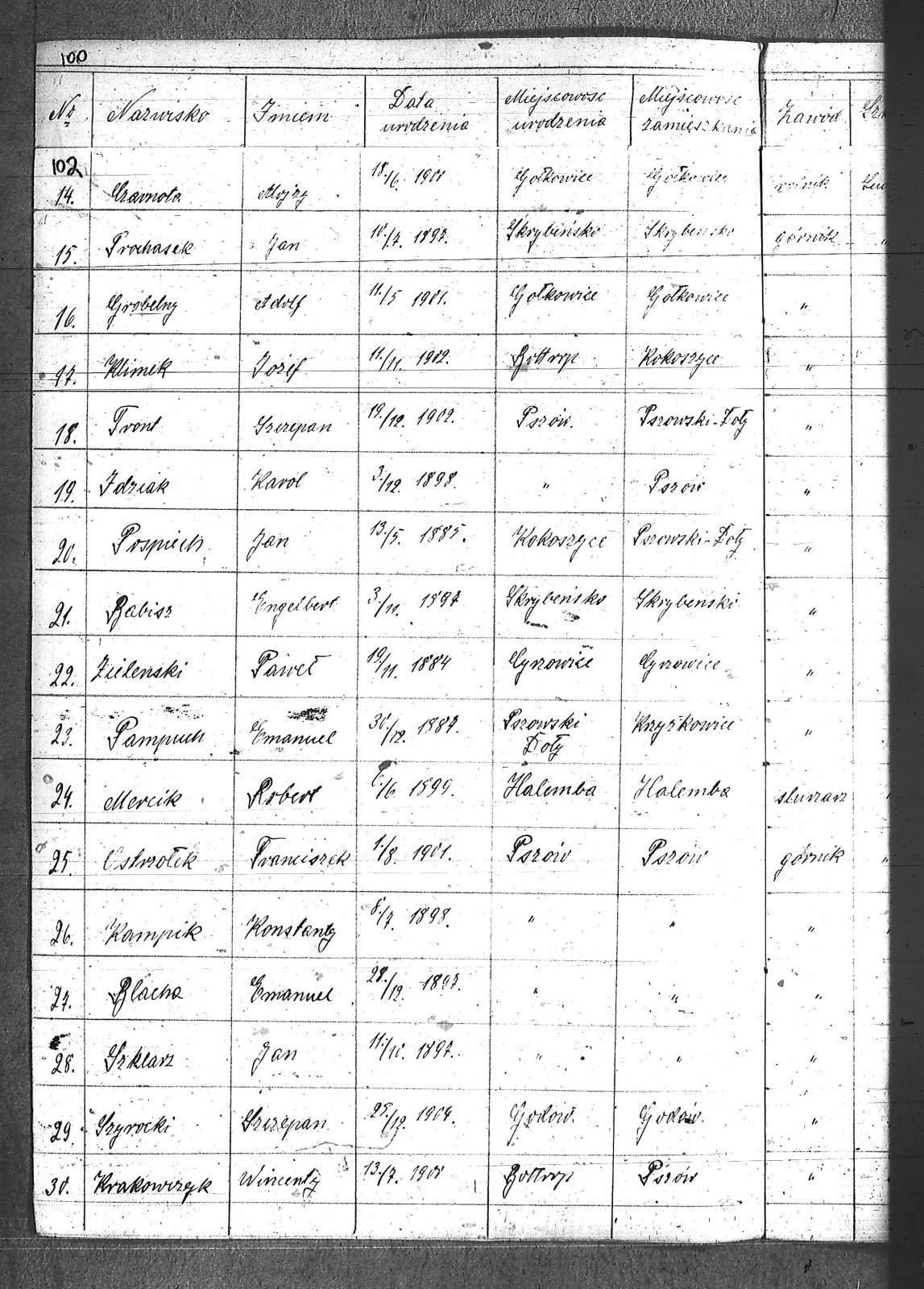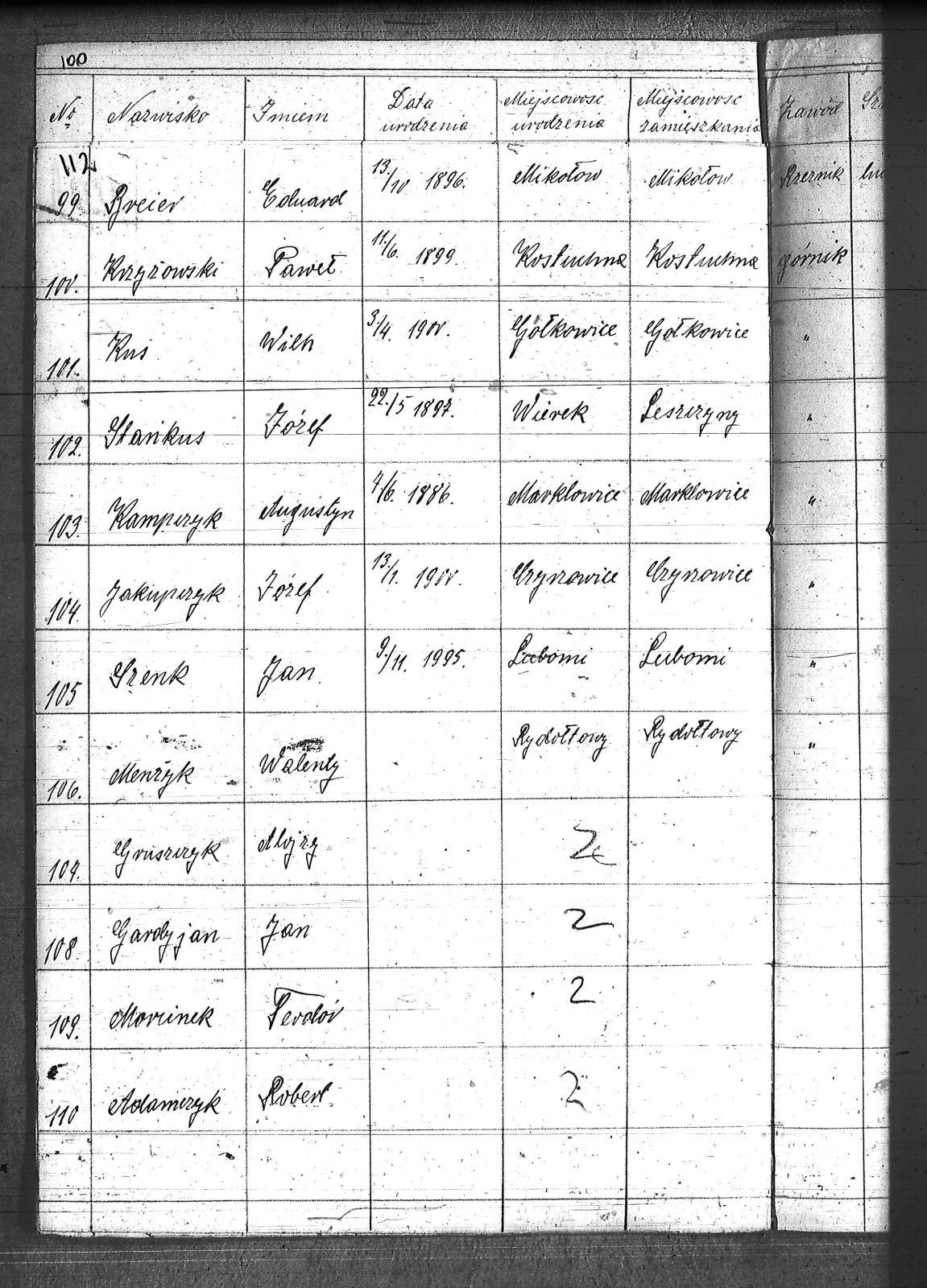 Adamczyk, Robert; Babisz, Engelbert; Basista, Jan; Basista, Paweł; Baszton, Emanuel; Baszton, Józef; Bjałek, Wilhelm; Blacha, Emanuel; Breier, Eduard; Brozek, Teofil; Cienciała, Franciszek; Cupok, Wilhelmy; Czarnota, Alojzy; Czernik, Alojzy; Dobisz, Jan; Dworok, Józef; Fojcik, Maks; Front, Paweł; Front, Szczepan; Gardyjan, Jan; Glenc, Karol; Głąbica, Franciszek; Goralczyk, Florian; Greiner, Emil; Grobelny, Adolf; Gruszczyk, Alojzy; Herman, Henryk; Hornik, Józef; Idziak, Karol; Iksel, Maksymilian; Jabłonka, Jakób; Jakupczyk, Józef; Kabut, Franciszek; Kampczyk, Augustyn; Kampik, Konstanty; Kiełkowski, Andrzej; Klimanek, Józef; Klimek, Józef; Klinik, Augustyn; Kłosek, Alojzy; Koczór, Wiktor; Kopieć, Walenty; Kozub, Ludwik; Krakowczyk, Wincenty; Krentusz, Antoni; Krzyżowski, Franciszek; Krzyżowski, Paweł; Krzyżyk, Franciszek; Krzyżyk, Jan; Kurpanik, Ludwik; Kustos, Mikołaj; Kuś, Wilhelm; Kwiatoń, Michał; Larysz, Adolf; Larysz, Józef; Łaciok, Wiktor; Łuzka, Anzelm; Majwald, Alojzy; Marcol, Alojzy; Masłowski, Jan; Matuszczyk, Alojzy; Menżyk, Walenty; Mercik, Robert; Minol, Franciszek; Mitko, Antoni; Moczka, Tomasz; Morcinek, Teodor; Musioł, Teofil; Nachtigal, Antoni; Nawrat, Robert; Nawrot, Józef; Nogły, Franciszek; Nogły, Frytc; Noras, Paweł; Oleś, Franciszek; Ostrzołek, Franciszek; Paloc, Stanisław; Pampuch, Emanuel; Piontek, Herman; Połap, Jan; Pośpiech, Jan; Potop, Józef; Potysz, Franciszek; Powieczka, Alfryd; Powieczka, Franciszek; Powieczka, Teofil; Prochasek, Jan; Reś, Wiktor; Salamon, Jan; Siodmok, Jan; Skupnik, Edward; Spojda, Alojzy; Stacha, Ignacy; Strańkus, Józef; Szenk, Jan; Szindler, Józef; Szkatuła, Franciszek; Szkatuła, Jan; Szklarz, Franciszek; Szklarz, Jan; Szołtysek, Leopold; Szuła, Edward; Szyrocki, Szczepan; Tytko, Paweł; Wańczura, Jerzy; Zdziebło, Wiktor; Zernik, Karol; Zganiacz, Wilhelm; Zielenski, Paweł; Żmuda, Franciszek; |