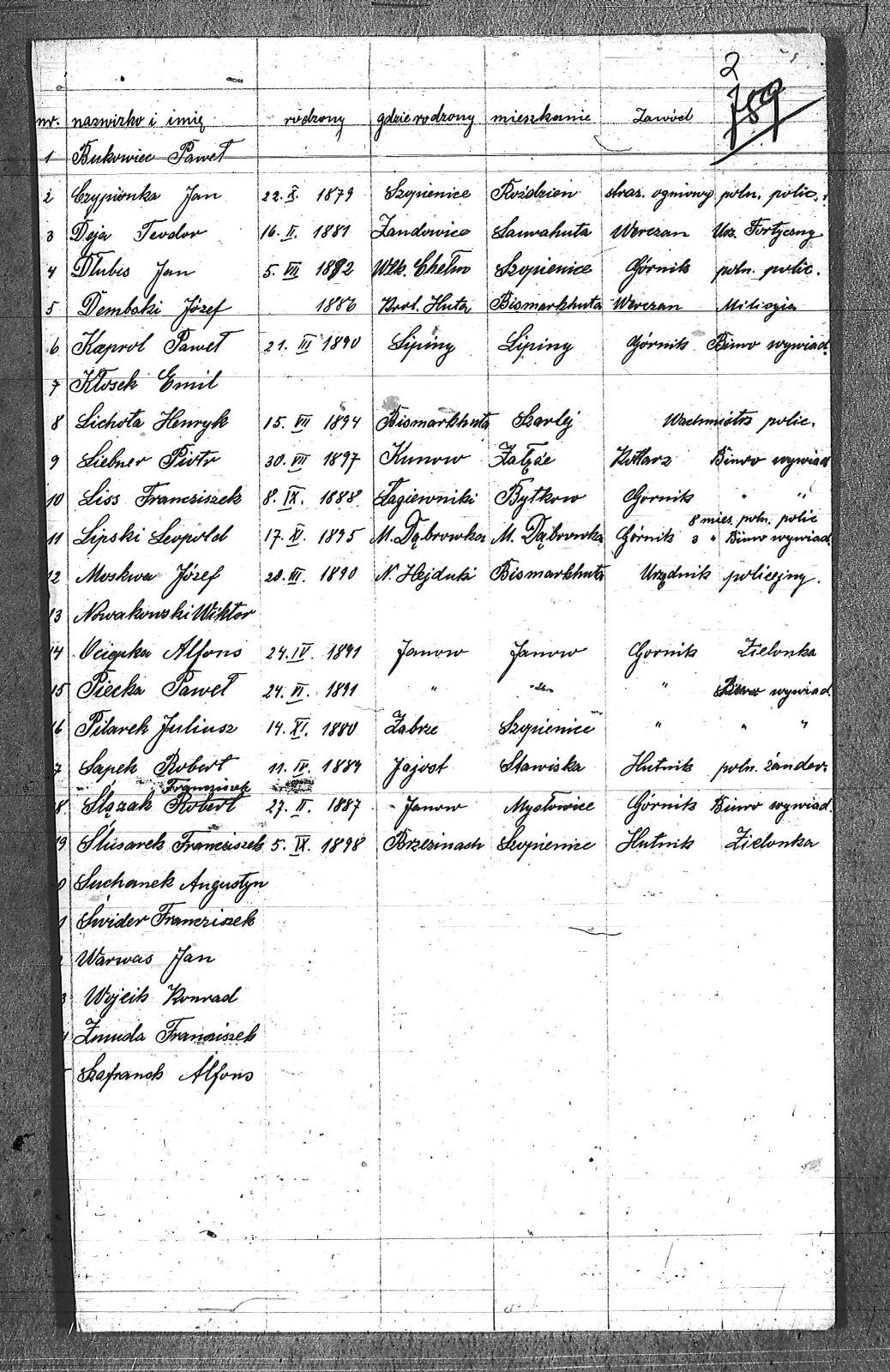 | Osoby | Bukowiec, Paweł; Czypionka, Jan; Deja, Teodor; Dembski, Józef; Dłubis, Jan; Kaprol, Paweł; Kłosek, Emil; Lichota, Henryk; Liebner, Piotr; Lipski, Leopold; Liss, Franciszek; Moskwa, Józef; Nowakowski, Wiktor; Ociepka, Alfons; Piecka, Paweł; Pilarek, Juliusz; Sapek, Robert; Suchanek, Augustyn; Szafranek, Alfons; Ślązak, Franciszek; Ślusarek, Franciszek; Świder, Franciszek; Warwas, Jan; Wójcik, Konrad; Zmuda, Franciszek; |