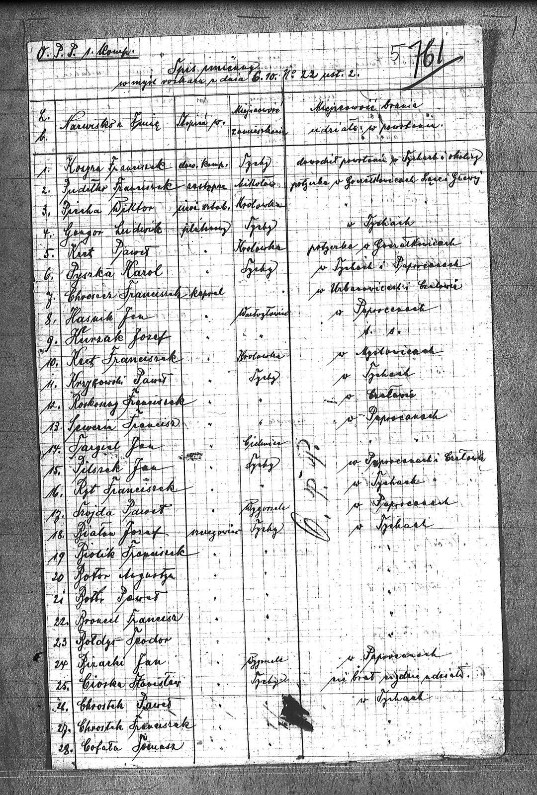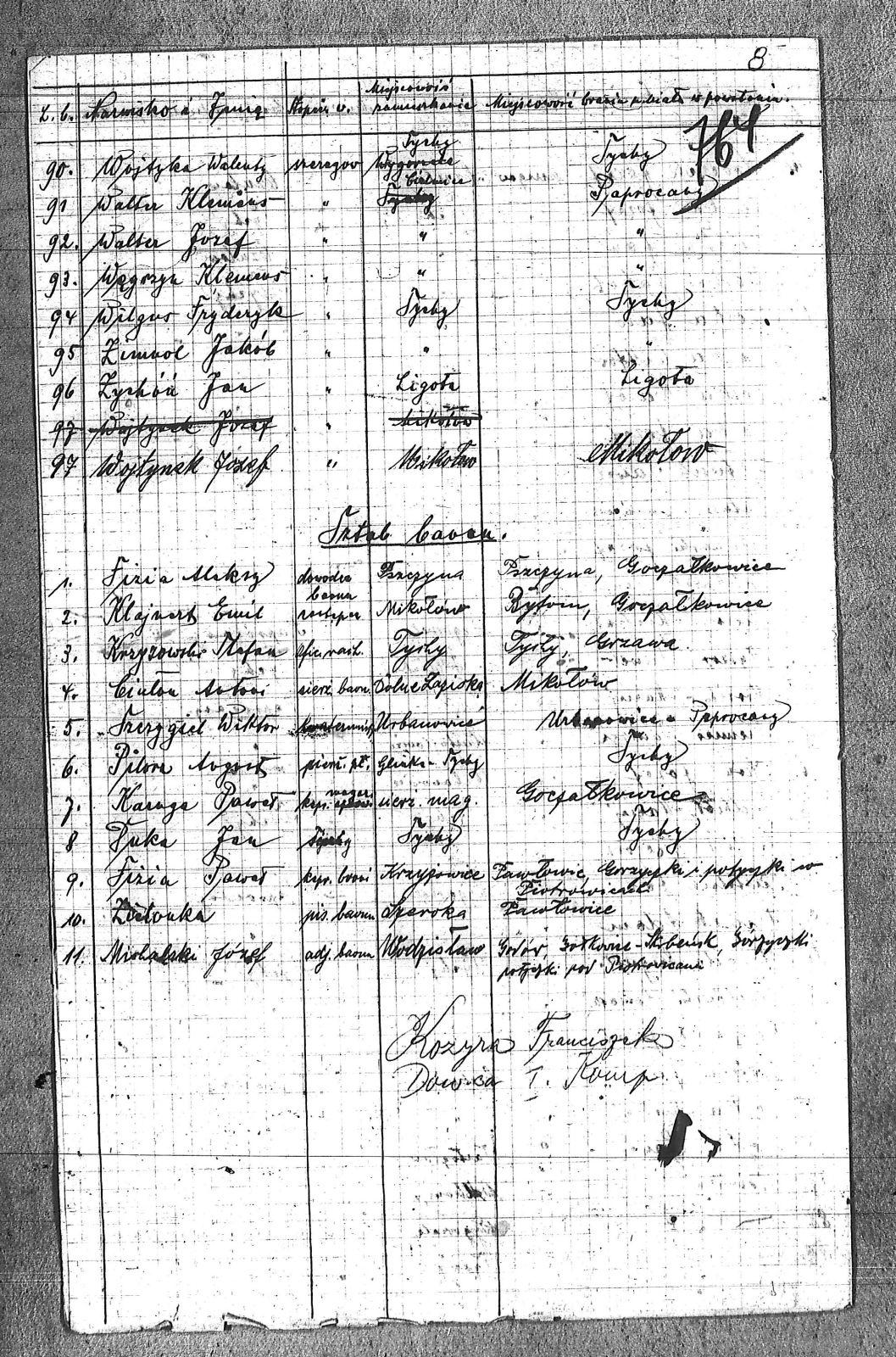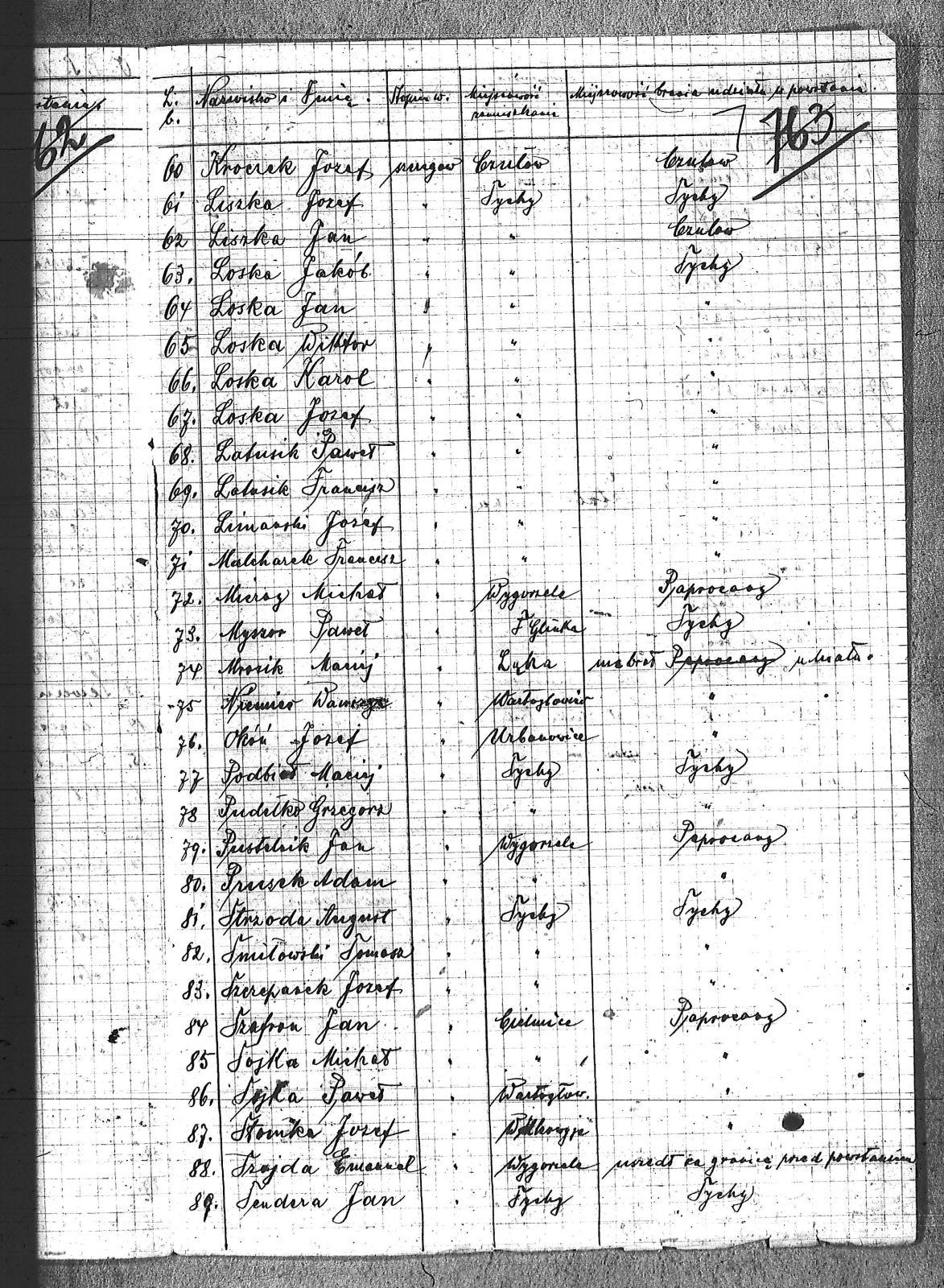 Białon, Józef; Biolik, Franciszek; Bizacki, Jan; Bołdys, Teodor; Botor, Augustyn; Botor, Paweł; Broncel, Franciszek; Chrostek, Franciszek; Chrostek, Paweł; Chroszcz, Franciszek; Chwalczyk, Jan; Ciałoń, Antoni; Cioska, Stanisław; Cipa, Franciszek; Ciwis, Jakub; Cofała, Tomasz; Czech, Franciszek; Czempas, Jan; Duda, Paweł; Dzida, Jan; Dziubany, Paweł; Filak, Augustyn; Filak, Ludwik; Fioł, Franciszek; Fizia, Aleksy; Fizia, Paweł; Gołosz, Jakub; Gołosz, Jan; Gongor, Ludwik; Goralczyk, Maciej; Grajcarek, Adolf; Hasnik, Jan; Haśnik, Józef; Jakobiec, Karol; Jandrysik, Walenty; Janik, Jan; Jasiek, Stanisław; Kapias, Franciszek; Karuga, Paweł; Klachacz, Paweł; Klajnert, Emil; Kołodziej, Wojciech; Kost, Józef; Kozyra, Franciszek; Kozyra, Klemens; Kral, Augustyn; Kret, Franciszek; Kret, Paweł; Kroczek, Józef; Krzyżowski, Jan; Krzyżowski, Konrad; Krzyżowski, Ludwik; Krzyżowski, Paweł; Krzyżowski, Stefan; Kurpas, Teodor; Kurzak, Augustyn; Kurzak, Józef; Latusik, Franciszek; Latusik, Paweł; Limanski, Józef; Liszka, Jan; Liszka, Józef; Loska, Jakub; Loska, Jan; Loska, Józef; Loska, Karol; Loska, Wiktor; Malchasek, Franciszek; Michalski, Józef; Miczaj, Michał; Mrozik, Maciej; Myszor, Paweł; Niemiec, Wawrzyn; Okoń, Józef; Piecha, Wiktor; Pilora, August; Pilszek, Jan; Podbioł, Maciej; Prusek, Adam; Pudełko, Franciszek; Pudełko, Grzegorz; Puka, Jan; Pustelnik, Jan; Pyszka, Karol; Roskoszny, Franciszek; Ryt, Franciszek; Sendera, Jan; Seweria, Franciszek; Sojka, Michał; Sojka, Paweł; Stomka, Józef; Strzoda, August; Szafran, Jan; Szczepanek, Józef; Szczygieł, Wiktor; Szojda, Emanuel; Szojda, Paweł; Śmiałowski, Tomasz; Targiel, Jan; Walta, Józef; Walta, Klemens; Węgrzyk, Klemens; Wilgus, Fryderyk; Wojtyka, Walenty; Wojtynek, Józef; Zielonka; Zimnol, Jakub; Zychoń, Jan; |
