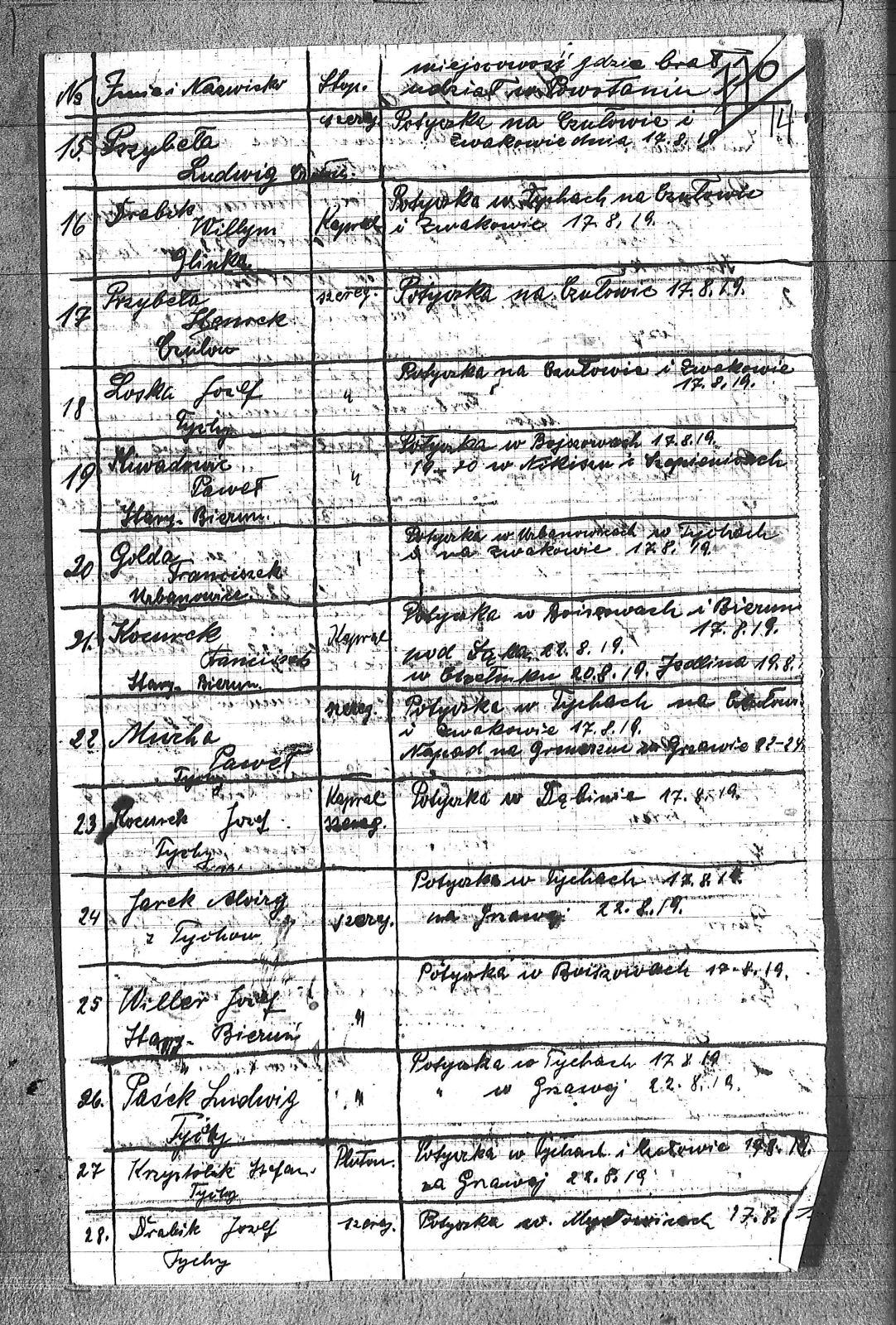 | Osoby | Baron, Jan; Baron, Teodor; Bialik, Józef; Bielas, Wilym; Brzęk, Ludwik; Drabik, Józef; Drabik, Wilym; Duda, Franciszek; Fray, Alojzy; Golda, Franciszek; Grzesica, Józef; Jagoda, Józef; Jarek, Alojzy; Kiwadowic, Paweł; Kocurek, Franciszek; Kocurek, Józef; Koczy, Wojciech; Kostyra, Jakób; Krzystolik, Stefan; Letey, Józef; Loska, Józef; Mucha, Paweł; Pasek, Ludwik; Przybeła, Henryk; Przybeła, Ludwik; Pucher, Józef; Sojka, Pawel; Willer, Józef; |