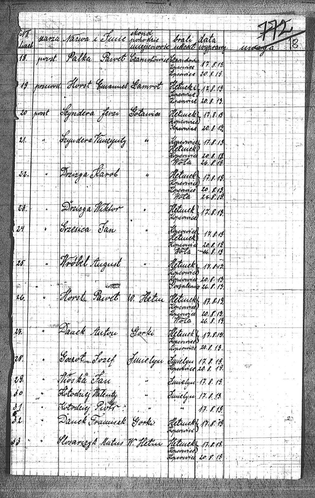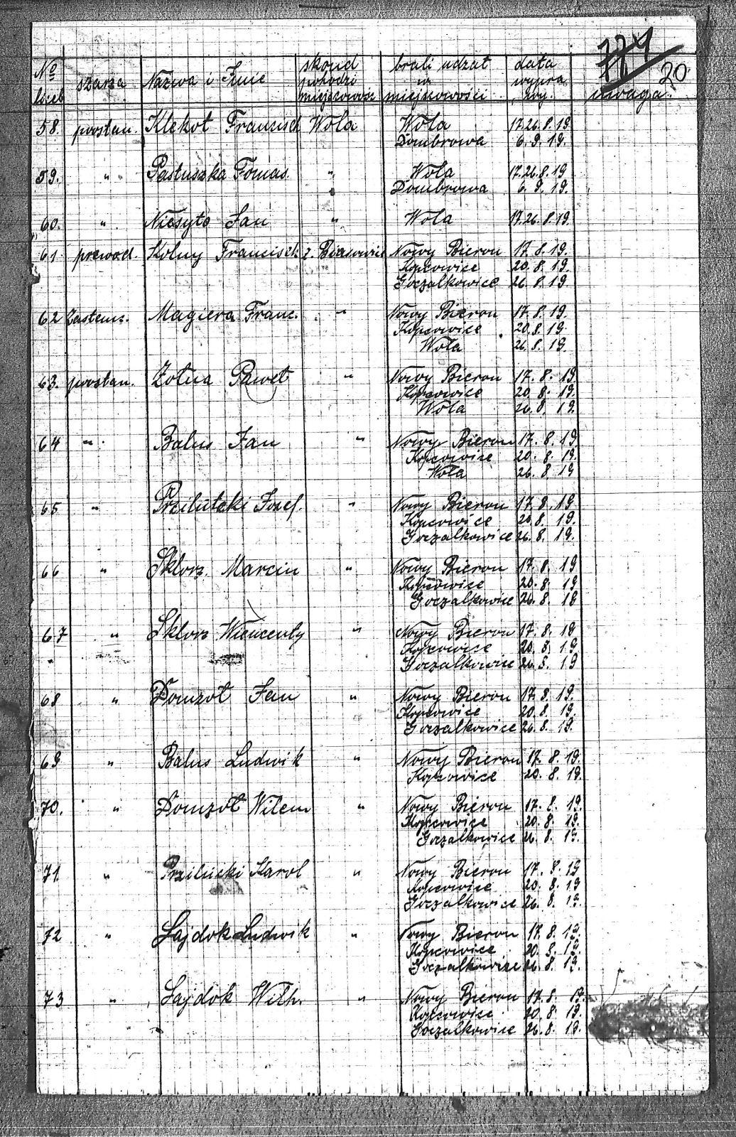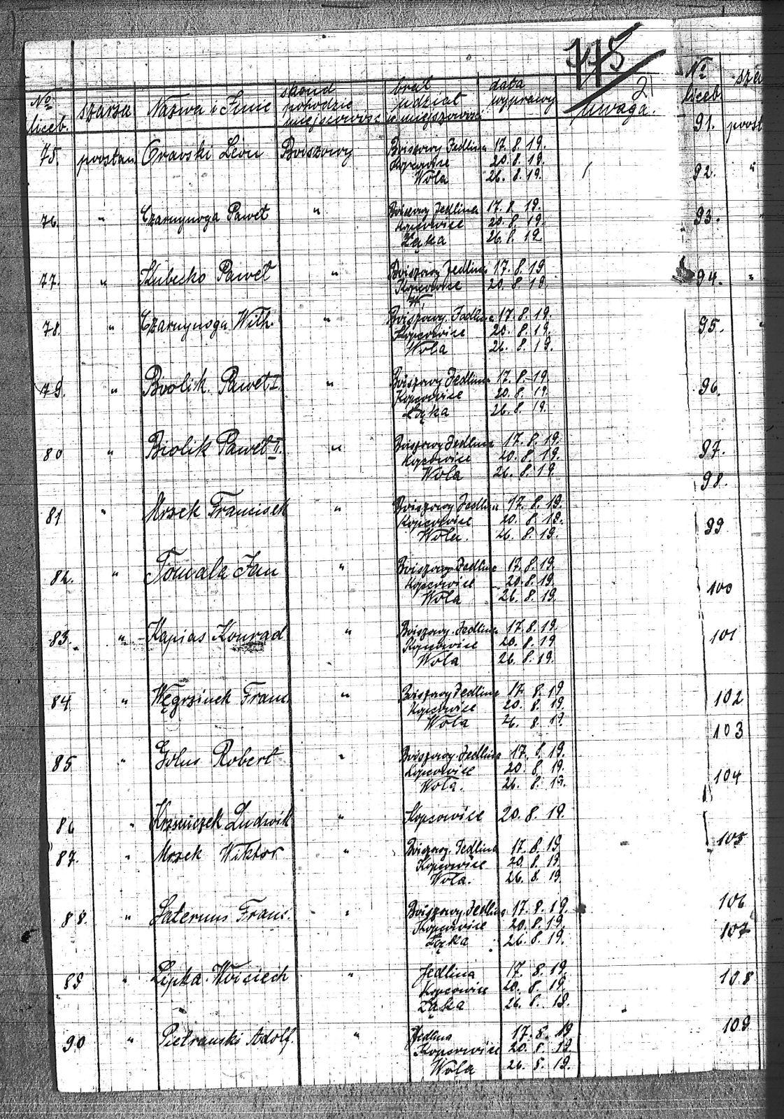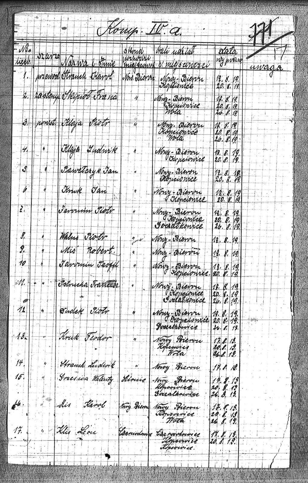 [Przilucki], Karol; Anderwald, Franciszek; Balus, Jan; Balus, Ludwik; Bielanin, Jan; Biolik, Paweł I; Biolik, Paweł II; Bock, Paweł; Borys, Michał; Borys, Paweł; Bronzel, Tomasz; Czarnynoga, Paweł; Czarnynoga, Wilhelm; Danek, Antoni; Danek, Franciszek; Domzoł, Jan; Domzoł, Wilem; Drzizga, Karol; Drzizga, Kazimierz; Drzizga, Wiktor; Dudek, Piotr; Friek, Jan; Gawełczyk, Paweł; Goczoł, Józef; Golus, Robert; Grabowski, Tomasz; Grenatyr, Emanuel; Grzesica, Jan; Grzesica, Walenty; Horst, Emanuel; Horst, Paweł; Jaromin, Piotr; Jaromin, Teofil; Jęczmyk, Jan; Kapias, Konrad; Klaja, Ludwik; Klaja, Piotr; Klekot, Franciszek; Klekot, Józef; Klenczar, Józef; Klis, Leon; Kolny, Franciszek; Kołodziej, Piotr; Kołodziej, Walenty; Kruk, Jan; Kruk, Teodor; Krzikowski, Franciszek; Krzseńczek, Ludwik; Kubecko, Franciszek; Kubecko, Paweł; Kubećko I, Jan; Kubećko II, Jan; Lipka, Wojciech; Lubowieczki, Paweł II; Magiera, Franciszek; Majerczyk, Franciszek; Mika, Józef; Miś, Karol; Miś, Robert; Mrzek, Franciszek; Mrzek, Wiktor; Musioł, Marcin; Musioł, Paweł; Mysior, Franciszek; Niesyto, Jan; Niesyto, Władysław; Noga, Józef; Noras, August; Ochot, Ludwik; Odrobinski, Franciszek; Opitek, Wincenty; Orawski, Leon; Palka, Paweł; Pastuszka, Franciszek; Pastuszka, Józef; Pastuszka, Tomasz; Pawełczyk, Jan; Pawełko, Franciszek; Piekorz, Wiktor; Pietrański, Adolf; Przylutcki, Józef; Pstrucha, Franciszek; Rogalski, Alojzy; Sajdok, Ludwik; Sajdok, Wilhelm; Saternus, Franciszek; Skipioł, Franciszek; Sklorz, Marcin; Sklorz, Wincenty; Slosarczyk, Jan; Slosarczyk, Mateusz; Slosarczyk, Piotr; Solarczyk, Józef; Sromczyk, Władysław; Stachura, Józef; Stranek, Karol; Strauch, Ludwik; Szander, Wiktor; Szyndera, Jerzy; Szyndera, Wincenty; Tomala, Franciszek; Tomala, Jan; Walus, Piotr; Węgrzinek, Franciszek; Wioska, Jan; Woicik, Tomasz; Wojciech, Ludwik; Wróbel, August; Żołna, Paweł; |