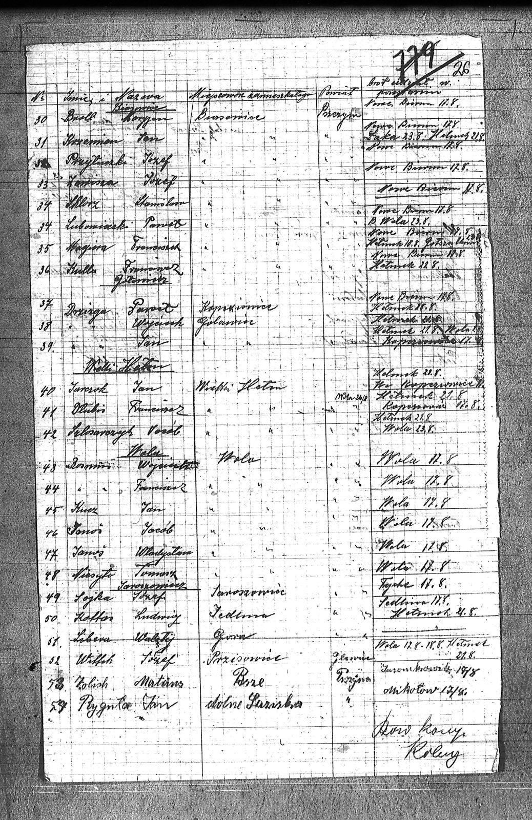 [Rosmm], Franciszek; [Rosmm], Wojciech; Bogacz, Józef; Brol, Marian; Czarnynoga, Antoni; Czarnynoga, Augustyn; Czarnynoga, Paweł; Dłubis, Franciszek; Drozdz, Ignacy; Drzizga, Jan; Drzizga, Paweł; Drzizga, Wojciech; Grabowski, Józef; Gwordz, Józef; Hachuła, Alojse; Hachuła, Paweł; Janos, Jakub; Janos, Władysław; Jaromin, Jan; Jaromin, Klemens; Jatowiczki, Kondrad; Jurczok, Jan; Kaczuba, Józef; Kliś, Aleksander; Kottas, Ludwig; Kruck, Walenty; Krzemion, Jan; Krzikowski, Jan; Kucz, Jan; Kulla, Franciszek; Ledwig, Karol; Lubowieczki, Paweł; Lysko, Paweł; Magiera, Franciszek; Mandrella, Stanisław; Miś, Paweł; Niesyto, Tomasz; Palla, Jakub; Piekorz, Augustyn; Piekorz, Karol; Przyłuczki, Józef; Rygtła, Jan; Sklorz, Stanisław; Sojka, Józef; Stalmach, Wojciech; Szlosarczyk, Jakub; Waksyl, Jakub; Wengrzinek, Wojciech; Wittch, Józef; Włodarczyk, Walenty; Wojczik, Tomasz; Zawisza, Józef; Zimnol, Paweł; Zolish, Mateusz; |