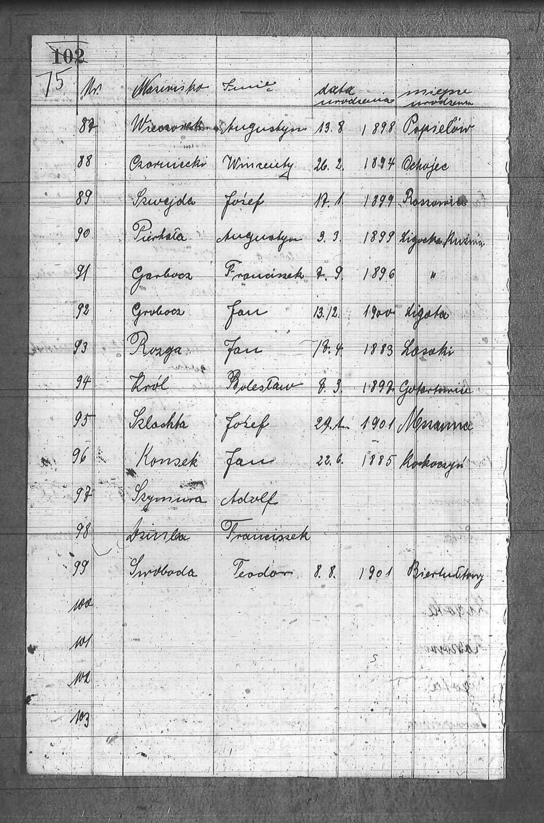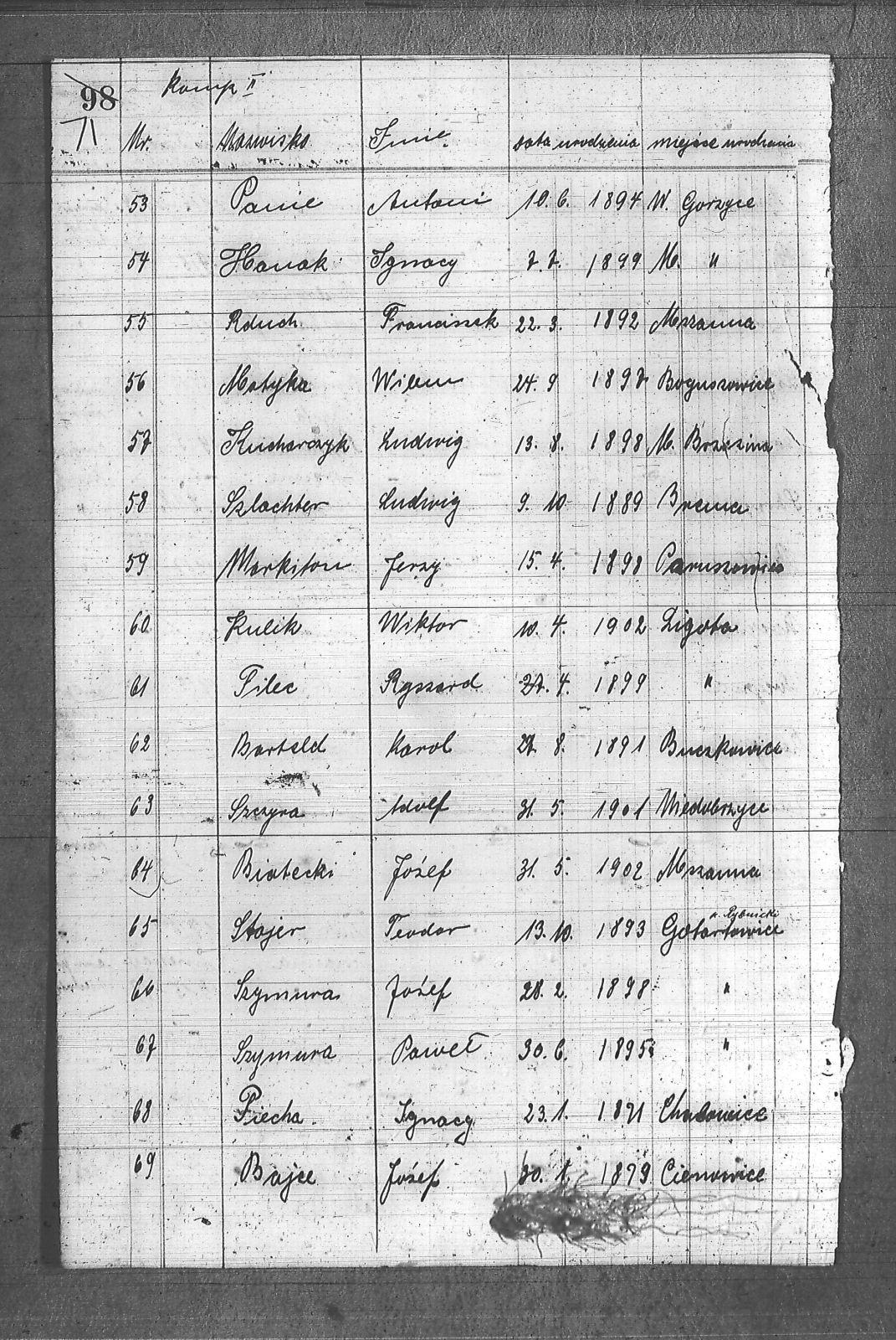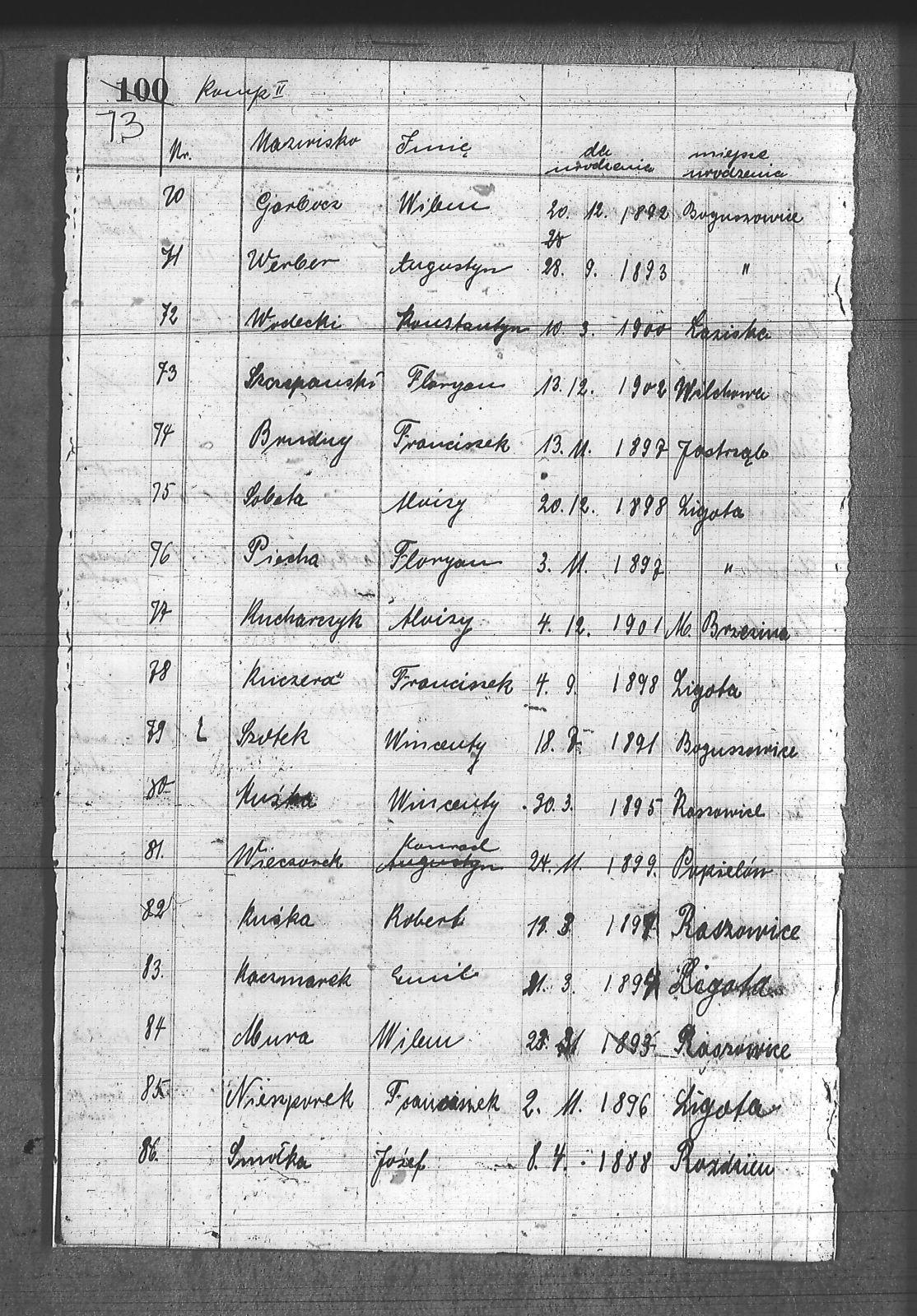 Antoniczyk, Aleksander; Babilas, Aloizy; Bajec, Józef; Banerek, Jan; Barteld, Karol; Biatecki, Józef; Bochynek, Aloizy; Brudny, Franciszek; Bytomski, Paweł; Ciemięga, Sylwester; Czarniecki, Wincenty; Czech, Jan; Daniel, Franciszek; Dziuba, Franciszek; Filec, Ryszard; Garbacz, Fryderyk; Garbocz, Franciszek; Garbocz, Jan; Garbocz, Wilem; Gonsior, Józef; Grabka, Aloizy; Greger, Karol; Gruszka, Henryk; Hanok, Ignacy; Jurczyk, Aloizy; Kaczmarek, Emil; Klimsza, Antoni; Konsek, Jan; Król, Bolesław; Kucharczyk, Aloizy; Kucharczyk, Ludwig; Kuczera, Franciszek; Kulik, Wiktor; Kuśka, Gerhard; Kuśka, Karol; Kuśka, Robert; Kuśka, Wincenty; Marek, Aloizy; Markieton, Jerzy; Matera, Ludwig; Matuszczyk, Maksymilian; Młynek, Franciszek; Młynek, Paweł; Motyka, Wilem; Motyka, Wincenty; Mrozek, Ludwig; Mura, Wilem; Nieszporek, Franciszek; Ochojski, Paweł; Oślislok, Aloizy; Panic, Antoni; Penkala, Aloizy; Piecha, Antoni; Piecha, Florian; Piecha, Ignacy; Pierkała, Augustyn; Pompa, Teofil; Pyszny, Paweł; Rduch, Franciszek; Rduch, Teodor; Rduch, Wilem; Romański, Jan; Rozga, Jan; Różański, Dominik; Skrzyszowski, Ferdynand; Smołka, Józef; Smuda, Klemens; Sobota, Aloizy; Spandel, Paweł; Stancel, Antoni; Stojer, Teodor; Strzelec, Paweł; Swoboda, Ludwig; Swoboda, Teodor; Szczepański, Florian; Szczyra, Adolf; Szczyrba, Franciszek; Szlachta, Józef; Szlachta, Wilem; Szlachter, Ludwig; Szotek, Wincenty; Szwejda, Józef; Szymala, Emanuel; Szymera, Emil; Szymura, Adolf; Szymura, Józef; Szymura, Paweł; Werber, Augustyn; Wiaterek, Aloizy; Wieczorek, Augustyn; Wieczorek, Konrad; Wodecki, Jan; Wodecki, Konstantyn; Wojak, Augustyn; Wola, Czesław; Wola, Stanisław; Zdrzatek, Wilhelm; |