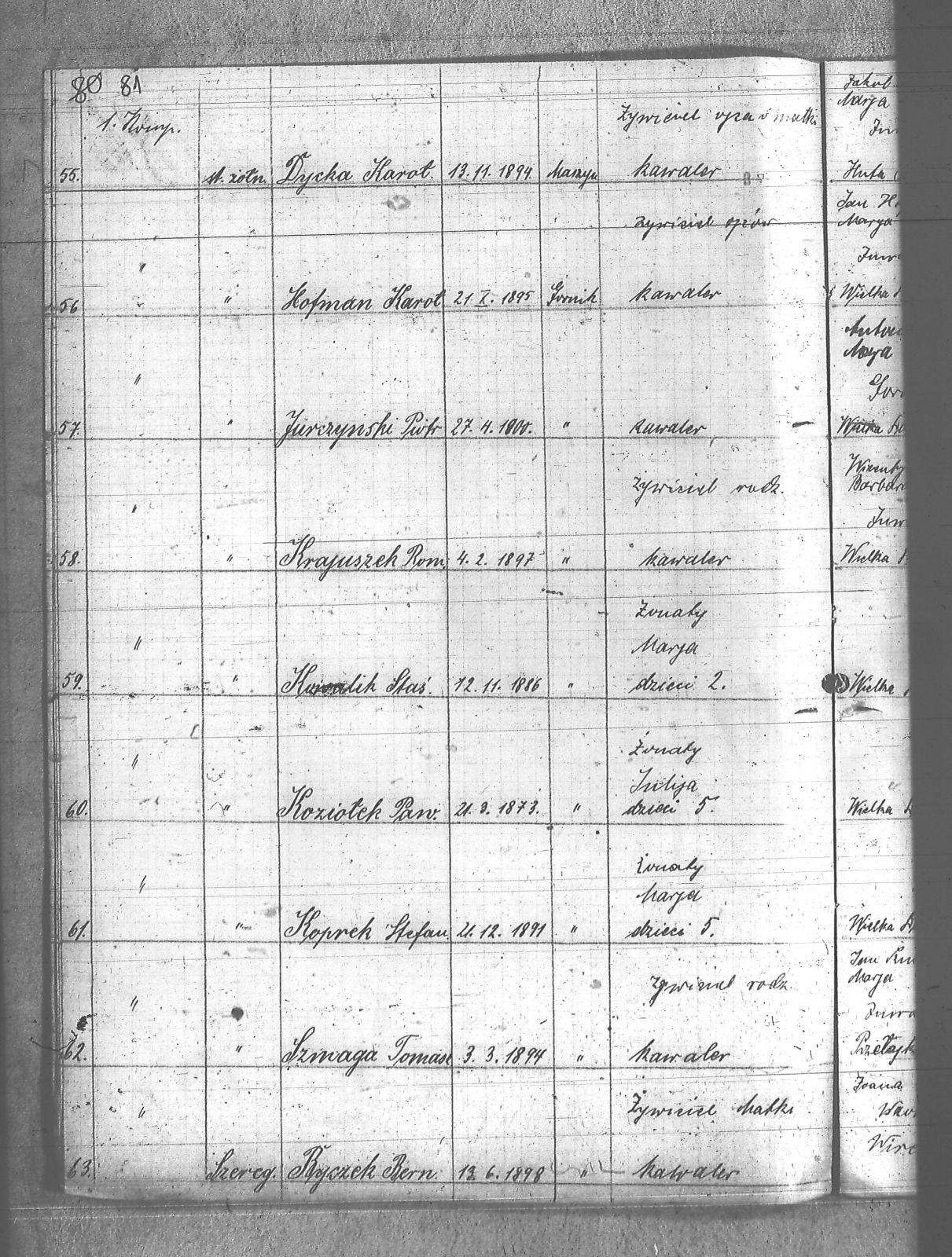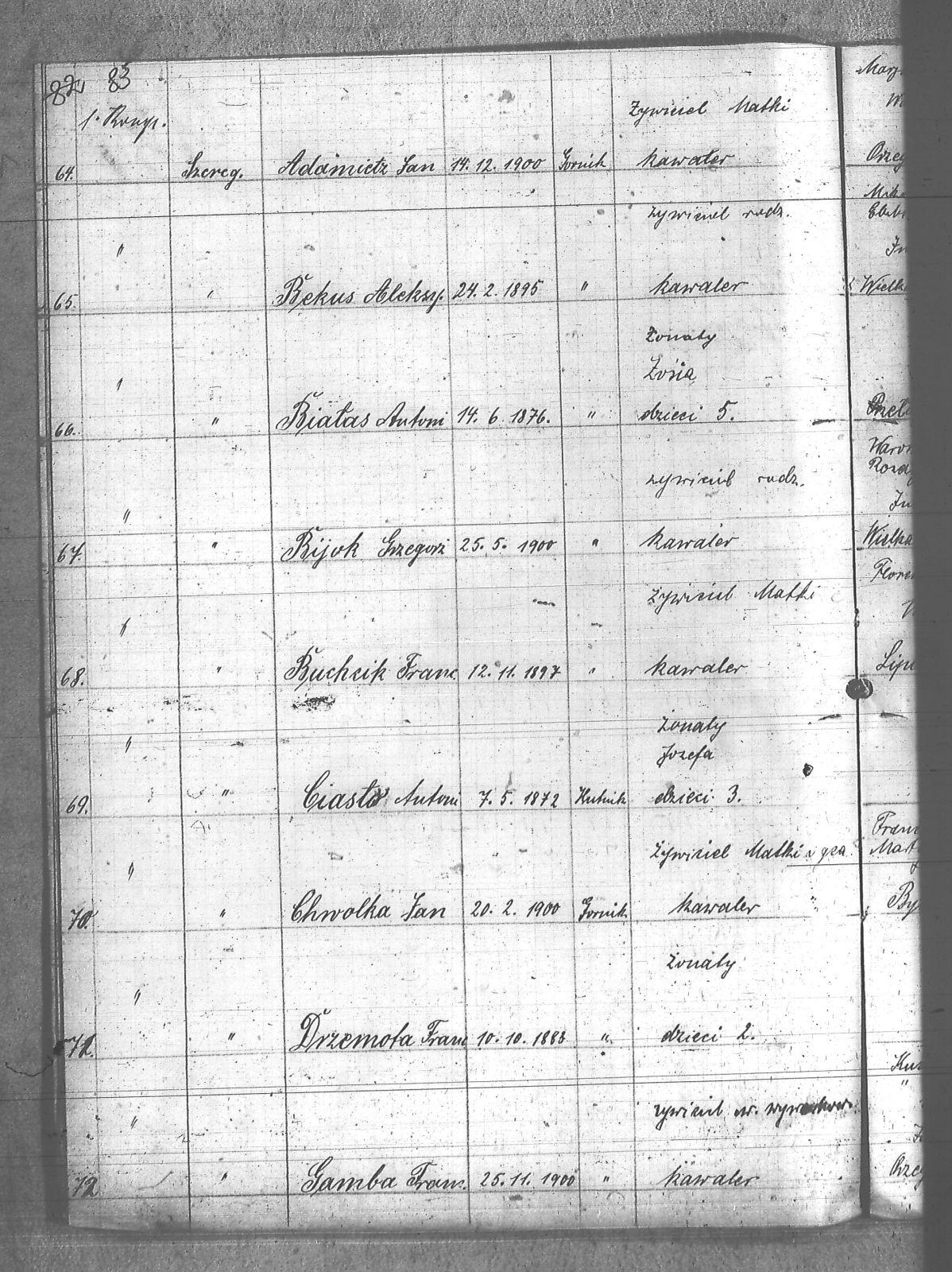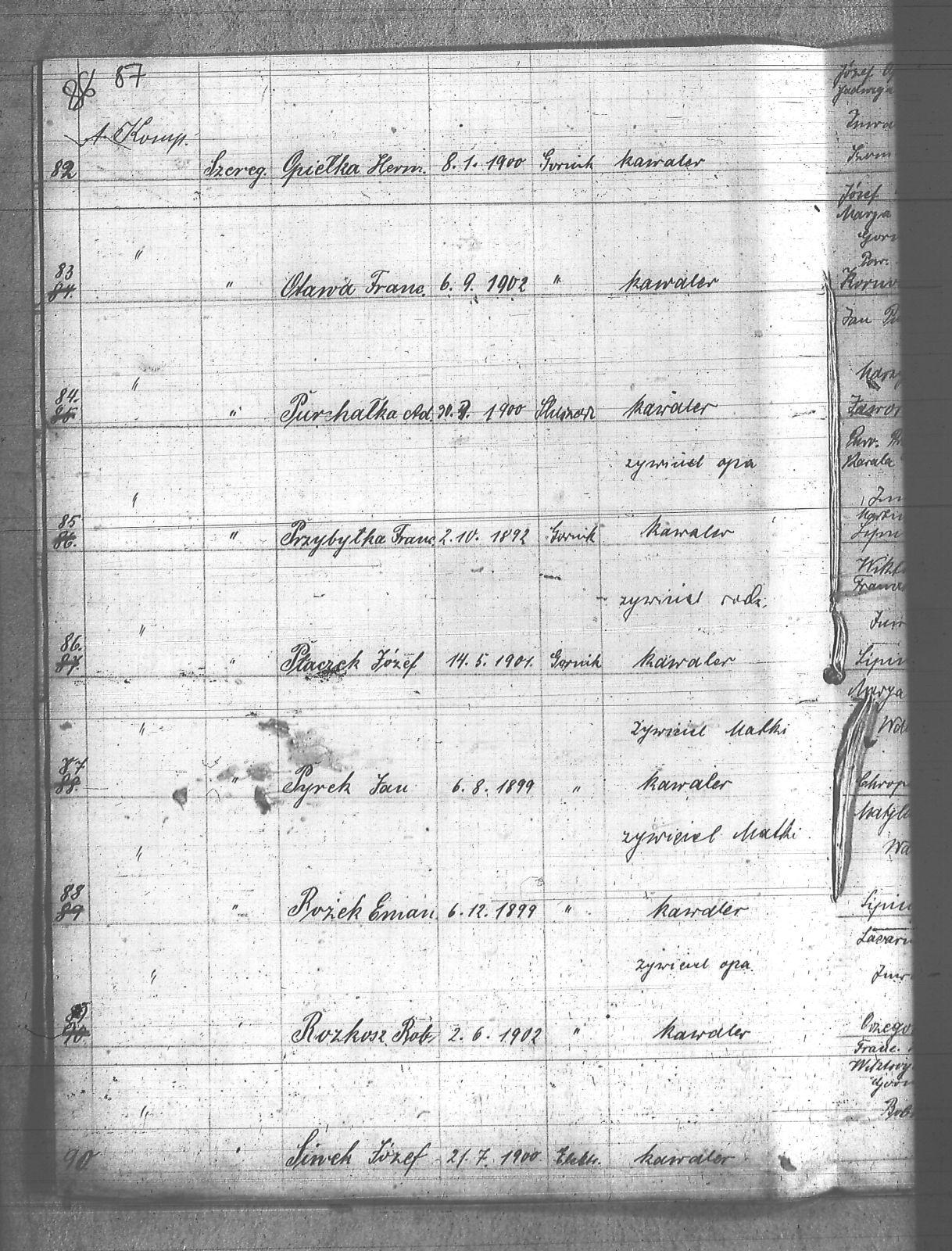 Adamiec, Jan; Adamietz, August; Barański, Józef; Barczyk, Antoni; Baron, Emil; Bekus, Aleksy; Białas, Antoni; Bijok, Grzegorz; Binek, Ignacy; Buchcik, Franciszek; Bujar, Czesław; Byczek, Bernard; Chwolka, Jan; Ciasto, Antoni; Danecki, Wojciech; Długajczyk, Paweł; Dorfla, Herman; Dragon, Jan; Dragon, Paweł; Drzemota, Franciszek; Duda, Józef; Dycka, Antoni; Działach, Antoni; Fanfara, Jan; Flack, Feliks; Flack, Paweł; Flack, Piotr; Franiel, Franciszek; Franiel, Teodor; Gałbas, Raimund; Gamba, Franciszek; Gawęda, Bernard; Gelauer, Stefan; Giza, Jan; Gross, Klemens; Grybsz, Stefan; Gulba, Józef; Hampel, Józef; Hanke, Karol; Hofman, Karol; Janas, Franciszek; Januszewski, Franciszek; Jurczyński, Piotr; Kaizer, August; Kania, Alojzy; Karmański, Jan; Karmański, Piotr; Koc, Piotr; Koprek, Stefan; Korfanty, Józef; Kowalik, Staś; Koziołek, Paweł; Krajuszek, Roman; Kran, Franciszek; Kuna, Piotr; Kwap, Franciszek; Lasok, Piotr; Laszczyk, Franciszek; Latka, Roman; Lebcik, Edward; Lempka, Ryszard; Lisoń, Karol; Ludyga, Andrzej; Ludyga, Antoni; Ludyga, Jan; Ludyga, Józef; Ludyga, Stefan; Ludyga, Tomasz; Malina, Józef; Małota, Jan; Matura, Robert; Mazur, Alojzy; Mazur, Paweł; Miodek, Florian; Muszała, Konrad; Nowak, Jan; Nowakowski, Wilhelm; Ochmańczyk, Wojciech; Ogiński, Konstanty; Olszenka, Roman; Opiełka, Herman; Otawa, Franciszek; Parys, Pawel; Pawełczyk, Ignacy; Pawlikowski, Jan; Październiok, Feliks; Piłot, Józef; Piontek, Adolf; Pitas, Jan; Pitsz, Alojzy; Pluszczyk, Piotr; Pluszczyk, Tomasz; Pluta, Karol; Płaczek, Józef; Porwit, Józef; Przybyłek, Tomasz; Przybyłka, Franciszek; Pudlik, Franciszek; Purchałka, Adam; Pyrek, Jan; Rabus, Marcin; Rokosza, Robert; Rozkosz, Robert; Rożek, Andrzej; Rożek, Emanuel; Siwek, Józef; Sklorz, August; Skorka, Franciszek; Skowronek, Augustyn; Słaboń, Emanuel; Słaboń, Franciszek; Stalmach, Reinhold; Stanienda, Jan; Suchanek, Maksymilian; Sucharowski, Józef; Szatek, Emanuel; Szmaga, Tomasz; Szołtysik, Wilhelm; Świtula, Hubert; Tomala, Franciszek; Tudyga, Alojzy; Tworek, Józef I; Tworek, Józef II; Waleńczyk, Karol; Warzecha, Józef; Weyrauch, Artur; Wicik, Piotr; Wilk, Franciszek; Wojcik, Stefan; Wróbel, Jan II; Wydra, Józef; Zajonc, Piotr; |