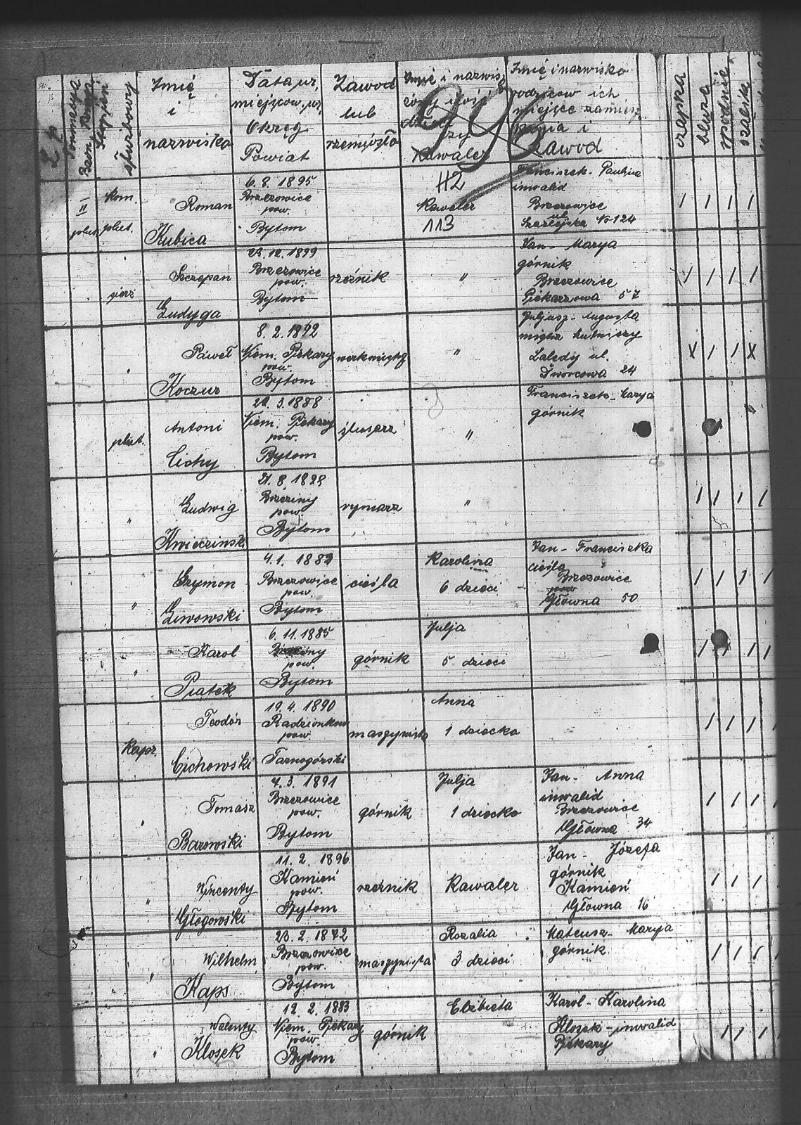 | Osoby | Barowski, Tomasz; Cichowski, Teodor; Cichy, Antoni; Głogowski, Wincenty; Kaps, Wilhelm; Klosek, Walenty; Koczur, Paweł; Kubica, Roman; Kwieczinski, Ludwig; Liwowski, Szymon; Ludyga, Szczepan; Piątek, Karol; |