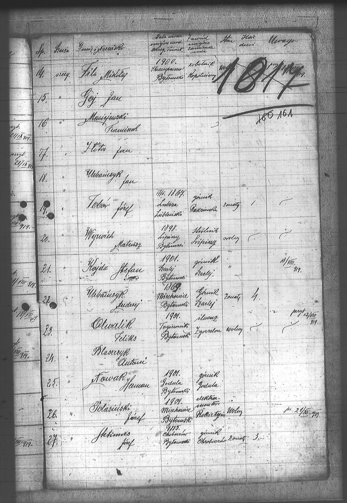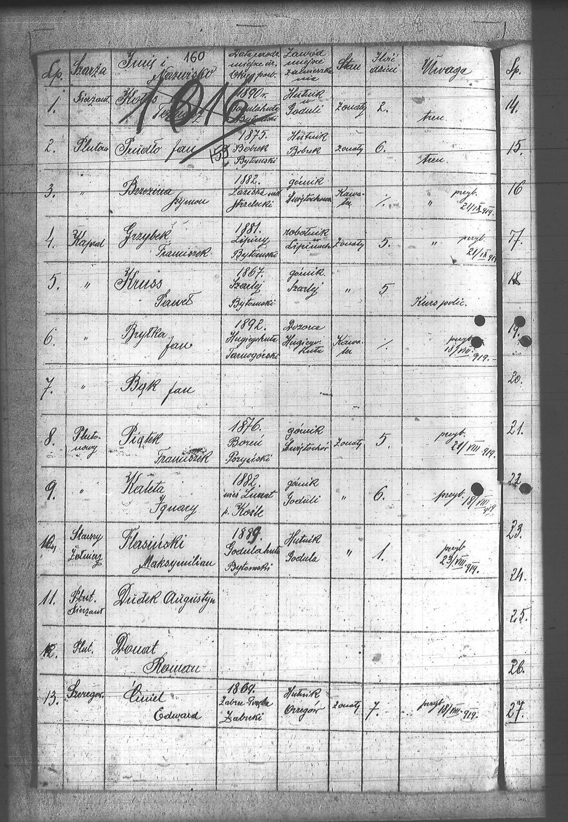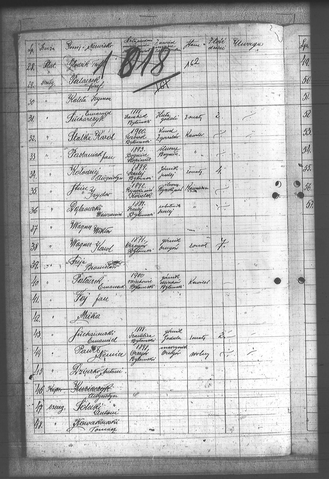 Bąk, Jan; Białus, Jan; Blaszczyk, Antoni; Bryłka, Jan; Brzezina, Szymon; Chyla, Aloizy; Cyniech, Jan; Ćmiel, Edward; Dąbrowski, Wawrzyniec; Donat, Roman; Dudek, Augustyn; Dzięczko, Antoni; Faj, Jan; Fila, Mikołaj; Flasiński, Maksymilian; Głodzik, Teofil; Goj, Jan; Grzybek, Franciszek; Kajda, Stefan; Kaleta, Ignacy; Kaleta, Szymon; Kaliwada, Teodor; Kojda, Stefan; Kolarski, Maciej; Kołas, Tomasz; Kołodziej, Augustyn; Kruss, Pawel; Kuziaczyk, Augustyn; Kwiatkowski, Jan; Maciejewski, Franciszek; Mrika; Niemiec, Paweł; Nowak, Herman; Nowak, Maciej; Nowakowski, Tomasz; Otwalik, Feliks; Palaczek, Edward; Palaczek, Józef; Pasterniok, Jan; Piątek, Franciszek; Polaczek, Emanuel; Polański, Józef; Prudlo, Jan; Solecki, Antoni; Stalka, Karol; Stein, Izydor; Stetimus, Józef; Sucharczyk, Emanuel; Sucharowski, Emanuel; Szeja, Bronisław; Tobór, Józef; Urbańczyk, Andrzej; Urbańczyk, Jan; Wagner, Karol; Wagner, Wiktor; Wyrwich, Mateusz; Złotoś, Jan; |