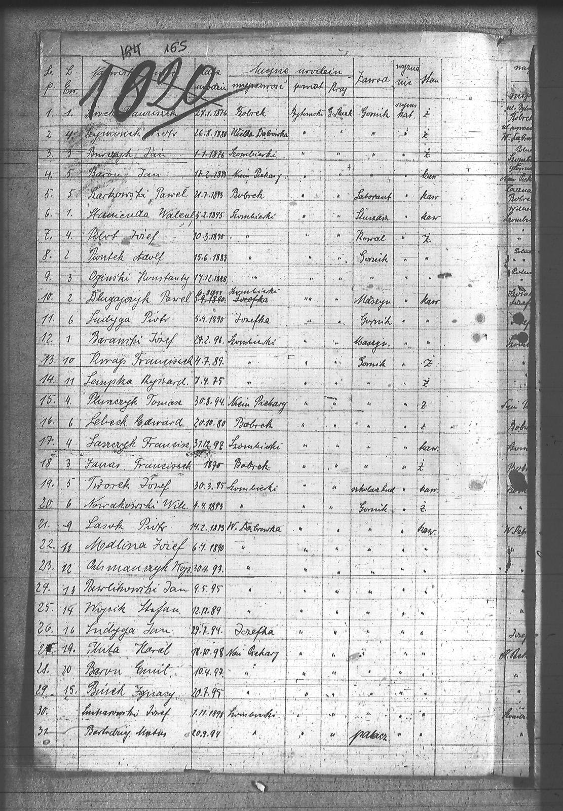 Barański, Józef; Baron, Emil; Baron, Jan; Bartodziej, Mateusz; Bniek, Ignacy; Burczyk, Jan; Długajczyk, Paweł; Janas, Franciszek; Kwap, Franciszek; Lasok, Piotr; Laszczyk, Franciszek; Lebeck, Edward; Lempka, Ryszard; Ludyga, Jan; Ludyga, Piotr; Malina, Józef; Nowakowski, Wilhelm; Ochmanczyk, Wojciech; Ogiński, Konstanty; Pawlikowski, Jan; Pilot, Józef; Piontek, Adolf; Pluszczyk, Tomasz; Pluta, Karol; Siwek, Franciszek; Stanienda, Walenty; Sucharowski, Józef; Szarkowski, Paweł; Szymonek, Piotr; Tworek, Józef; Wójcik, Stefan; |