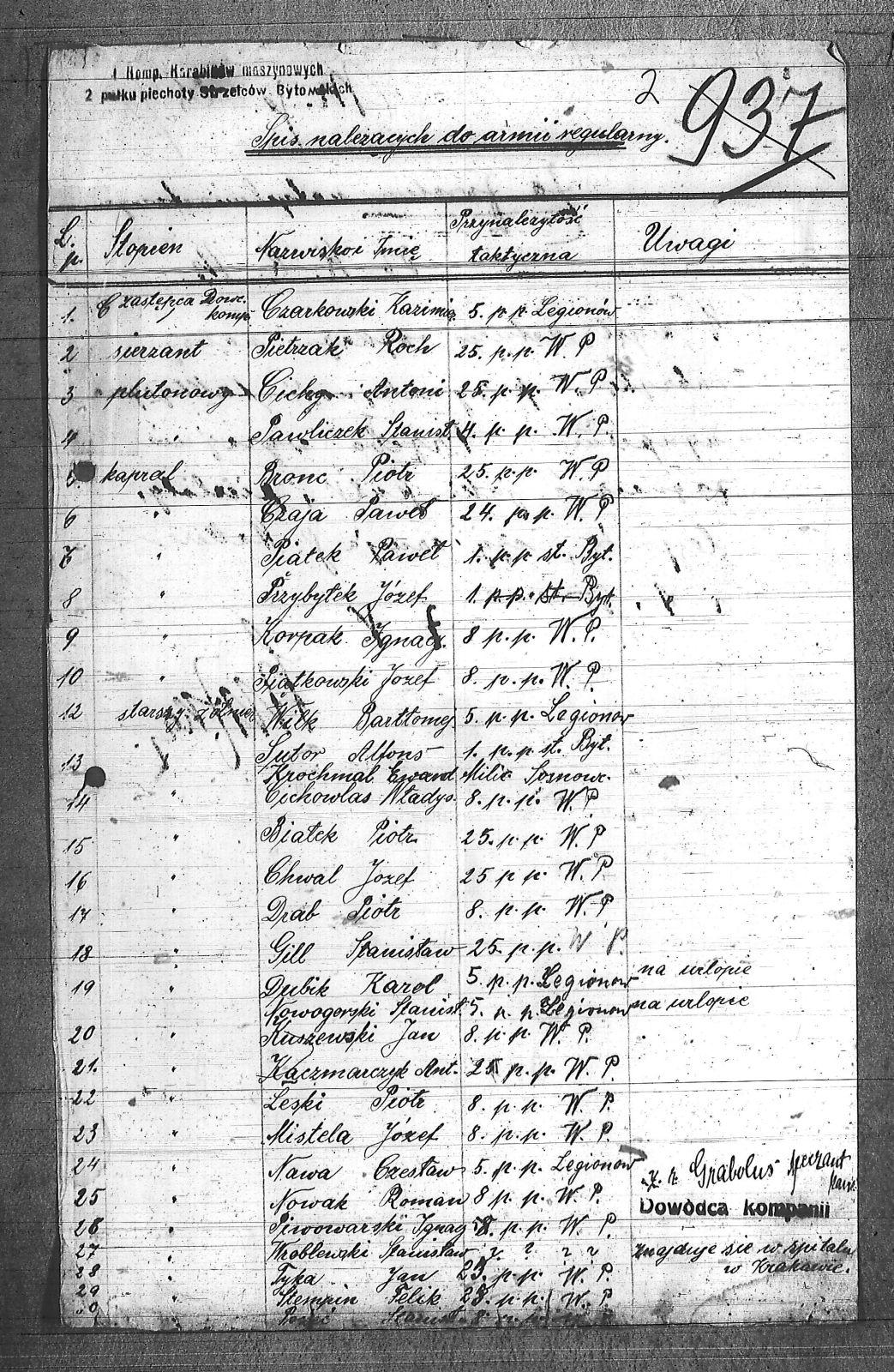 Białek, Piotr; Bronc, Piotr; Chwal, Józef; Cichowlas, Władysław; Cichy, Antoni; Czaja, Paweł; Czarkowski, Kazimierz; Drab, Piotr; Dubik, Karol; Gill, Stanisław; Kaczmarczyk, Antoni; Korpak, Ignacy; Krochmal, Edward; Kuszewski, Jan; Leski, Piotr; Mistela, Józef; Nawa, Czesław; Nowak, Roman; Nowogorski, Stanisław; Pawliczek, Stanisław; Piątek, Paweł; Piątkowski, Józef; Pietrzak, Roch; Piwowarski, Igancy; Porteć, Stanisław; Przybyłek, Józef; Stempin, Feliks; Sutor, Alfons; Tyka, Jan; Wilk, Bartłomiej; Wroblewski, Stanisław; |