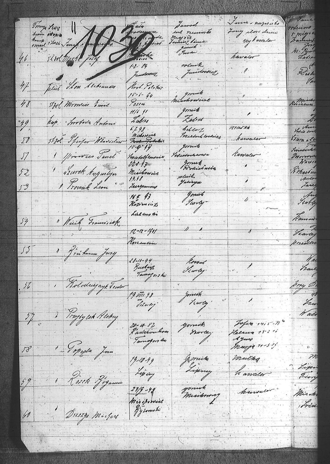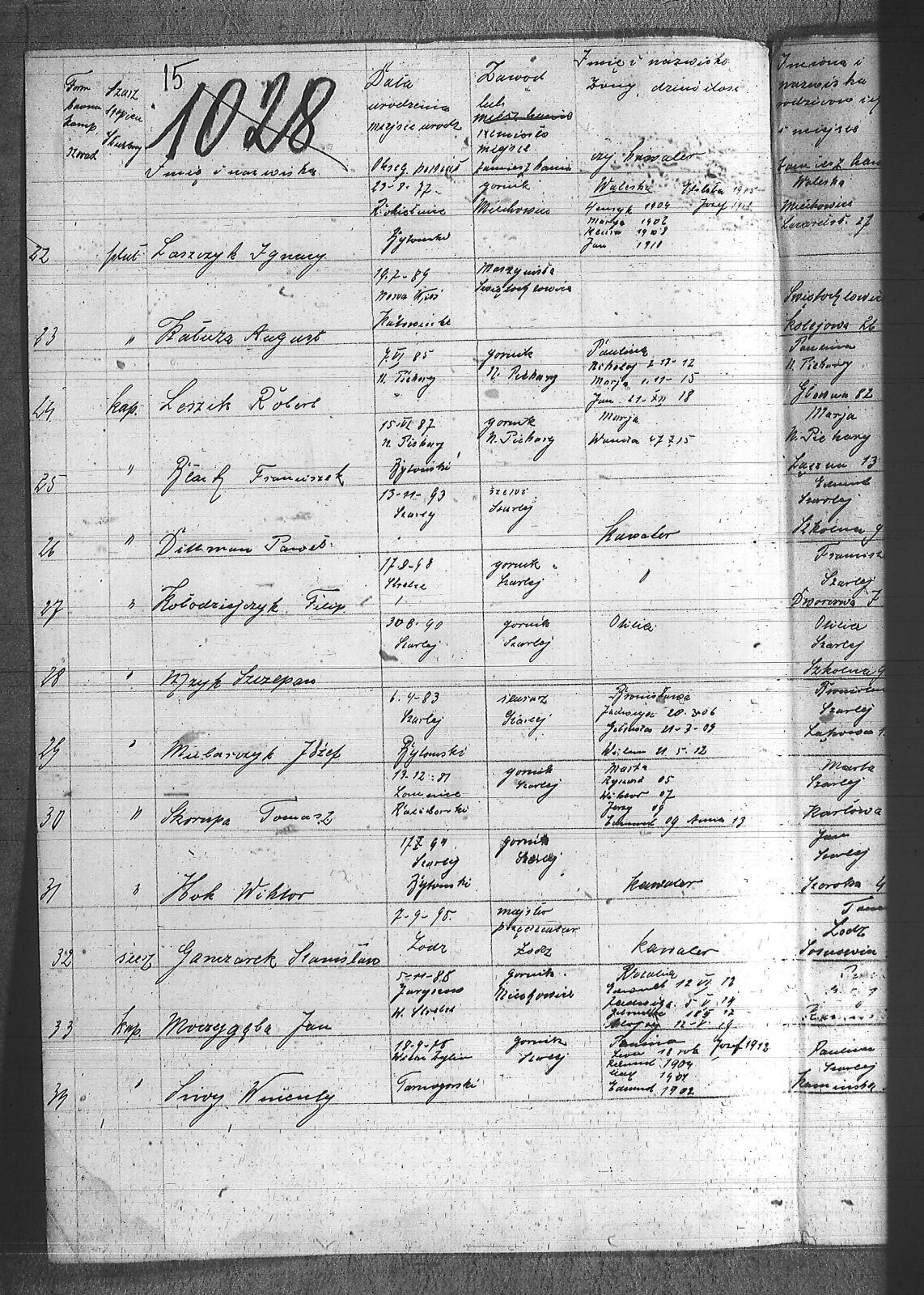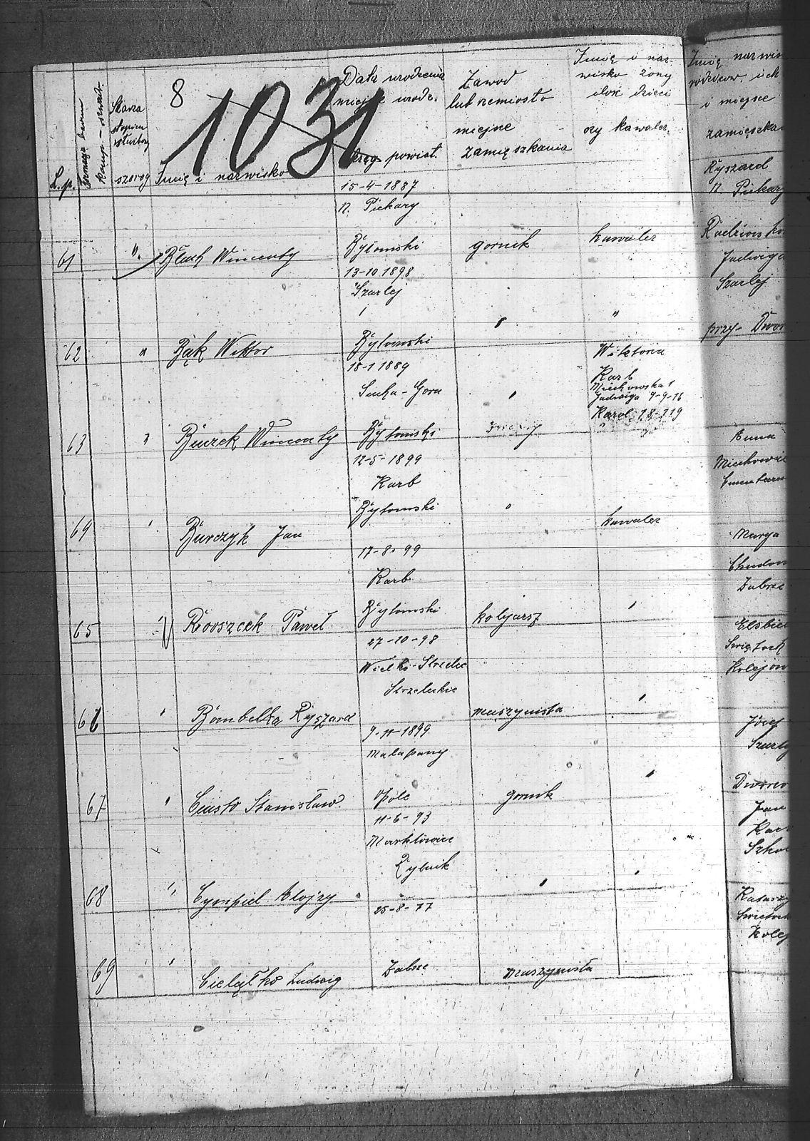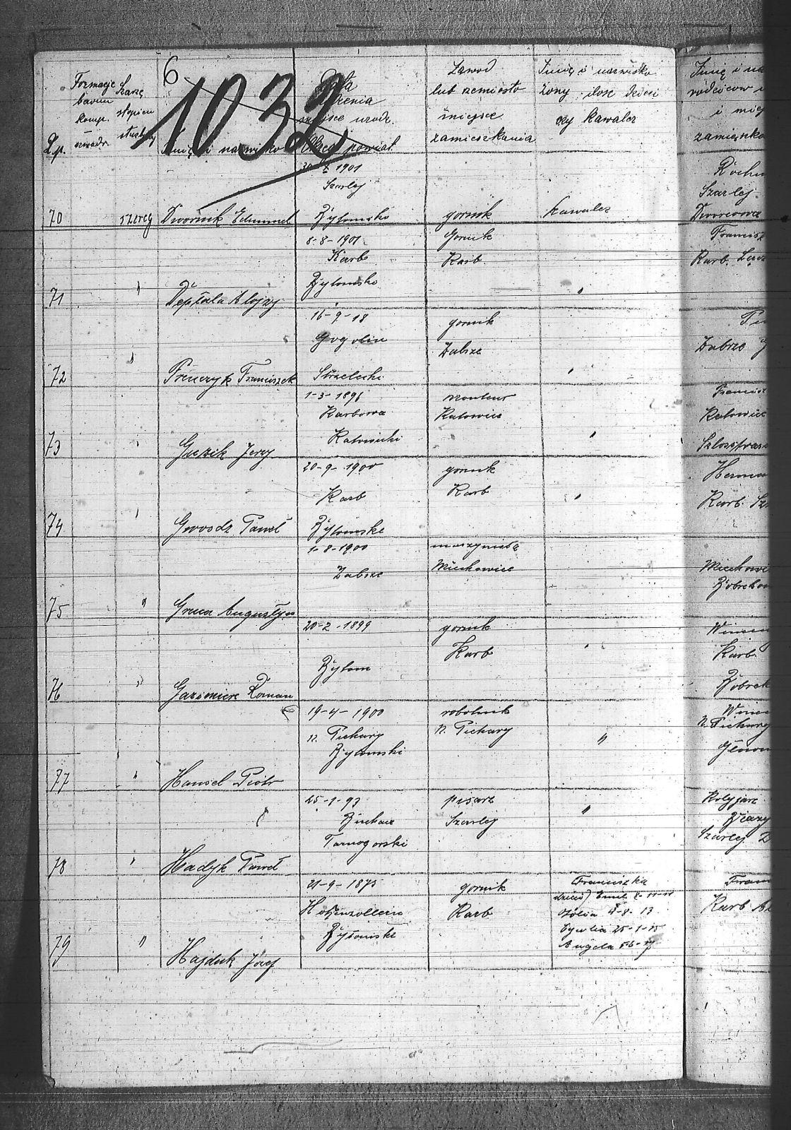 [nieczytelne], Jerzy; Aleksa, Piotr; Bąk, Wiktor; Błach, Franciszek; Błach, Wincenty; Bogacki, ; Bombelka, Ryszard; Borszcek, Paweł; Buczek, Wincenty; Burczyk, Jan; Ciasto, Stanisław; Cielątko, Ludwig; Cigler, Ignacy; Cympiel, Alojzy; Deptala, Alojzy; Dillman, Paweł; Drzezga, Michał; Dwornik, Emanuel; Dwornik, Franciszek; Franiel, Jan; Fruczyk, Franciszek; Gabryś, Franciszek; Ganczarek, Stanisław; Gazimierz, Roman; Głodzik, Teofil; Gruca, Augustyn; Guzik, Jerzy; Gwóźdź, Paweł; Gzell, Szczepan; Hadyk, Paweł; Hajduk, Józef; Hansel, Piotr; Hojczyk, Józef; Hok, Wiktor; Izański, Zygmunt; Jesierowski, Jan; Kałuża, August; Kamiński, Alojzy; Kempa, Jan; Kisel, Szczepan; Klapuczyk, Teodor; Knopp, Wincenty; Koczwara, Marcin; Kołodziej, Franciszek; Kołodziejczyk, Filip; Kołodziejczyk, Piotr; Kołodziejczyk, Teodor; Kot, Reinard; Kubior, Teofil; Kulibuta, Wilhelm; Kwiol, Jan; Laszczyk, Ignacy; Leszek, Robert; Lis, Robert; Lizurek, Józef; Maruszczyk, Mateusz; Micka, Józef; Moczygęba, Jan; Morawiec, Ignacy; Mrowiec, Emil; Mrowiec, Paweł; Mularczyk, Józef; Mzyk, Szczepan; Ochota, Wiktor; Opuchlik, Jakub; Pasternok, Józef; Pasterski, Henryk; Pfeifer, Władysław; Pluszczyk, Filip; Popęda, Jan; Proncik, Leon; Przybyłek, Aleksy; Rożek, Bogumił; Różanka, Jan; Różanka, Tomasz; Siwy, Wincenty; Skorupa, Tomasz; Słoń, Aleksander; Sowa, Jan; Swoboda, Antoni; Szurek, Augustyn; Świerzy, Jan; Trzcianek, Emanuel; Wicik, Franciszek; Widera, Konstanty; Wiechoczek, Walenty; Wojcik, Alojzy; Wrzaskała, Jan; |