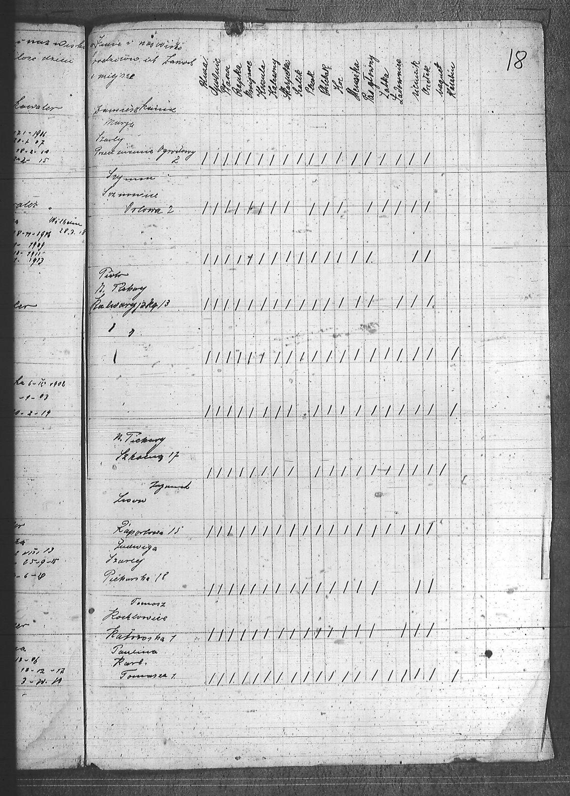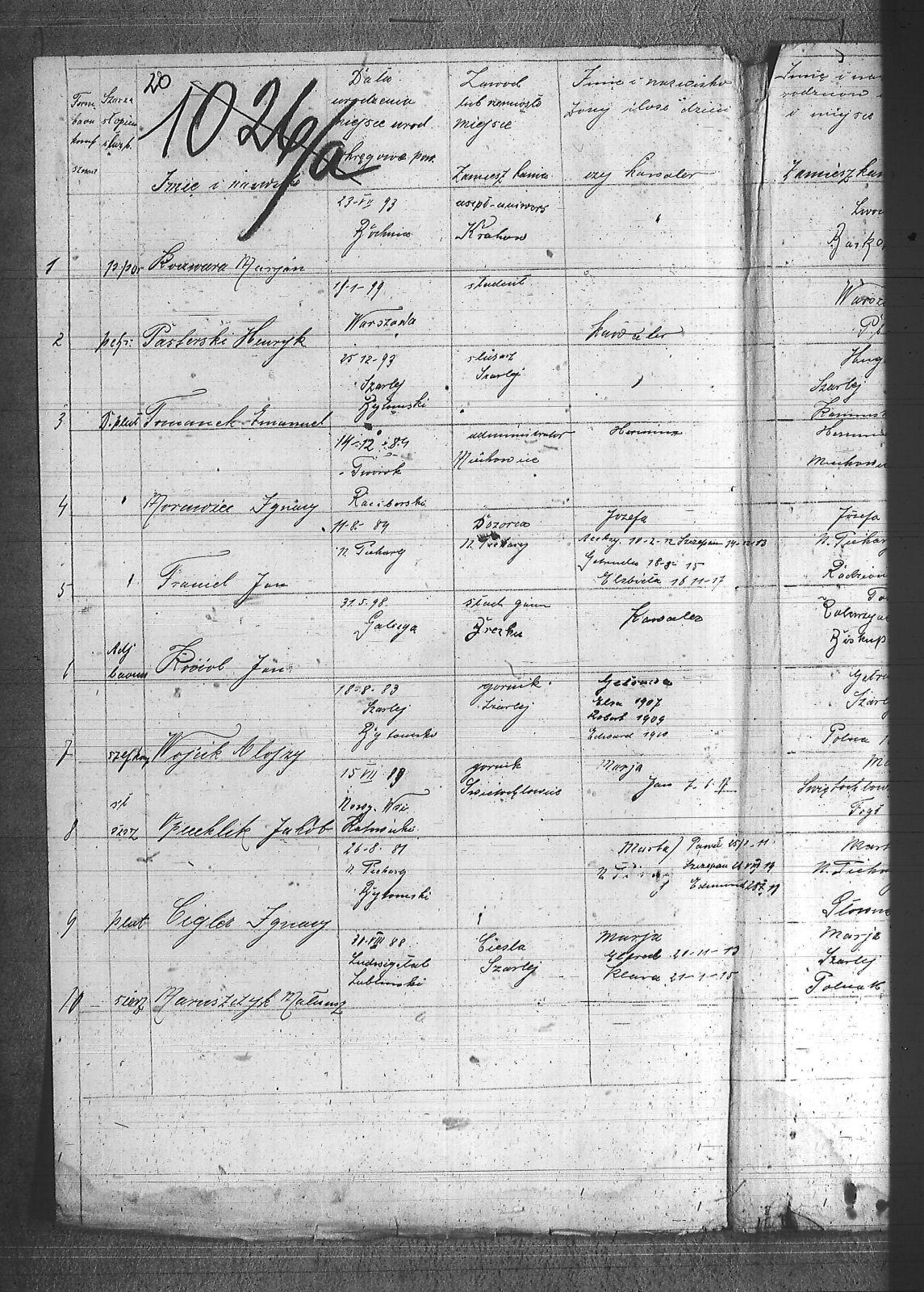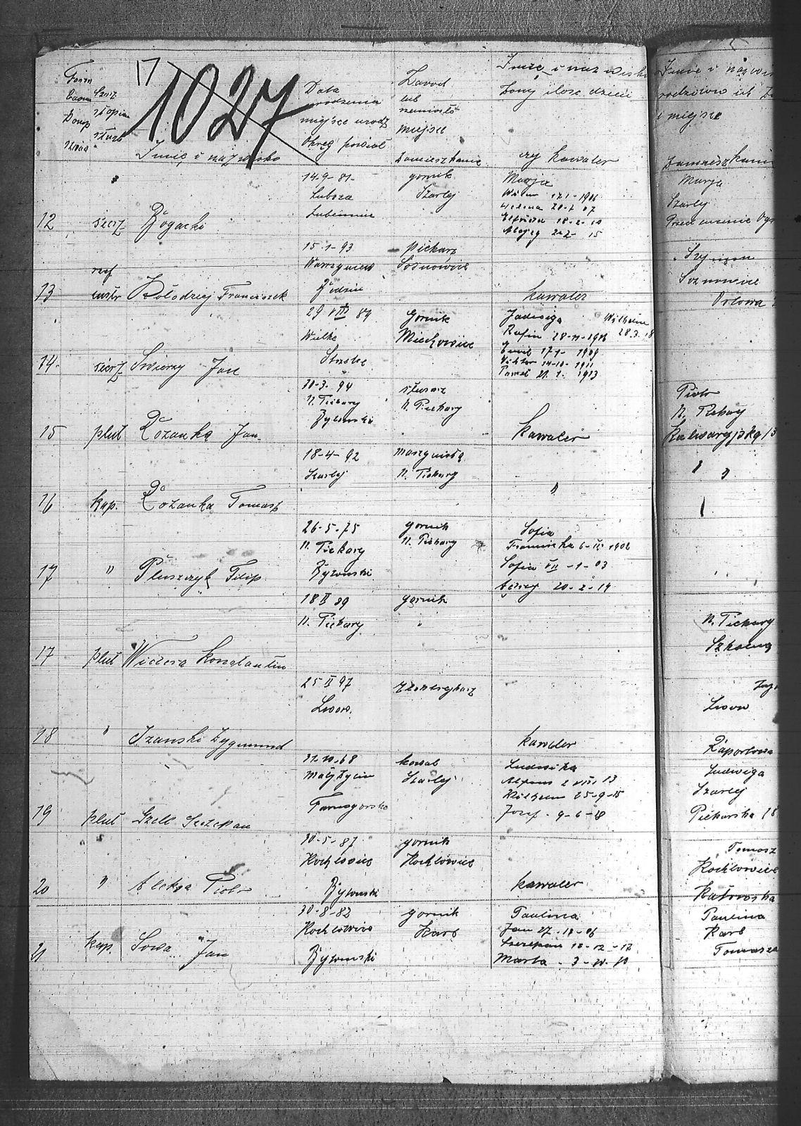 [nieczytelne], Jerzy; Aleksa, Piotr; Bąk, Wiktor; Błach, Franciszek; Błach, Wincenty; Bogacki, ; Bombelka, Ryszard; Borszcek, Paweł; Buczek, Wincenty; Burczyk, Jan; Ciasto, Stanisław; Cielątko, Ludwig; Cigler, Ignacy; Cympiel, Alojzy; Deptala, Alojzy; Dillman, Paweł; Drzezga, Michał; Dwornik, Emanuel; Dwornik, Franciszek; Franiel, Jan; Fruczyk, Franciszek; Gabryś, Franciszek; Ganczarek, Stanisław; Gazimierz, Roman; Głodzik, Teofil; Gruca, Augustyn; Guzik, Jerzy; Gwóźdź, Paweł; Gzell, Szczepan; Hadyk, Paweł; Hajduk, Józef; Hansel, Piotr; Hojczyk, Józef; Hok, Wiktor; Izański, Zygmunt; Jesierowski, Jan; Kałuża, August; Kamiński, Alojzy; Kempa, Jan; Kisel, Szczepan; Klapuczyk, Teodor; Knopp, Wincenty; Koczwara, Marcin; Kołodziej, Franciszek; Kołodziejczyk, Filip; Kołodziejczyk, Piotr; Kołodziejczyk, Teodor; Kot, Reinard; Kubior, Teofil; Kulibuta, Wilhelm; Kwiol, Jan; Laszczyk, Ignacy; Leszek, Robert; Lis, Robert; Lizurek, Józef; Maruszczyk, Mateusz; Micka, Józef; Moczygęba, Jan; Morawiec, Ignacy; Mrowiec, Emil; Mrowiec, Paweł; Mularczyk, Józef; Mzyk, Szczepan; Ochota, Wiktor; Opuchlik, Jakub; Pasternok, Józef; Pasterski, Henryk; Pfeifer, Władysław; Pluszczyk, Filip; Popęda, Jan; Proncik, Leon; Przybyłek, Aleksy; Rożek, Bogumił; Różanka, Jan; Różanka, Tomasz; Siwy, Wincenty; Skorupa, Tomasz; Słoń, Aleksander; Sowa, Jan; Swoboda, Antoni; Szurek, Augustyn; Świerzy, Jan; Trzcianek, Emanuel; Wicik, Franciszek; Widera, Konstanty; Wiechoczek, Walenty; Wojcik, Alojzy; Wrzaskała, Jan; |