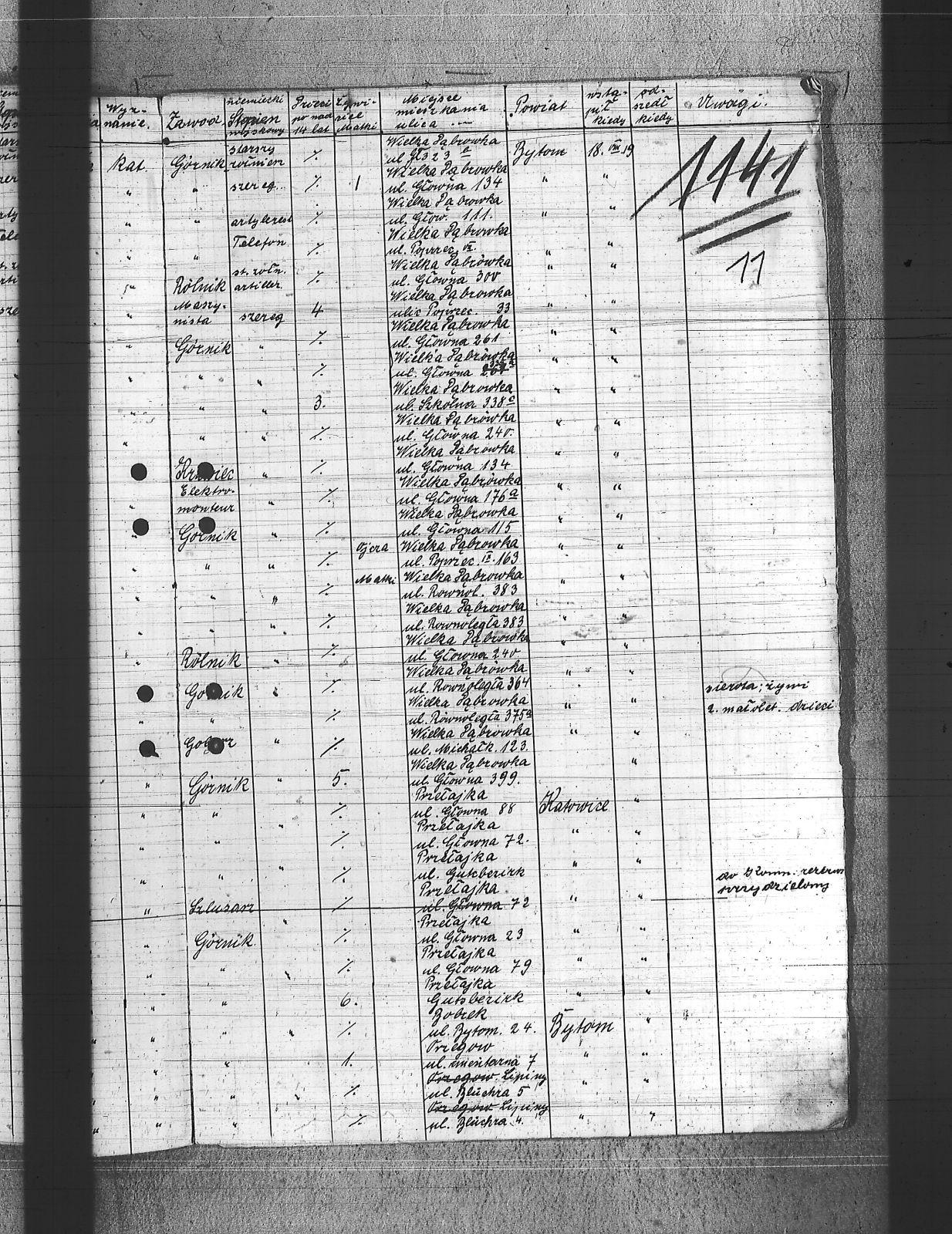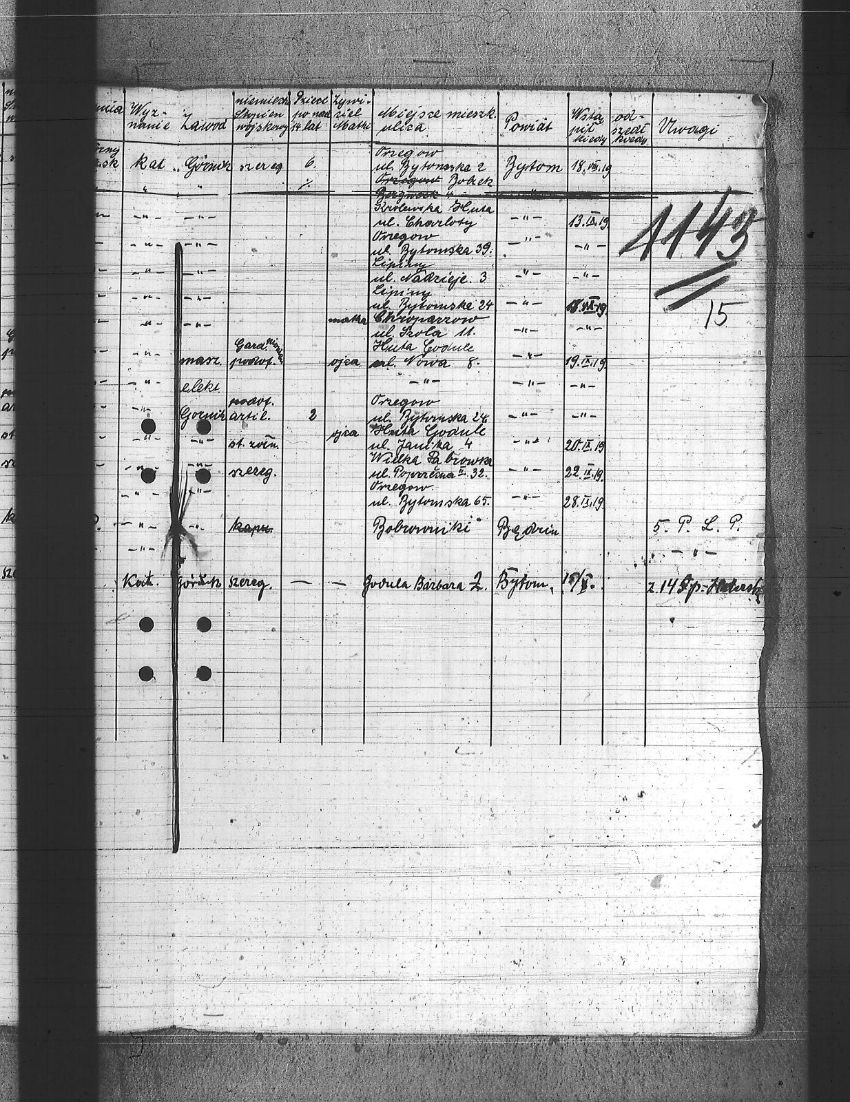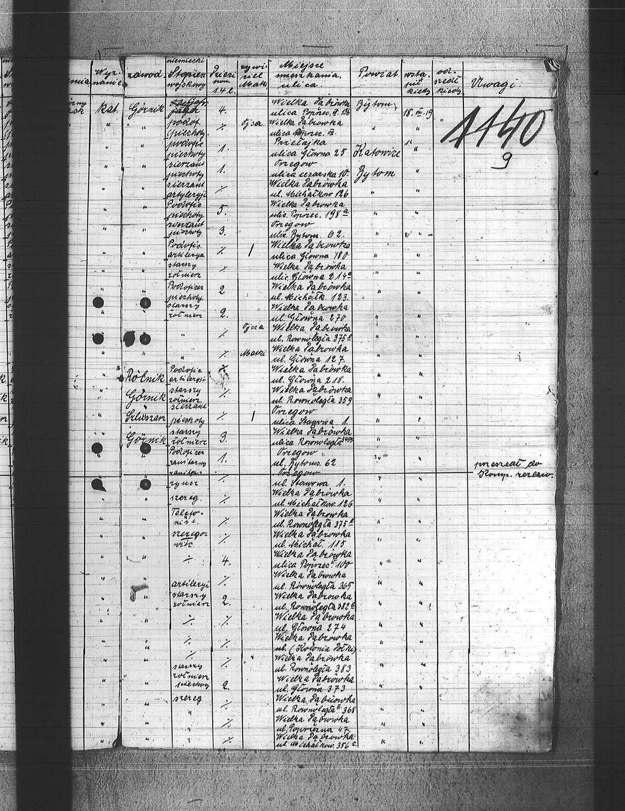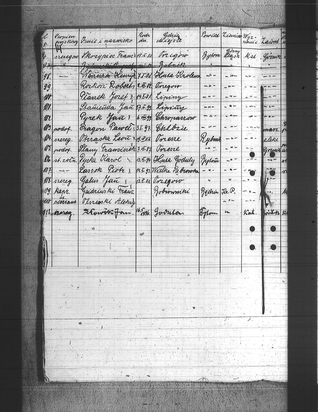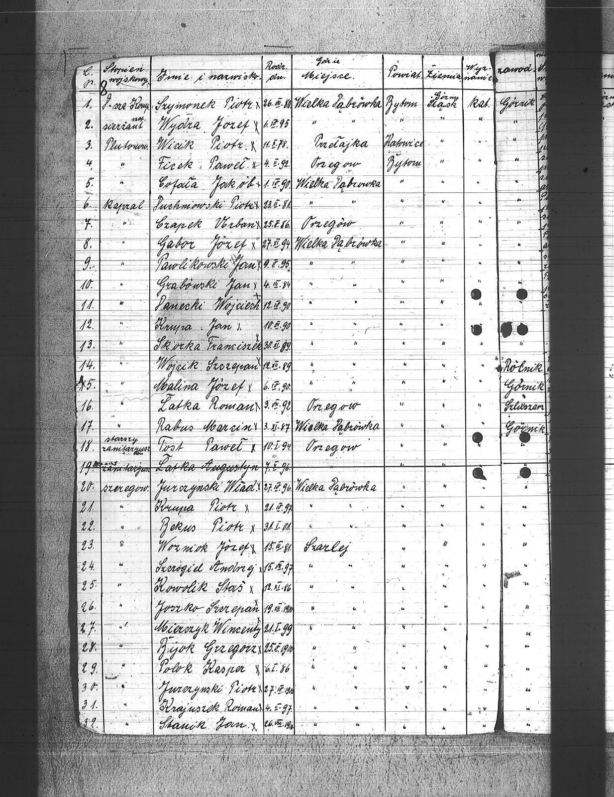 Adamiec, Jan; Bednarski, Walenty; Bekus, Aleksy; Bekus, Piotr; Białas, Antoni; Bijok, Bernard; Bijok, Grzegorz; Błaszczyk, Wincenty; Buchcik, Franciszek; Buchcik, Ignacy; Chwieja, Wilem; Chwolka, Jan; Cofała, Jakub; Czapek, Urban; Danecki, Wojciech; Deptala, Józef; Dragon, Paweł; Drzemota, Franciszek; Duchniowski, Piotr; Dycka, Karol; Ficek, Paweł; Gabor, Józef; Gajdziński, Franciszek; Galus, Jan; Gamba, Franciszek; Grabowski, Jan; Grabowski, Mikołaj; Grala, Konrad; Halczuch, Teodor; Hampel, Józef; Hofman, Karol; Hojczyk, Augustyn; Hrabka, Jakub; Januszewski, Franciszek; Janysek, Wilem; Joszko, Szczepan; Jurczyński, Franciszek; Jurczyński, Piotr; Jurczyński, Władysław; Kobierski, Paweł; Kocz, Piotr; Kojma, Ryszard; Kopański, Alojzy; Koprek, Szczepan; Kowolik, Stanisław; Koziołek, Paweł; Kozłowski, Paweł; Krajuszek, Roman; Kran, Franciszek; Krawczyk, Aleksy; Krupa, Jan; Krupa, Piotr; Kucia, Piotr; Kupka, Paweł; Kupny, Józef; Lasok, Piotr; Los, Tomasz; Loska, Jan; Łatka, Rajmund; Łatka, Roman; Malina, Józef; Markiefka, Alojzy; Mierczyk, Wincenty; Molka, Michał; Nierobisz, Teodor; Nowak, Jan; Ochmańczyk, Wojciech; Olszewski, Aleksy; Otrząska, Leon; Painta, Piotr; Pająk, Alfons; Pawlikowski, Jan; Pawlikowski, Teodor; Piechaczek, Feliks; Piechaczek, Wojciech; Płaczek, Józef; Płonka, Bartłomiej; Pniok, Franciszek; Polok, Franciszek; Polok, Kasper; Pyrek, Jan; Rabus, Marcin; Rozkosz, Robert; Rożek, Emanuel; Skórka, Franciszek; Skrzypiec, Franciszek; Slany, Franciszek; Słowik, Jan; Stanienda, Jan; Stanik, Jan; Szczogieł, Andrzej; Szeja, Franciszek; Szmaga, Tomasz; Szymonek, Piotr; Tost, Paweł; Tyras, Jan; Warzecha, Henryk; Wicik, Piotr; Wieczorek, Paweł; Wozniok, Józef; Wójcik, Jakub; Wójcik, Jan; Wójcik, Szczepan; Wyderka, Marcin; Wydra, Jan; Wydra, Józef; |