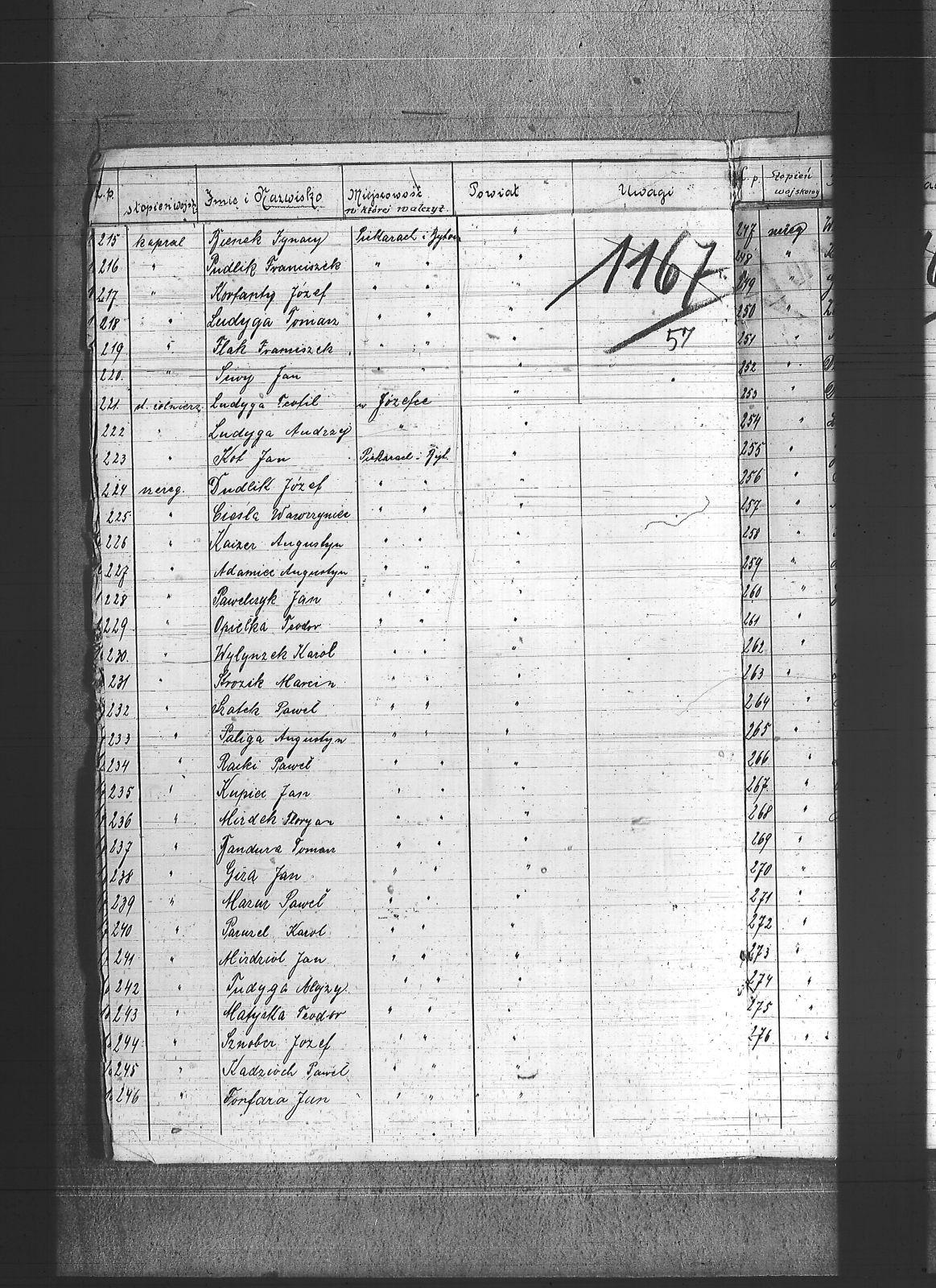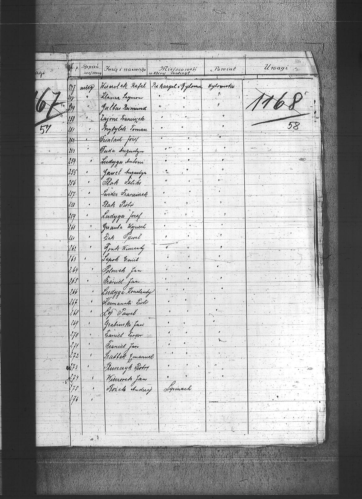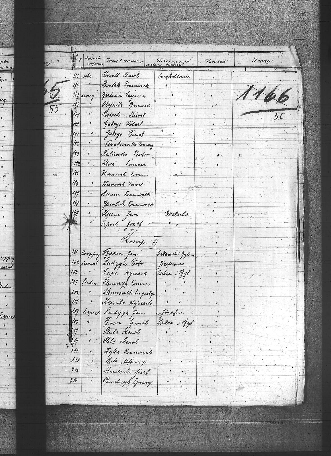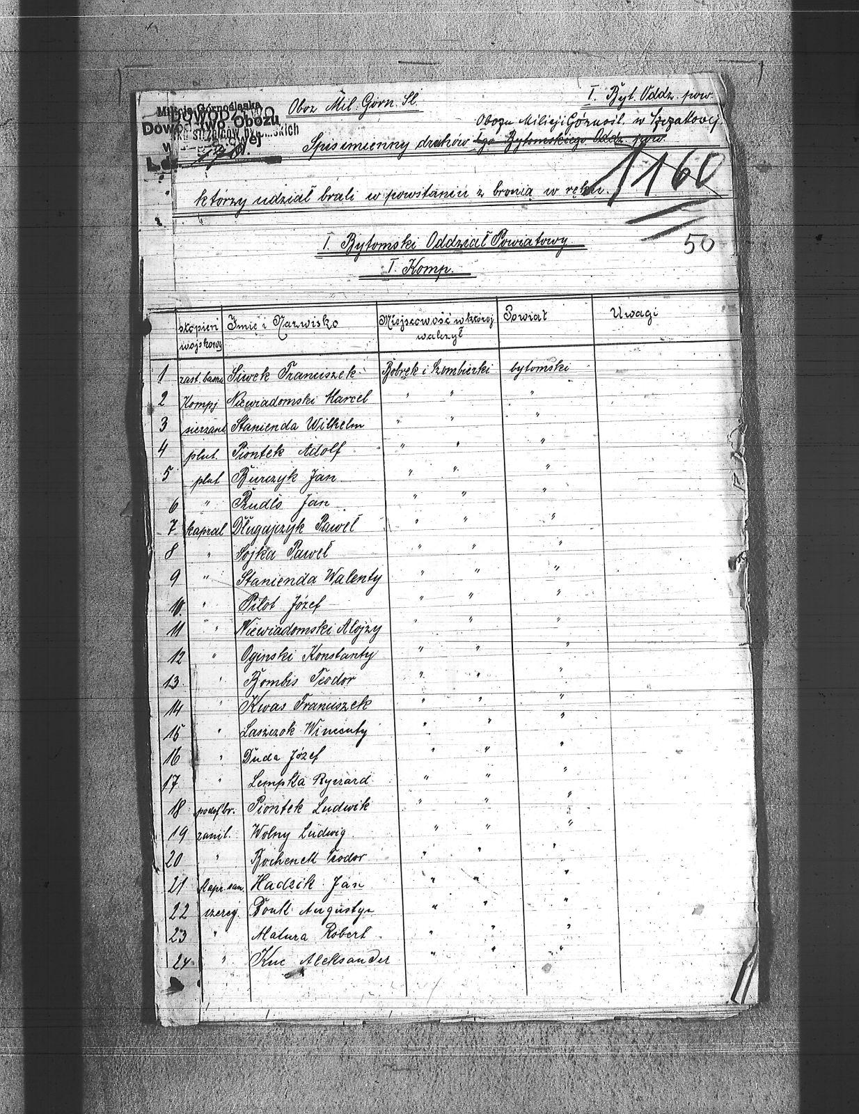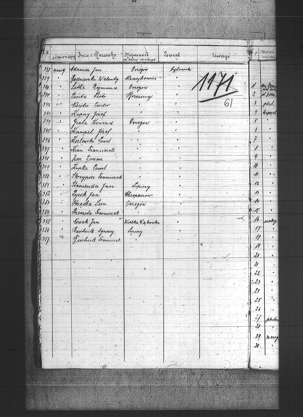 Adam, Franciszek; Adamczyk, Wiktor; Adamiec, Augustyn; Adamiec, Jan; Balon, Jakub; Baran, Jan; Barczok, Ignacy; Baron, Emil; Bartodziej, Karol; Bąk, Augustyn; Bąk, Wincenty; Bednarski, Walenty; Bekus, Aleksander; Bekus, Piotr; Białas, Antoni; Bienek, Ignacy; Bijok, Bernard; Bijok, Grzegorz; Błaszczyk, Józef; Bochenek, Teodor; Bombis, Teodor; Brosz, Franciszek; Brosz, Teofil; Brzezina, Szymon; Buchcik, Franciszek; Buchcik, Ignacy; Burczyk, Jan; Choroba, Juliusz; Chwaszcza, Mikołaj; Chwieja, Wilem; Ciasto, Antoni; Cieśla, Wawrzyniec; Ciok, Ludwik; Cofała, Jakub; Cwienczek, Józef; Cygan, Piotr; Czajor, Antoni; Czapek, Urban; Czapik, Piotr; Czarnynoga, Józef; Czerniachowski, Augustyn; Czysz, Augustyn; Ćmiel, Edward; Daniecki, Wojciech; Deptala, Józef; Długajczyk, Karol; Długajczyk, Paweł; Długajczyk, Piotr; Dragon, Jan; Dragon, Paweł; Duchniowski, Piotr; Duda, Augustyn; Duda, Józef; Dudek, Augustyn; Dudlik, Józef; Dycka, Karol; Dyga, Franciszek; Działach, Józef; Ficek, Paweł; Fila, Bernard; Fila, Mikołaj; Flak, Feliks; Flak, Franciszek; Flak, Paweł; Flak, Piotr; Flaszyński, Maksym; Foit, Antoni; Fonfara, Jan; Frainel, Jan; Franiel, Jan; Franiel, Teodor; Gabór, Józef; Gabryś, Paweł; Gabryś, Robert; Galczok, Andrzej; Gałbas, Rajmund; Gaweł, Augustyn; Gawlik, Franciszek; Gebauer, Stefan; Gerlich, Stefan; Giza, Jan; Goik, Ludwik; Golema, Roman; Grabiński, Jan; Grala, Konrad; Greif, Piotr; Greinerl, Ludwik; Gros, Klemens; Grzanta, Wojciech; Grzybek, Franciszek; Grzybek, Szymon; Gulba, Józef; Gwizdoł, Teodor; Hadzik, Jan; Handla, Wiktor; Hartman, Wilem; Hiska, Karol; Hofman, Karol; Hojczyk, Augustyn; Hojka, Franciszek; Hok, Alfons; Husioł, Antoni; Janas, Franciszek; Janta, Wincenty; Januszowski, Franciszek; Janysek, Wilem; Joszko, Szczepan; Jurczyński, Franciszek; Jurczyński, Piotr; Jurczyński, Władysław; Jurosz, Paweł; Jurzyca, Herman; Kaczmarek, Franciszek; Kadłubek, Karol; Kadzioch, Paweł; Kaizer, Augustyn; Kaliwoda, Teodor; Kalyta, Ignacy; Kałuża, Piotr; Kampel, Józef; Kania, Alojzy; Kania, Paweł; Kapica, Wojciech; Karmański, Piotr; Kaszuba, Wojciech; Kempa, Antoni; Kensy, Augustyn; Kirszniok, Paweł; Klanza, Szymon; Klasik, Jan; Klimek, Jan; Klocz, Tomasz; Knapik, Roman; Kobierski, Paweł; Kocurek, Edward; Kocz, Piotr; Koczur, Augustyn; Koczur, Jan; Koczur, Maksymilian; Kondziołka, Józef; Kopański, Alojzy; Korfanty, Józef; Kot, Jan; Kot, Józef; Kotas, Tomasz; Kowalczyk, Jan; Kowalik, Stanisław; Kozik, Bernard; Kozik, Ryszard; Koziołek, Paweł; Kozłowski, Paweł; Krajuszek, Roman; Kral, Franciszek; Kran, Franciszek; Krawczyk, Błażej; Król, Karol; Króliczek, Józef; Krupa, Jan; Krupa, Piotr; Krzakała, Augustyn; Krzuk, Karol; Kuc, Aleksander; Kucia, Piotr; Kudełko, Adolf; Kulawik, Jan; Kupiec, Jan; Kupka, Paweł; Kupny, Józef; Kuźnik, Antoni; Kwapuliński, Franciszek; Kwas, Franciszek; Kwieja, Józef; Kwiska, Franciszek; Lapok, Emil; Lasok, Piotr; Laszczok, Paweł; Laszczok, Wincenty; Lelonek, Antoni; Lempka, Ryszard; Les, Alfons; Liśnik, Jan; Los, Paweł; Loska, Jan; Lubecki, Paweł; Ludwik, Jan; Ludyga, Andrzej; Ludyga, Antoni; Ludyga, Jan; Ludyga, Józef; Ludyga, Konstanty; Ludyga, Piotr; Ludyga, Teofil; Ludyga, Tomasz; Łaszczyk, Franciszek; Łatka, Rajmund; Łatka, Roman; Łebek, Edward; Malina, Józef; Markiefka, Alojzy; Maszula, Konrad; Matura, Robert; Matusik, Józef; Matyska, Teodor; Mazur, Paweł; Mądry, Teodor; Mendecki, Józef; Mierczyk, Wincenty; Mirdek, Florian; Mizdzioł, Jan; Molka, Michał; Nierobisz, Teodor; Niewiadomski, Alojzy; Niewiadomski, Marcel; Nowak, Herman; Nowak, Jan; Nowakowski, Tomasz; Ochmańczyk, Franciszek; Oginski, Konstanty; Olejnik, Bernard; Olek, Tomasz; Opiełka, Teodor; Orand, Jan; Oryczek, Erich; Otparlik, Feliks; Otrząska, Leon; Paczek, Karol; Pająk, Alfons; Paliga, Augustyn; Pampuch, Walenty; Pandel, Franciszek; Pandel, Paweł; Panicz, Piotr; Pańta, Piotr; Pardela, Jan; Paruzel, Karol; Pawełczyk, Ignacy; Pawełczyk, Jan; Pawlikowski, Jan; Piątek, Adolf; Piątek, Franciszek; Piątek, Ludwik; Piechaczek, Feliks; Pietrecki, Emanuel; Pietrek, Paweł; Pilot, Józef; Pluszczyk, Piotr; Pluszczyk, Roman; Pluta, Karol; Płonka, Bartłomiej; Politaj, Emanuel; Poloczek, Jan; Polok, Kasper; Prandzioch, Augustyn; Pruczowski, Tomasz; Prudło, Jan; Pruszowski, Józef; Przemota, Franciszek; Przybyła, Tomasz; Przybyłek, Tomasz; Pudlik, Franciszek; Pyrek, Jan; Rabuś, Marcin; Racki, Paweł; Rożek, Andrzej; Rubin, Wilhelm; Rus, Franciszek; Rusecki, Augustyn; Rust, Feliks; Ryba, Bruno; Sapa, Ryszard; Siegel, Józef; Siwek, Franciszek; Siwek, Józef; Siwy, Jan; Skowronek, Augustyn; Skórka, Franciszek; Skrzypiec, Franciszek; Skupień, Karol; Slany, Franciszek; Słota, Karol; Smela, Karol; Smykała, Jan; Sobek, Juliusz; Sojka, Paweł; Sornik, Wilem; Sosna, Wiktor; Sowa, Piotr; Stach, Jan; Stanienda, Jan; Stanienda, Walenty; Stanienda, Wilhelm; Stanik, Jan; Stetinus, Józef; Stolka, Karol; Strozik, Marcin; Suchanek, Maksym; Sucharowski, Emanuel; Sucharowski, Józef; Suchaszczyk, Piotr; Szarkowski, Paweł; Szatek, Emanuel; Szatek, Paweł; Szczogieł, Andrzej; Szeja, Franciszek; Szemroszczyk, Piotr; Szier, Emil; Szmaga, Tomasz; Sznober, Józef; Szpeil, Józef; Szromek, Alojzy; Szweda, Teodor; Szymanek, Piotr; Szyndera, Józef; Świder, Franciszek; Świerczek, Stefan; Świerczyna, Piotr; Świtała, Teodor; Tandura, Tomasz; Tomala, Franciszek; Tomczak, Wincenty; Toryfa, Józef; Tost, Paweł; Tudyga, Alojzy; Tusze, Oskar; Tworek, Józef I; Tyras, Jan; Wagner, Karol; Waliczek, Ryszard; Wandziura, Emil; Wicik, Piotr; Wiechaczek, Wiktor; Wieczorek, Jan; Wieczorek, Paweł; Wieczorek, Piotr; Wieczorek, Tomasz; Wieszołek, Rafał; Wilim, Edmund; Witka, Franciszek; Wochnik, Piotr; Wojcik, Jan; Wojtyczka, Paweł; Wolny, Ludwig; Wozniok, Józef; Wójcik, Alojzy; Wójcik, Szczepan; Wróbel, Jan II; Wyderka, Marcin; Wydra, Jan; Wydra, Józef; Wylynzek, Karol; Wyrwich, Mateusz; Wyrwoł, Ryszard; Zając, Franciszek; Zosz