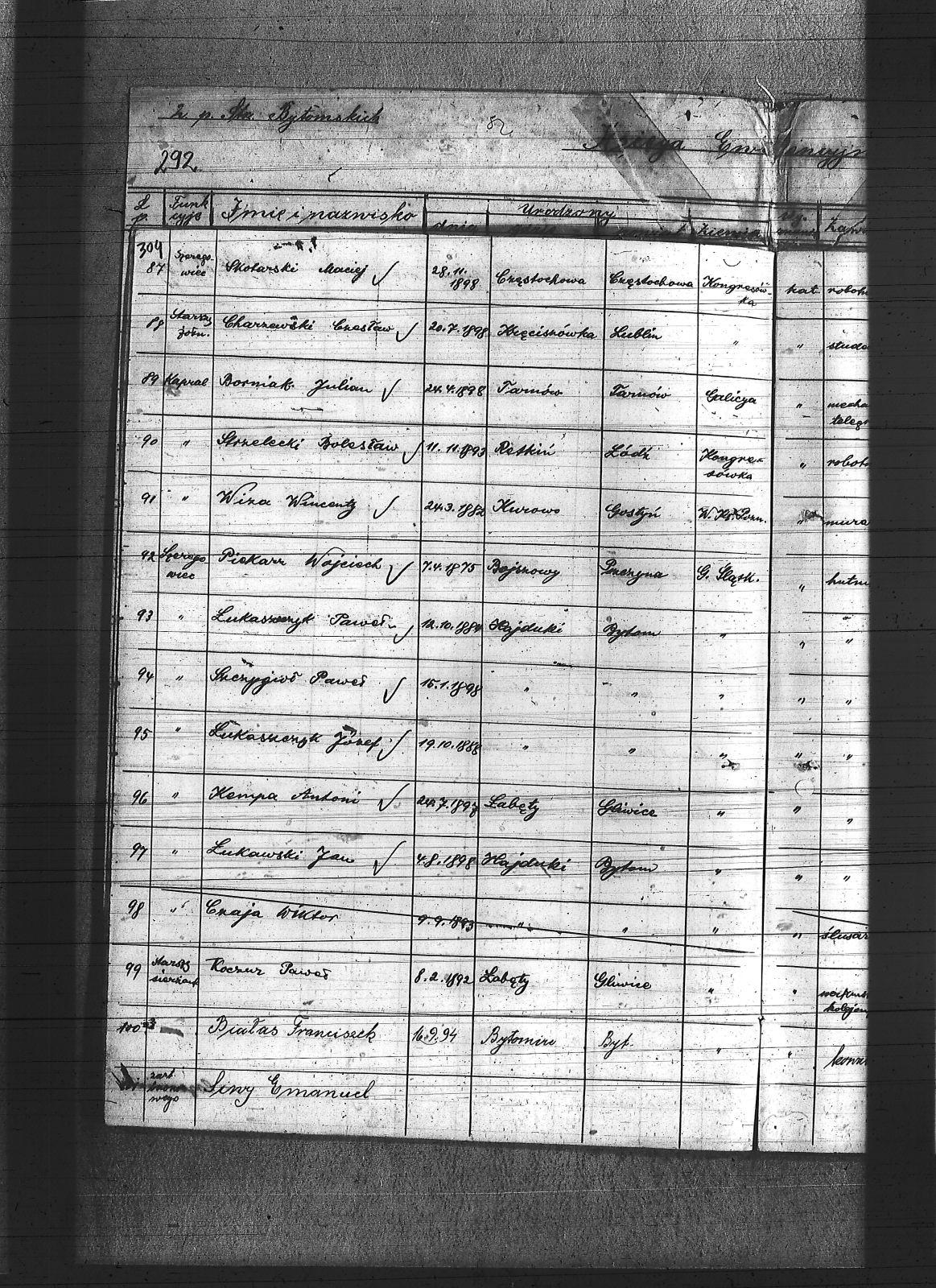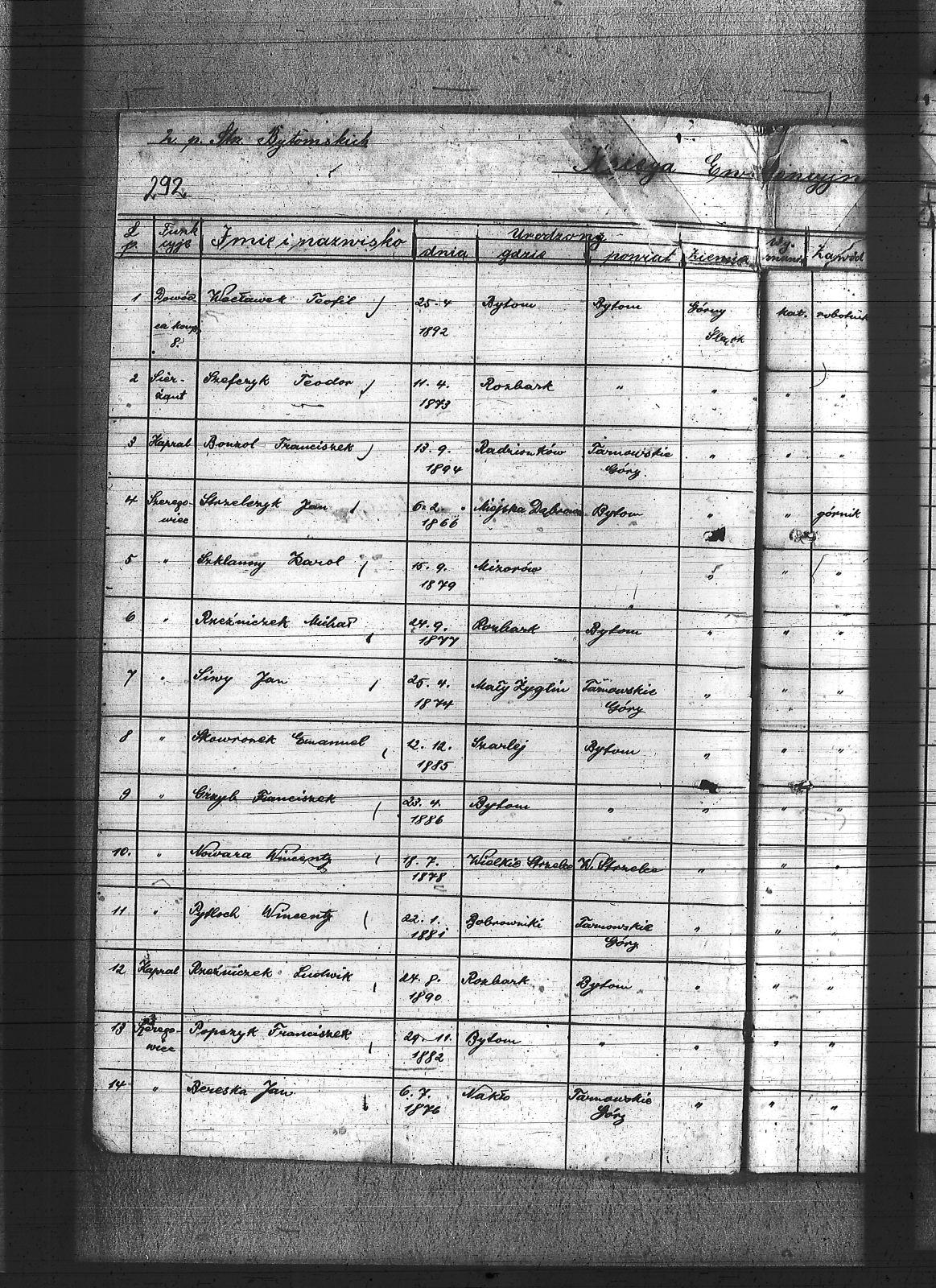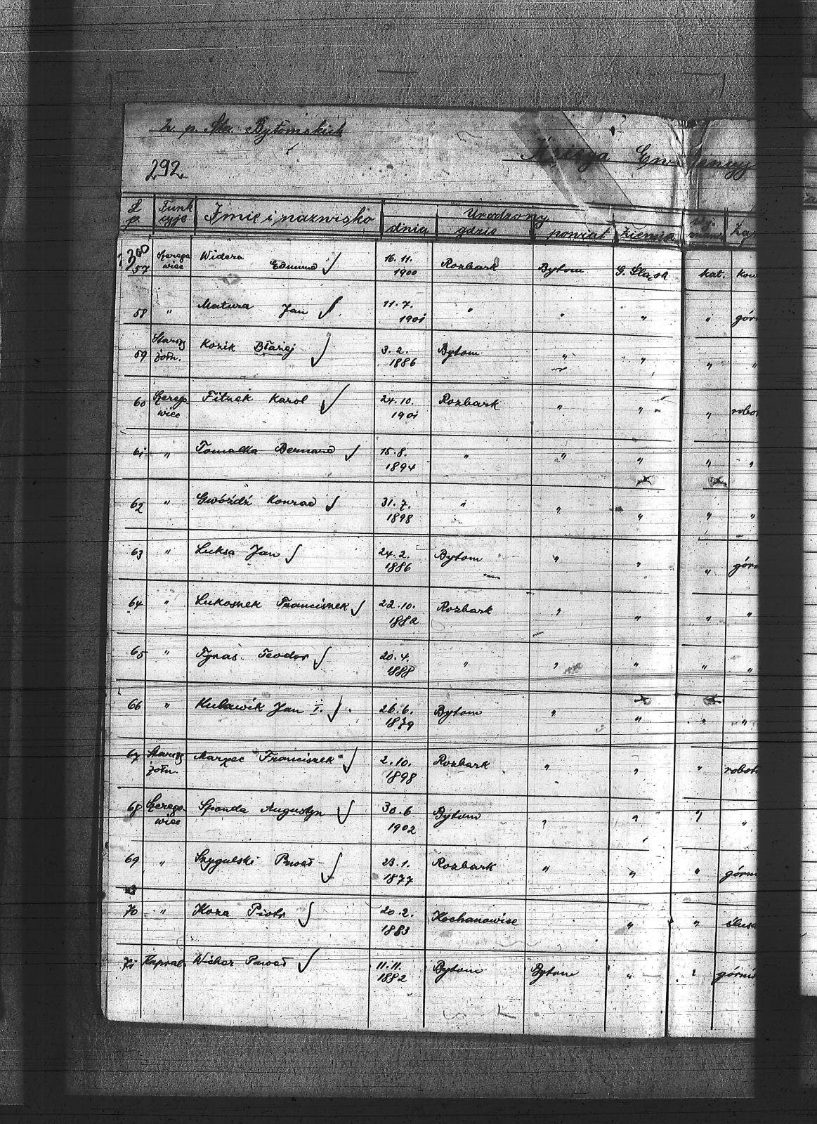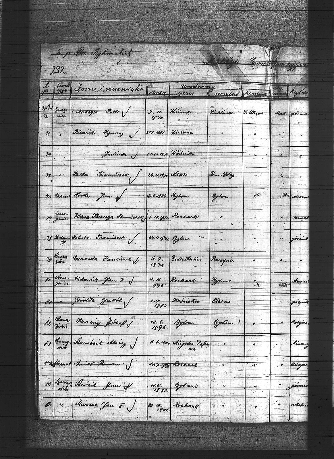 Anioł, Roman; Bedronka, Leopold; Bereska, Jan; Białas, Franciszek; Bonk, Jan; Bonzol, Franciszek; Borniak, Julian; Bujara, Robert; Charzewski, Czesław; Cieślik, Wincenty; Czaja, Wiktor; Czekaj, Konstanty; Czypionka, Wawrzyniec; Dej, Leopold; Drabczyk; Druch, Antoni; Dziewiór, Karol; Fitzek, Karol; Gatzka, Maksymilian; Gawenda, Franciszek; Görlitz, Jakub; Graniczny, Norbert; Grzyb, Franciszek; Gwóźdź, Konrad; Kamiński, Ludwik; Karolik, Mikołaj; Karuga, Franciszek; Karuga, Paweł; Kempa, Antoni; Koczur, Paweł; Kowoll, Franciszek; Koza, Piotr; Kozik, Alojzy; Kozik, Błażej; Krasny, Józef; Kudella, Paweł; Kulawik, Jan I; Kulawik, Jan II; Kulawik, Wincenty; Labus, Robert; Lortz, Jan; Ludyga, Paweł; Lukoszek, Franciszek; Luksa, Jan; Łukaszczyk, Józef; Łukaszczyk, Paweł; Łukawski, Jan; Maksysa, Piotr; Marzec, Franciszek; Marzec, Jan II; Matura, Jan; Michla, Jan; Mizera, Wawrzyniec; Nowara, Wincenty; Pańczyk, Karol; Piekarz, Wojciech; Pieprzytza, Andrzej; Pietrzykowski, Władysław; Pilarski, Ignacy; Pilarski, Juliusz; Podbioł, Piotr; Polla, Franciszek; Poloczek, Robert; Popczyk, Franciszek; Pytloch, Wincent; Rogula, Teodor; Rzeźniczek, Ludwik; Rzeźniczek, Michał; Sadowski, Paweł; Schneider, Teodor; Siwy, Emanuel; Siwy, Jan; Skotarski, Maciej; Skowronek, Emanuel; Smyła, Piotr; Sobota, Franciszek; Sosna, Paweł; Sponda, Augustyn; Stanek, Karol; Stanulczyk, Feliks; Starościk, Alojzy; Strózik, Jan; Strzelczyk, Jan; Strzelecki, Bolesław; Szczygioł, Paweł; Szewczyk, Teodor; Szklanny, Karol; Szweda, Franciszek; Szygulski, Paweł; Tietz, Jerzy; Tomalka, Bernard; Trocha, Edward; Tyraś, Teodor; Ujma, Wiktor; Wacławek, Teofil; Wicher, Antoni; Wicher, Paweł; Widera; Widera, Edmund; Wiktor, Franciszek; Wiza, Wincenty; Wrona, Ignacy; Żok, Józef; Żydek, Józef; |