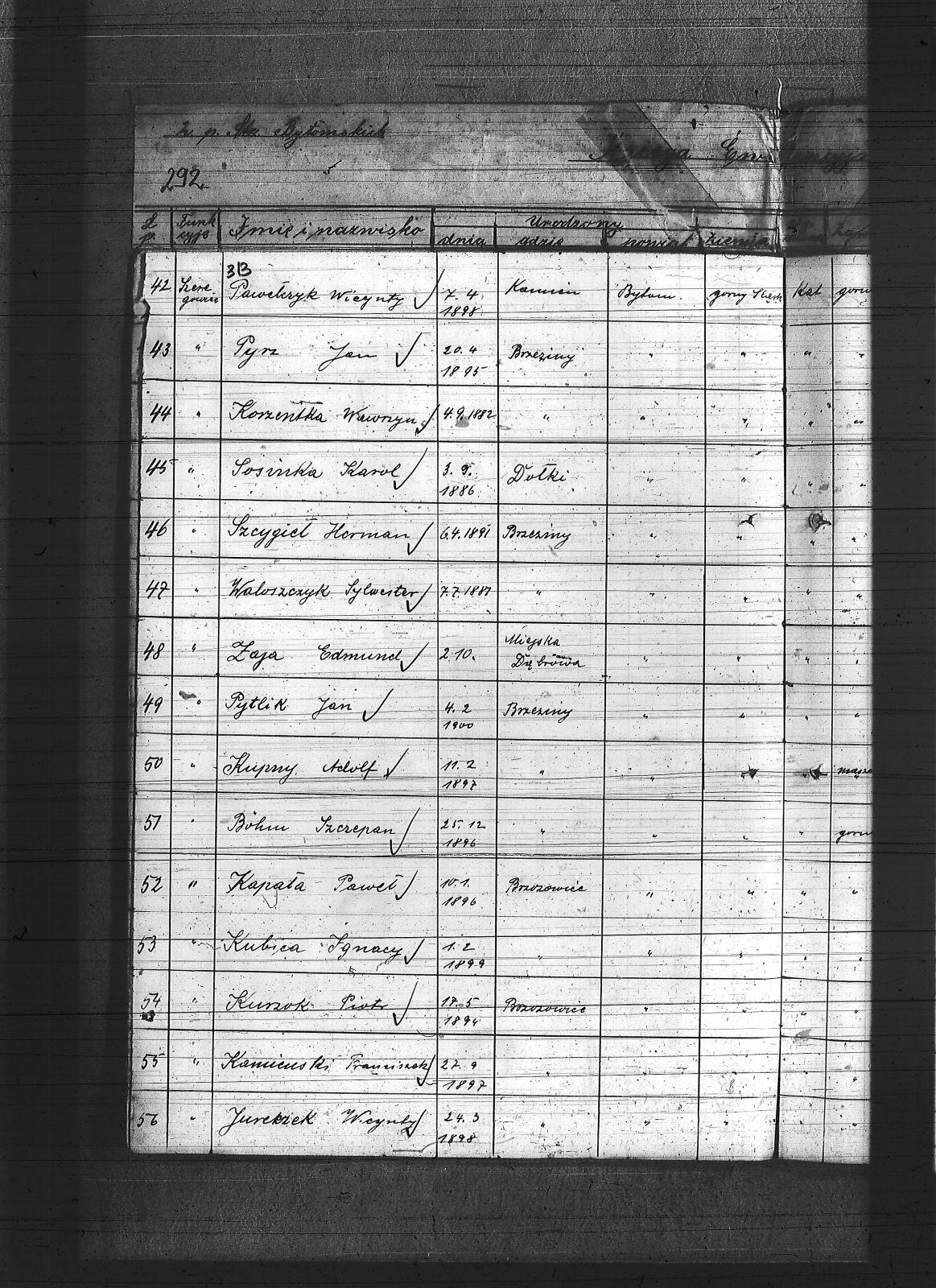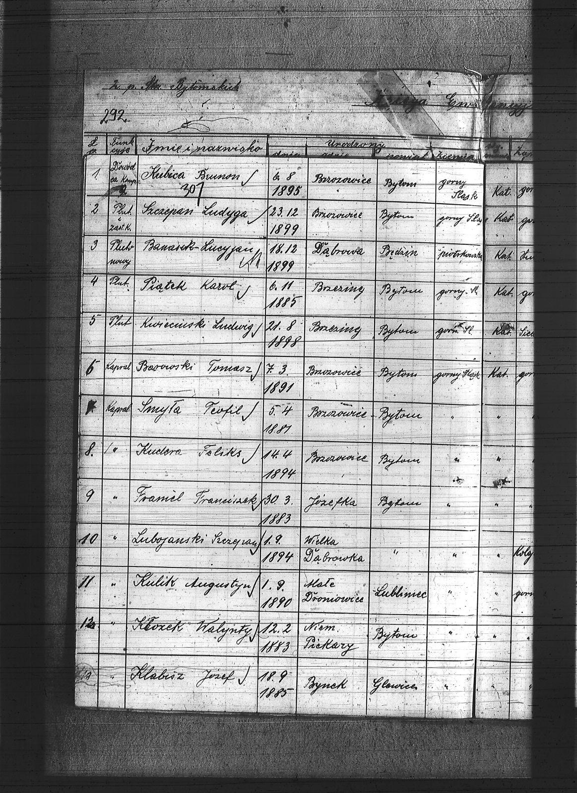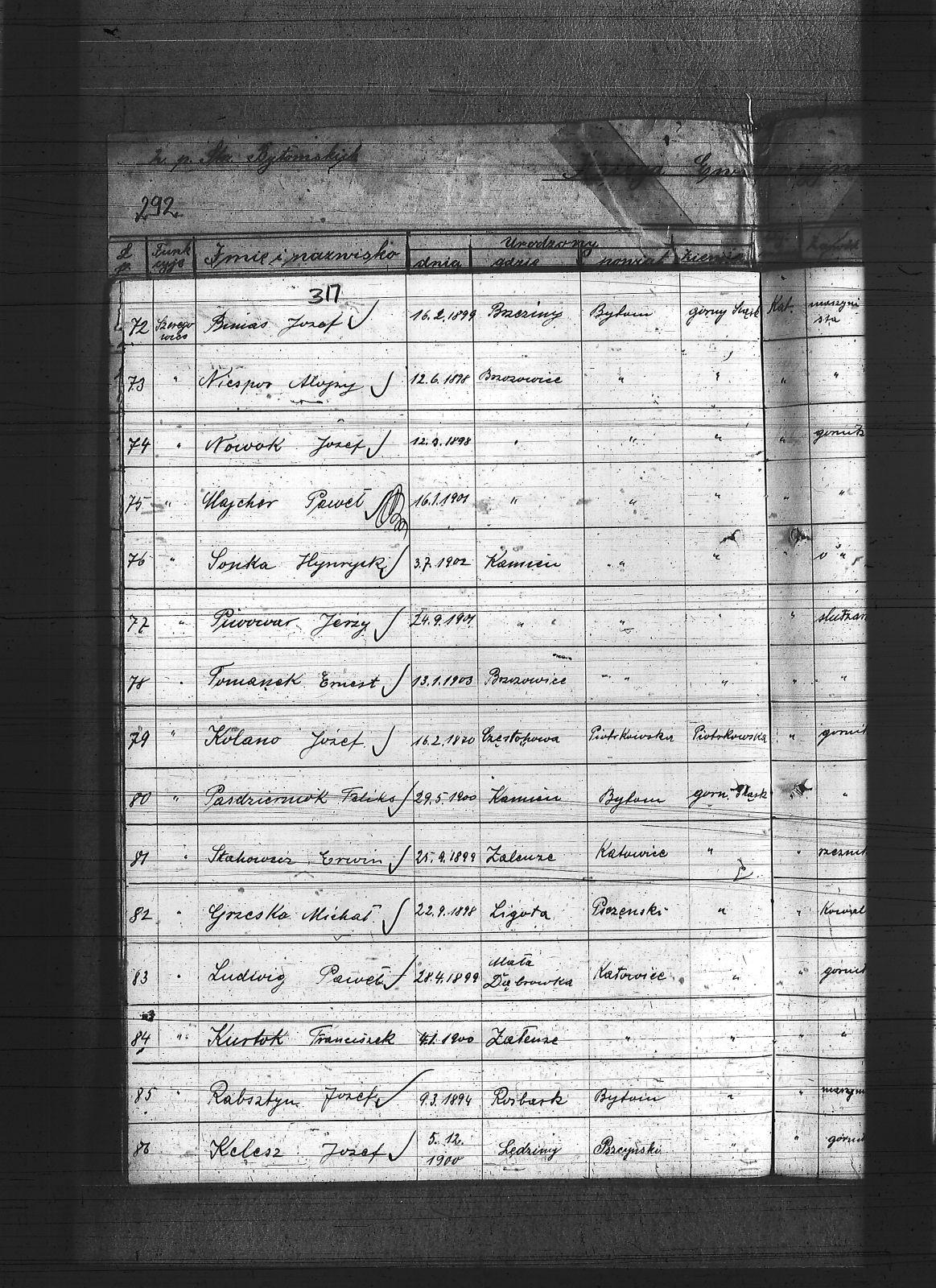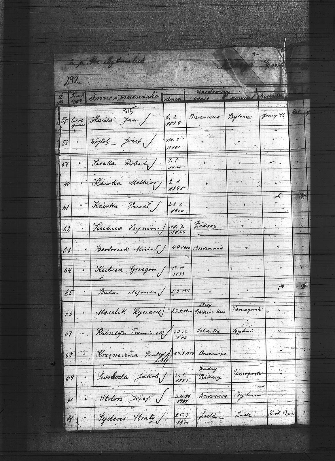 Anioł, Herman; Banasik, Lucjan; Baron, Mikołaj; Barowski, Tomasz; Bartoszek, Michał; Bebok, Wojciech; Białas, Karol; Binas, Teodor; Binias, Józef; Bobiolka, Ignacy; Bogacz, Józef; Bohm, Szczepan; Bula, Alfons; Cichowski, Teodor; Cuber, Józef; Duda, Antoni; Dunin, Antoni; Franiel, Franciszek; Franielczyk, Alojzy; Franielczyk, Mikołaj; Głogowski, Wincenty; Grzeska, Michał; Haida, Jan; Hupnia, Ryszard; Janosik, Zygmunt; Jureczek, Wincenty; Kaczmarczyk, Franciszek; Kamieński, Franciszek; Kapała, Ignacy; Kapała, Paweł; Kaps, Wilhelm; Kawka, Melchior; Kawka, Paweł; Kelesz, Józef; Kempiński, Piotr; Klabisz, Józef; Kloza, Paweł; Kłozek, Walenty; Kolano, Józef; Kolano, Konrad; Korzentka, Wawrzyn; Kot, Herman; Król, Jerzy; Krzęnciesza, Piotr; Kubica, Adolf; Kubica, Brunon; Kubica, Grzegorz; Kubica, Ignacy; Kubica, Jan; Kudera, Feliks; Kukna, Szymon; Kulik, Augustyn; Kupny, Adolf; Kurtok, Franciszek; Kurzok, Piotr; Kustorz, Franciszek; Kwieciński, Ludwig; Lapok, Alojzy; Lasok, Franciszek; Latocha, Józef; Liszka, Robert; Liwowski, Szymon; Lizurek, August; Lubojański, Szczepan; Ludwig, Paweł; Ludyga, Szczepan; Majcher, Paweł; Malecz, Ryszard; Maselik, Ryszard; Mathejczyk, Maksymilian; Modrzelewski, Stanisław; Musioł, Franciszek; Niespor, Alojzy; Nowok, Józef; Ogara, Józef; Paśdziernik, Feliks; Pawełczyk, Wincenty; Pelka, Jan; Pelka, Józef; Piątek, Karol; Piwowar, Jerzy; Pośpiech, Jan; Ptaszek, Jan; Ptaszek, Teodor; Pyrz, Jan; Pytlik, Jan; Rabsztyn, Franciszek; Rabsztyn, Józef; Rudy, Igancy; Serafiński, Józef; Sideris, Mikołaj; Skrzypek, Wiktor; Smyła, Teofil; Sonka, Henryk; Sosinka, Karol; Stachowicz, Ernest; Stakowicz, Erwin; Stasek, Piotr; Stasek, Wawrzyn; Stolorz, Józef; Swoboda, Jakub; Syderis, Straty; Szczygieł, Herman; Szeja, Bernard; Sznug, Leon; Szwajnoch; Świtała, Franciszek; Tomanek, Ernest; Walaszek, Piotr; Waloszczyk, Joachim; Waloszczyk, Stanisław; Waloszczyk, Sylwester; Warwas, Jakub; Widera, Jan; Włoczek, Szczepan; Wojczik, Szczepan; Wojtol, Józef; Wylczałek, ; Zaja, Edmund; Złotoś, Ryszard; |