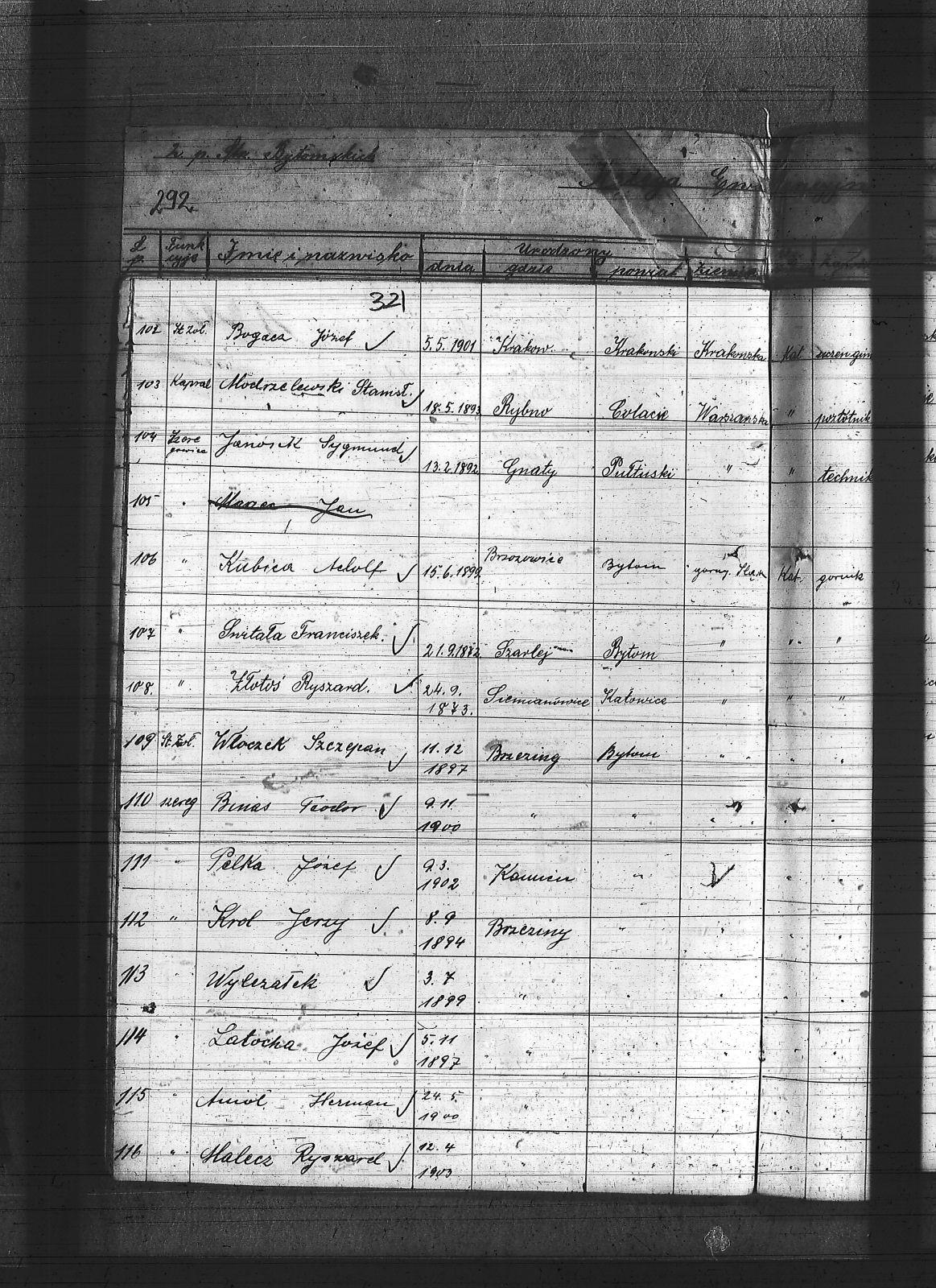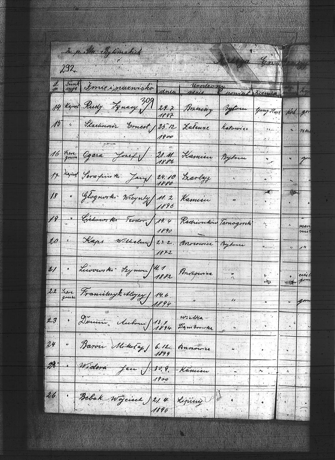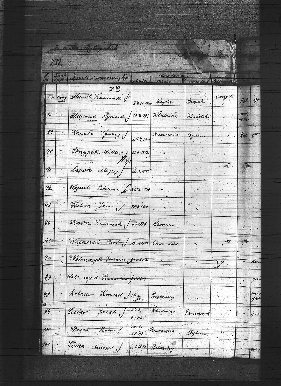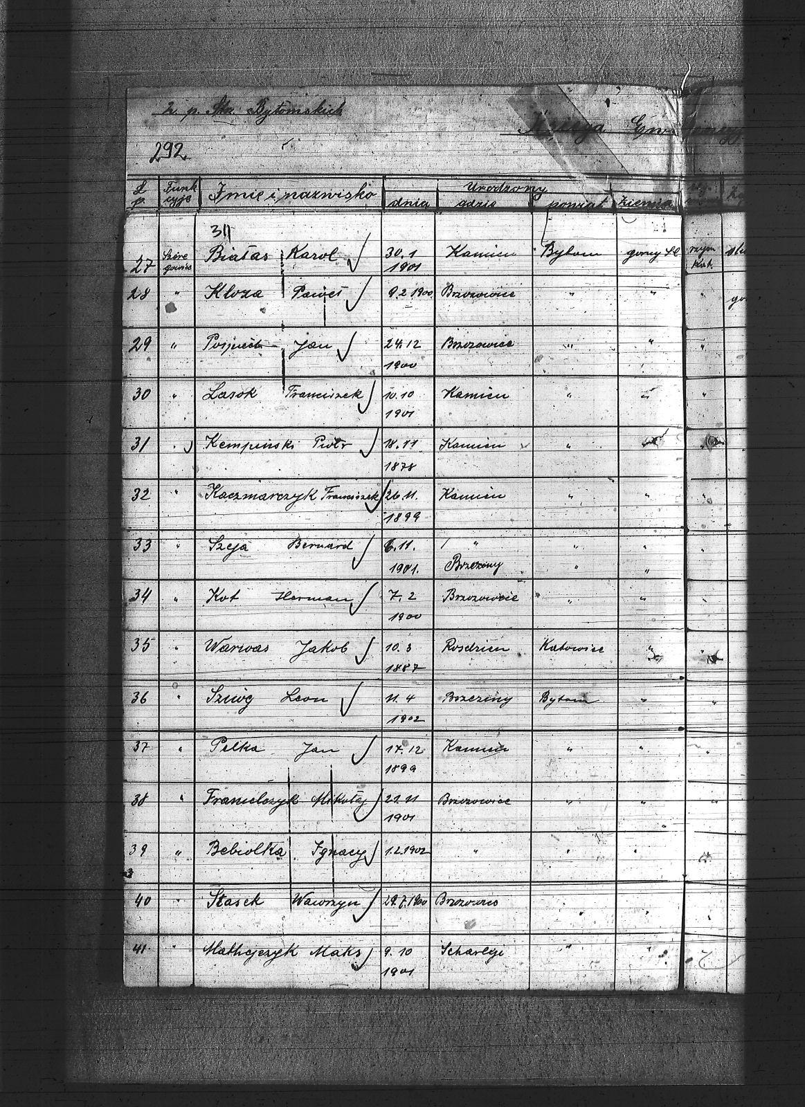 Anioł, Herman; Banasik, Lucjan; Baron, Mikołaj; Barowski, Tomasz; Bartoszek, Michał; Bebok, Wojciech; Białas, Karol; Binas, Teodor; Binias, Józef; Bobiolka, Ignacy; Bogacz, Józef; Bohm, Szczepan; Bula, Alfons; Cichowski, Teodor; Cuber, Józef; Duda, Antoni; Dunin, Antoni; Franiel, Franciszek; Franielczyk, Alojzy; Franielczyk, Mikołaj; Głogowski, Wincenty; Grzeska, Michał; Haida, Jan; Hupnia, Ryszard; Janosik, Zygmunt; Jureczek, Wincenty; Kaczmarczyk, Franciszek; Kamieński, Franciszek; Kapała, Ignacy; Kapała, Paweł; Kaps, Wilhelm; Kawka, Melchior; Kawka, Paweł; Kelesz, Józef; Kempiński, Piotr; Klabisz, Józef; Kloza, Paweł; Kłozek, Walenty; Kolano, Józef; Kolano, Konrad; Korzentka, Wawrzyn; Kot, Herman; Król, Jerzy; Krzęnciesza, Piotr; Kubica, Adolf; Kubica, Brunon; Kubica, Grzegorz; Kubica, Ignacy; Kubica, Jan; Kudera, Feliks; Kukna, Szymon; Kulik, Augustyn; Kupny, Adolf; Kurtok, Franciszek; Kurzok, Piotr; Kustorz, Franciszek; Kwieciński, Ludwig; Lapok, Alojzy; Lasok, Franciszek; Latocha, Józef; Liszka, Robert; Liwowski, Szymon; Lizurek, August; Lubojański, Szczepan; Ludwig, Paweł; Ludyga, Szczepan; Majcher, Paweł; Malecz, Ryszard; Maselik, Ryszard; Mathejczyk, Maksymilian; Modrzelewski, Stanisław; Musioł, Franciszek; Niespor, Alojzy; Nowok, Józef; Ogara, Józef; Paśdziernik, Feliks; Pawełczyk, Wincenty; Pelka, Jan; Pelka, Józef; Piątek, Karol; Piwowar, Jerzy; Pośpiech, Jan; Ptaszek, Jan; Ptaszek, Teodor; Pyrz, Jan; Pytlik, Jan; Rabsztyn, Franciszek; Rabsztyn, Józef; Rudy, Igancy; Serafiński, Józef; Sideris, Mikołaj; Skrzypek, Wiktor; Smyła, Teofil; Sonka, Henryk; Sosinka, Karol; Stachowicz, Ernest; Stakowicz, Erwin; Stasek, Piotr; Stasek, Wawrzyn; Stolorz, Józef; Swoboda, Jakub; Syderis, Straty; Szczygieł, Herman; Szeja, Bernard; Sznug, Leon; Szwajnoch; Świtała, Franciszek; Tomanek, Ernest; Walaszek, Piotr; Waloszczyk, Joachim; Waloszczyk, Stanisław; Waloszczyk, Sylwester; Warwas, Jakub; Widera, Jan; Włoczek, Szczepan; Wojczik, Szczepan; Wojtol, Józef; Wylczałek, ; Zaja, Edmund; Złotoś, Ryszard; |