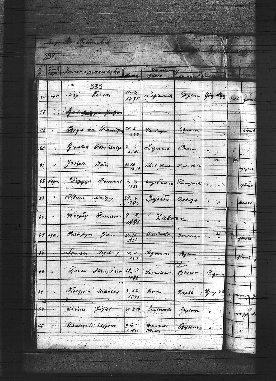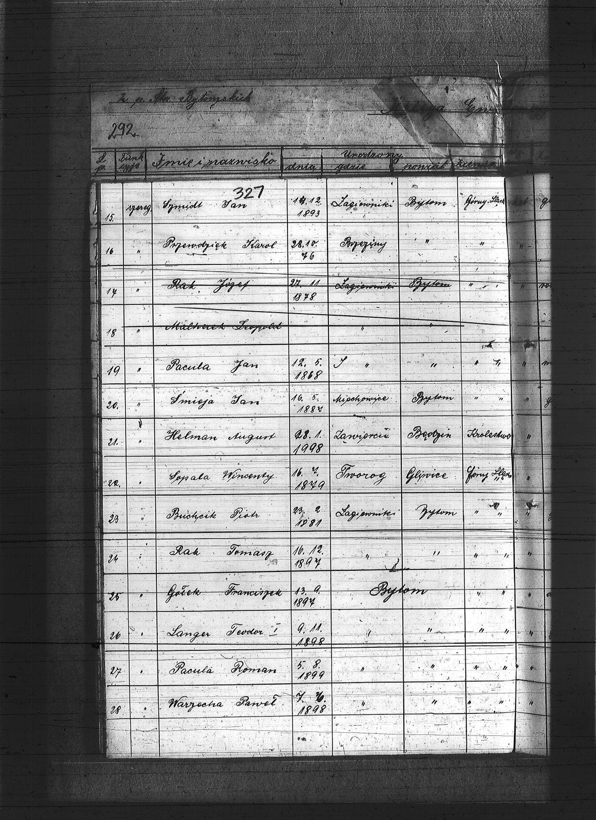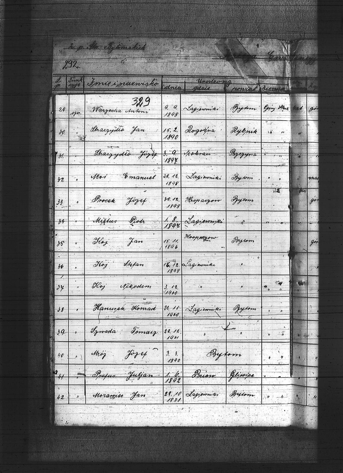 Bonk, Jerzy; Brzoska, Franciszek; Buchcik, Piotr; Cech, Paweł; Donerstag, Franciszek; Drzyzga, Konstanty; Gawlik, Konstanty; Gołek, Franciszek; Grodlewski, Czesław; Hajduga, Ludwik; Hanusek, Konrad; Helman, August; Honiz, Jan; Hyla, Alojzy; Jendrysek, Adolf; Jońca, Jan; Jońca, Norbert; Kaczmarek, Wiktor; Kempiński, Józef; Kisiel, Stanisław; Klain, Alojzy; Klimanek, Emil; Koj, Jan; Koj, Nikodem; Koj, Stefan; Koj, Tomasz; Korus, Jan; Kosok, Paweł; Kotyś, August; Krystanek, Ignacy; Langer, Józef; Langer, Paweł; Langer, Teodor; Langer, Teodor I; Lis, Walenty; Macherek, Leopold; Malherek, Ignacy; Malysek, Paweł; Manowski, Alfons; Marzecki, Eugeniusz; Matera, Józef; Miętus, Piotr; Morawiec, Jan; Moś, Emanuel; Moś, Teofil; Mróz, Józef; Niczer, Tomasz; Niestroj, Franciszek; Nieszpor, Józef; Nieszpor, Mikołaj; Obruśnik, Józef; Pacula, Emil; Pacula, Jan; Pacula, Roman; Palica, Henryk; Pałek, Robert; Parucha, Jan; Piechota, Andrzej; Poloczek, Alfons; Procek, Józef; Profus, Julian; Pruski, Walenty; Przewdzięk, Karol; Rabsztyn, Jan; Rak, Edmund; Rak, Józef; Rak, Teofil; Rak, Tomasz; Sopala, Wincenty; Sośnica, Piotr; Stania, Józef; Straszydło, Jan; Straszydło, Józef; Szewczyk, Herman; Szkalec, Tomasz; Szmidt, Jan; Szuba, Franciszek; Szweda, Jan; Szweda, Tomasz; Szyndzielorz, Jan; Śmieja, Jan; Świętek, Franciszek; Świętek, Stanisław; Ticner, Stanisław; Tokarz, Teofil; Warzecha, Antoni; Warzecha, Paweł; Wesoły, Antoni; Wesoły, Roman; Wojtala, Józef; Wolny, Sylwester; Wróbel, Franciszek; Złotecki, Konrad; |