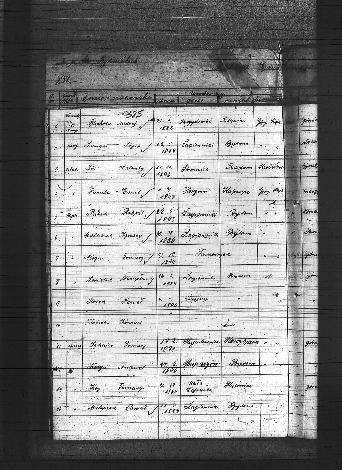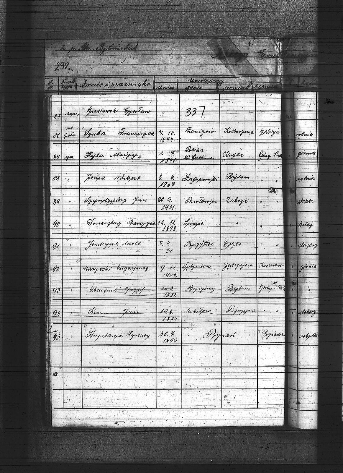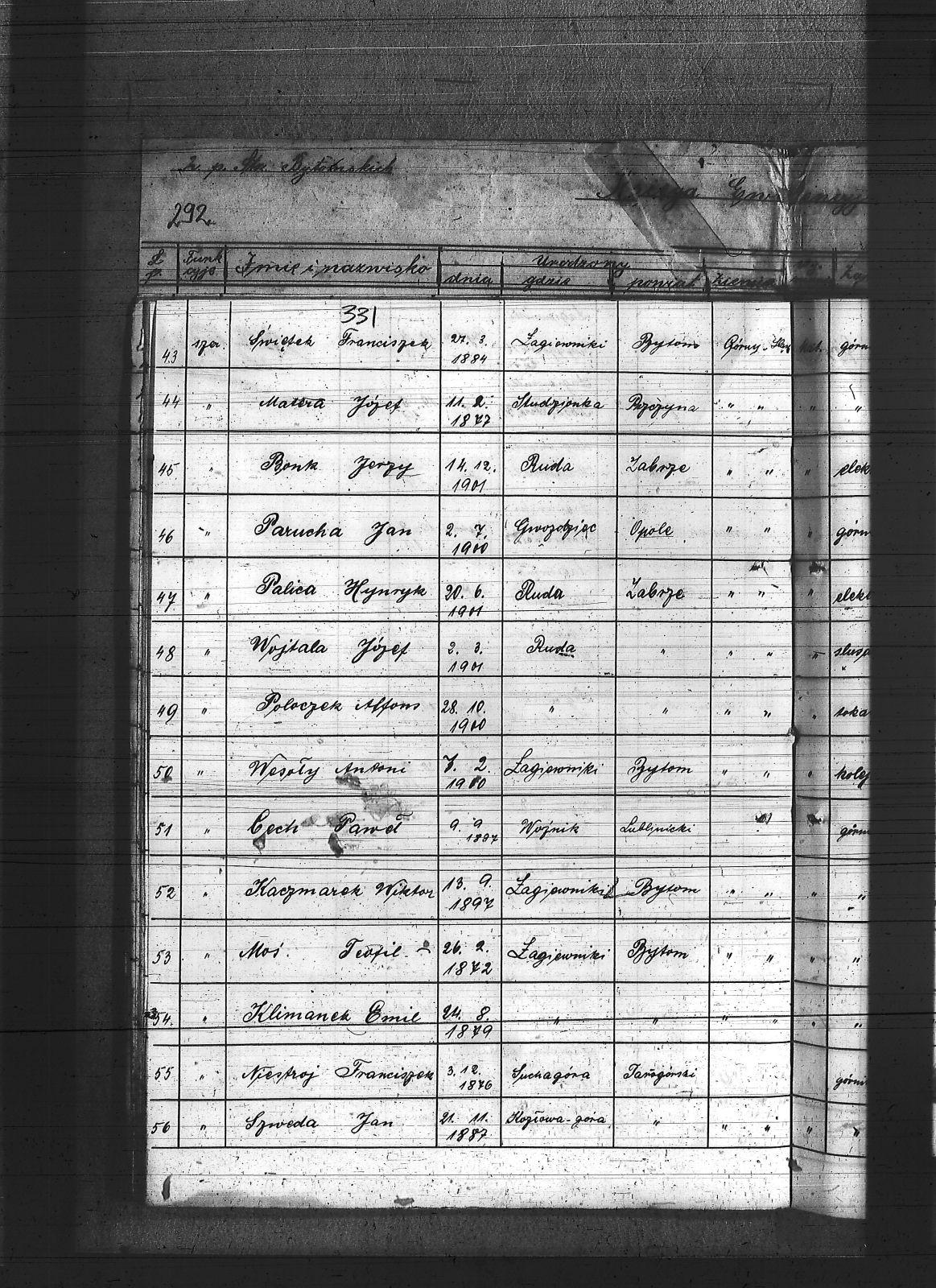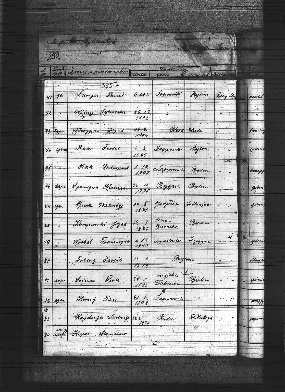 Bonk, Jerzy; Brzoska, Franciszek; Buchcik, Piotr; Cech, Paweł; Donerstag, Franciszek; Drzyzga, Konstanty; Gawlik, Konstanty; Gołek, Franciszek; Grodlewski, Czesław; Hajduga, Ludwik; Hanusek, Konrad; Helman, August; Honiz, Jan; Hyla, Alojzy; Jendrysek, Adolf; Jońca, Jan; Jońca, Norbert; Kaczmarek, Wiktor; Kempiński, Józef; Kisiel, Stanisław; Klain, Alojzy; Klimanek, Emil; Koj, Jan; Koj, Nikodem; Koj, Stefan; Koj, Tomasz; Korus, Jan; Kosok, Paweł; Kotyś, August; Krystanek, Ignacy; Langer, Józef; Langer, Paweł; Langer, Teodor; Langer, Teodor I; Lis, Walenty; Macherek, Leopold; Malherek, Ignacy; Malysek, Paweł; Manowski, Alfons; Marzecki, Eugeniusz; Matera, Józef; Miętus, Piotr; Morawiec, Jan; Moś, Emanuel; Moś, Teofil; Mróz, Józef; Niczer, Tomasz; Niestroj, Franciszek; Nieszpor, Józef; Nieszpor, Mikołaj; Obruśnik, Józef; Pacula, Emil; Pacula, Jan; Pacula, Roman; Palica, Henryk; Pałek, Robert; Parucha, Jan; Piechota, Andrzej; Poloczek, Alfons; Procek, Józef; Profus, Julian; Pruski, Walenty; Przewdzięk, Karol; Rabsztyn, Jan; Rak, Edmund; Rak, Józef; Rak, Teofil; Rak, Tomasz; Sopala, Wincenty; Sośnica, Piotr; Stania, Józef; Straszydło, Jan; Straszydło, Józef; Szewczyk, Herman; Szkalec, Tomasz; Szmidt, Jan; Szuba, Franciszek; Szweda, Jan; Szweda, Tomasz; Szyndzielorz, Jan; Śmieja, Jan; Świętek, Franciszek; Świętek, Stanisław; Ticner, Stanisław; Tokarz, Teofil; Warzecha, Antoni; Warzecha, Paweł; Wesoły, Antoni; Wesoły, Roman; Wojtala, Józef; Wolny, Sylwester; Wróbel, Franciszek; Złotecki, Konrad; |
