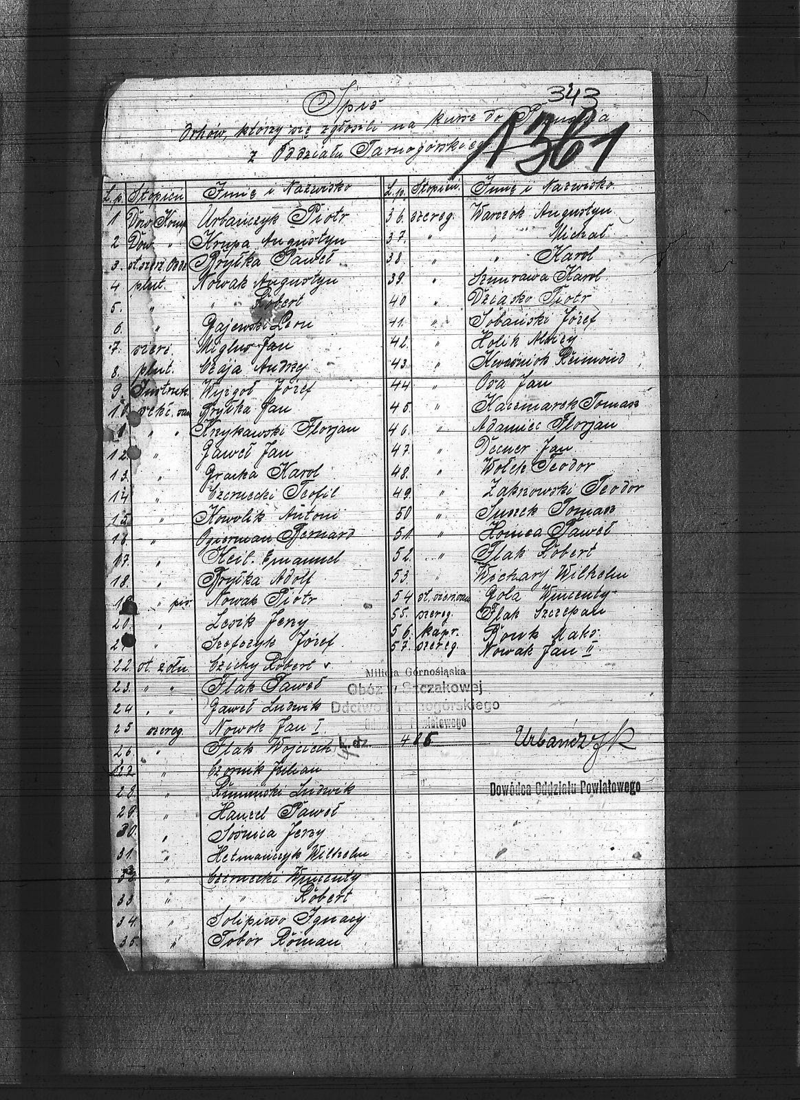 Adamiec, Florian; Bonk, Maksymilian; Bryłka, Adolf; Bryłka, Jan; Bryłka, Paweł; Czernecki, Teofil; Czerniecki, Robert; Czerniecki, Wincenty; Czichy, Robert; Czornik, Julian; Decner, Jan; Dziąsko, Piotr; Flak, Paweł; Flak, Robert; Flak, Szczepan; Flak, Wojciech; Gajewski, Leon; Gaweł, Jan; Gaweł, Ludwik; Gola, Wincenty; Gracka, Karol; Hanzel, Paweł; Hetmańczyk, Wilhelm; Holik, Alojzy; Honica, Paweł; Kaczmarek, Tomasz; Keil, Emanuel; Kowolik, Antoni; Krupa, Augustyn; Krzykawski, Florian; Kwaśniok, Rajmund; Lesik, Jerzy; Miglus, Jan; Nowak, Augustyn; Nowak, Jan II; Nowak, Piotr; Nowak, Robert; Nowok, Jan I; Ogierman, Bernard; Osa, Jan; Ożaja, Andrzej; Rimiński, Ludwik; Sobański, Józef; Solipiwo, Ignacy; Sośnica, Jerzy; Suszek, Tomasz; Szefczyk, Józef; Sznurawa, Karol; Tobór, Roman; Urbańczyk, Piotr; Warczok, Augustyn; Warczok, Karol; Warczok, Michał; Wichary, Wilhelm; Wołek, Teodor; Wyżgoł, Józef; Zakrzowski, Teodor; |