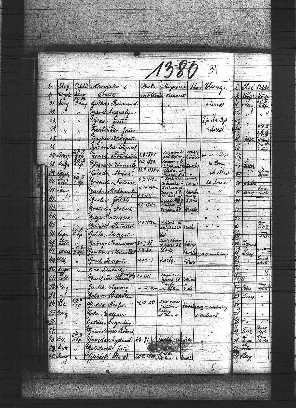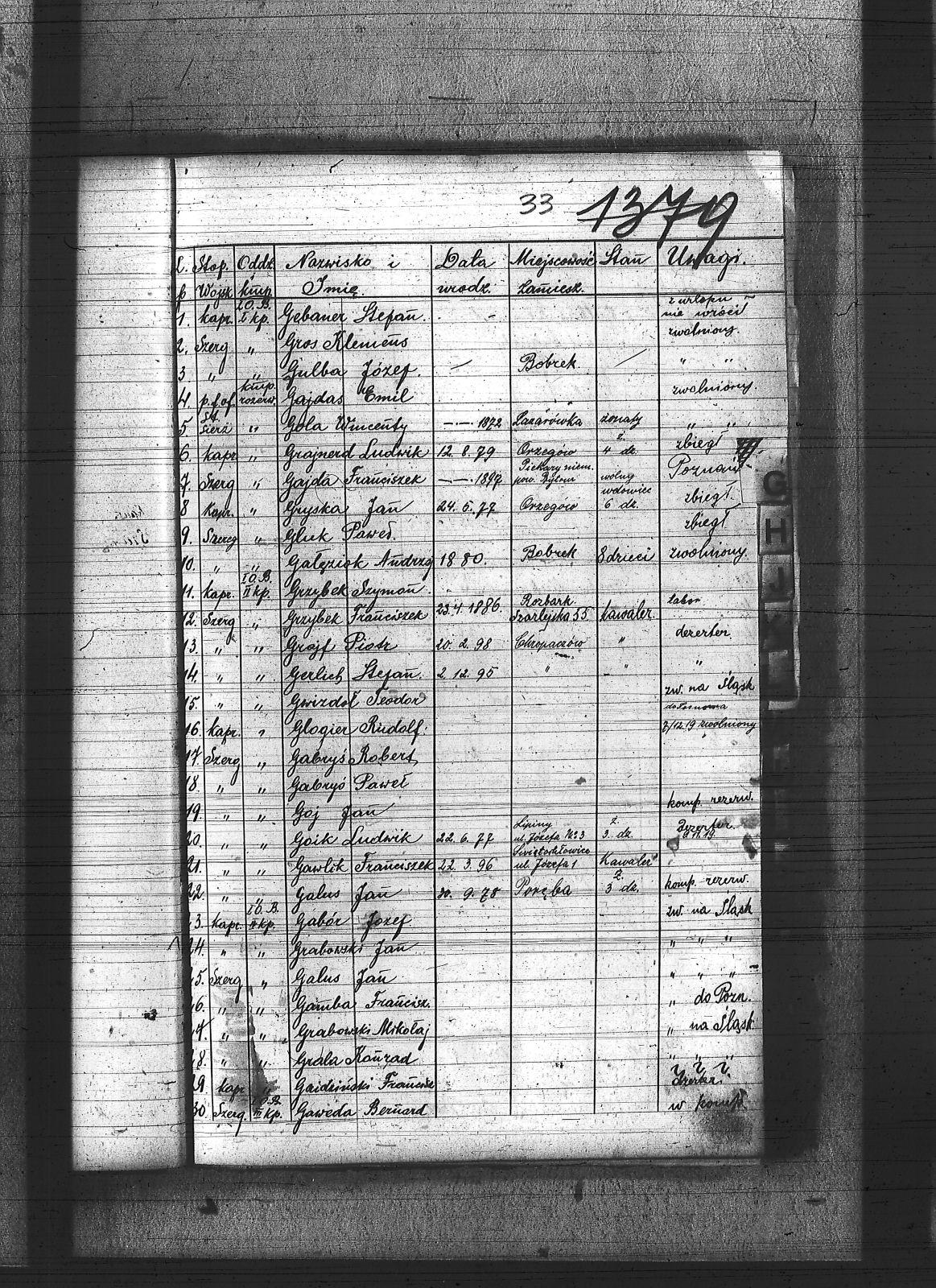 Gabór, Józef; Gabryś, Franciszek; Gabryś, Paweł; Gacka, Maksymilian; Gaidziński, Franciszek; Gajda, Franciszek; Gajdas, Emil; Gak, Jan; Galus, Jan; Gałbas, Reimund; Gałęziok, Andrzej; Gamba, Franciszek; Ganciorz, Antoni; Ganczyk, Kazimierz; Gasiniec, Roman; Gaś, Ludwik; Gaweda, Bernard; Gaweł, Augustyn; Gaweł, Jan; Gaweł, Ludwig; Gawenda, Franciszek; Gawęda, Paweł; Gawęda, Ryszard; Gawlik, Alojzy; Gawlik, Franciszek; Gawlik, Ignacy; Gawlik, Konstanty; Gazda, Augustyn; Gaździński, Franciszek; Gebaner, Stefan; Gebel, Stanisław; Gerlic, Jakub; Gerlich, Stefan; Giza, Jan; Glogier, Rudolf; Gluk, Paweł; Glüklich, Jan; Głodzik, Teofil; Głogowski, Wincenty; Gnioździosz, Robert; Goczoł, Józef; Goik, Ludwik; Goj, Jan; Goj, Józef; Goj, Paweł; Goj, Wilhelm; Gola, Szczepan; Gola, Wincenty; Golacz, Wilhelm; Golatowski, Jan; Golda, Szczepan; Golenia, Roman; Gołek, Franciszek; Gonczarek, Stanisław; Gonsiorczyk, Leon; Grabiński, Jan; Grabowski, Jan; Grabowski, Mikołaj; Gracka, Karol; Grajf, Piotr; Grajnerd, Ludwik; Grala, Konrad; Graniczny, Robert; Grodecki, Antoni; Grodecki, Józef; Grodon, Karol; Gros, Klemens; Gruca, Augustyn; Gruchała, Konstanty; Gryć, Józef; Gryska, Jan; Grzel, Szczepan; Grzeska, Michał; Grzomba, Wojciech; Grzyb, Franciszek; Grzybek, Franciszek; Grzybek, Szymon; Grzybez, Szczepan; Gudyś, Paweł; Gulba, Józef; Gut, Konrad; Gut, Władysław; Guzik, Jerzy; Gwizdała, Feliks; Gwizdoł, Teodor; Gwóźdź, Konrad; Gwóźdź, Paweł; |