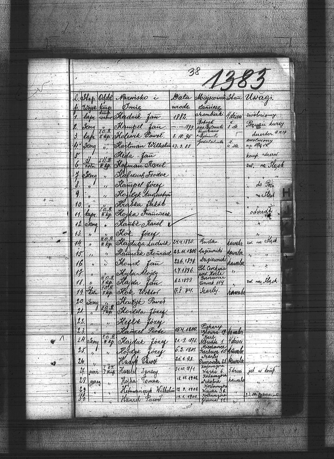 Haczyk, Paweł; Hadyk, Paweł; Hadzik, Jan; Hajda, Jan; Hajduga, Ludwik; Hajduk, Józef; Halczuch, Teodor; Hampel, Jan; Hampel, Józef; Hanke, Karol; Hanusek, Konrad; Hanzel, Ignacy; Hanzel, Paweł; Hanzel, Piotr; Harenek, Wacław; Hartman, Wilhelm; Heblik, Augustyn; Heda, Jan; Heflik, Józef; Hercog, Andrzej; Herok, Antoni; Hetmańczyk, Wilhelm; Hoczela, Józef; Hofman, Karol; Hojczyk, Augustyn; Hojczyk, Józef; Hojka, Franciszek; Hojka, Tomasz; Hok, Józef; Hok, Wiktor; Holewik, Paweł; Holik, Alojzy; Holon, Paweł; Honcz, Jan; Hrabka, Jakób; Hyla, Alojzy; |