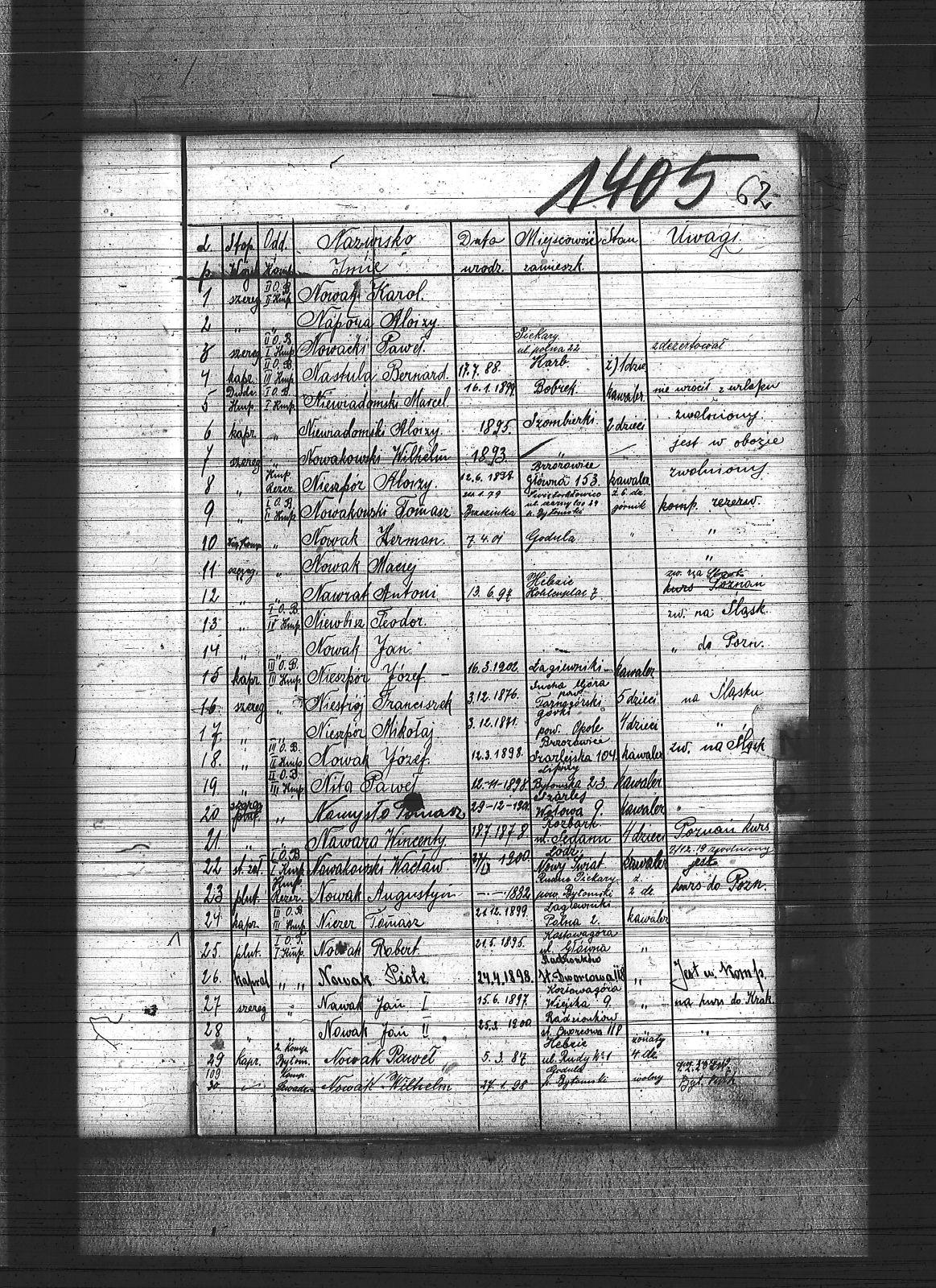 Namysło, Tomasz; Napora, Alojzy; Nastula, Bernard; Nawara, Wincenty; Nawrat, Antoni; Nawrat, Józef; Nawrat, Paweł; Nawrat, Robert; Nędza, Józef; Niestrój, Franciszek; Niesyto, Walenty; Nieszpór, Alojzy; Nieszpór, Józef; Nieszpór, Mikołaj; Niewbisz, Teodor; Niewiadomski, Alojzy; Niewiadomski, Marcel; Niezer, Tomasz; Nita, Paweł; Niwka, Aleksander; Nowacki, Józef; Nowacki, Paweł; Nowak, Augustyn; Nowak, Herman; Nowak, Jan; Nowak, Jan I; Nowak, Jan II; Nowak, Józef; Nowak, Karol; Nowak, Maciej; Nowak, Mateusz; Nowak, Paweł; Nowak, Piotr; Nowak, Robert; Nowak, Roman; Nowak, Wilhelm; Nowakowski, Tomasz; Nowakowski, Wacław; Nowakowski, Wilhelm; Nowogorski, Stanisław; |