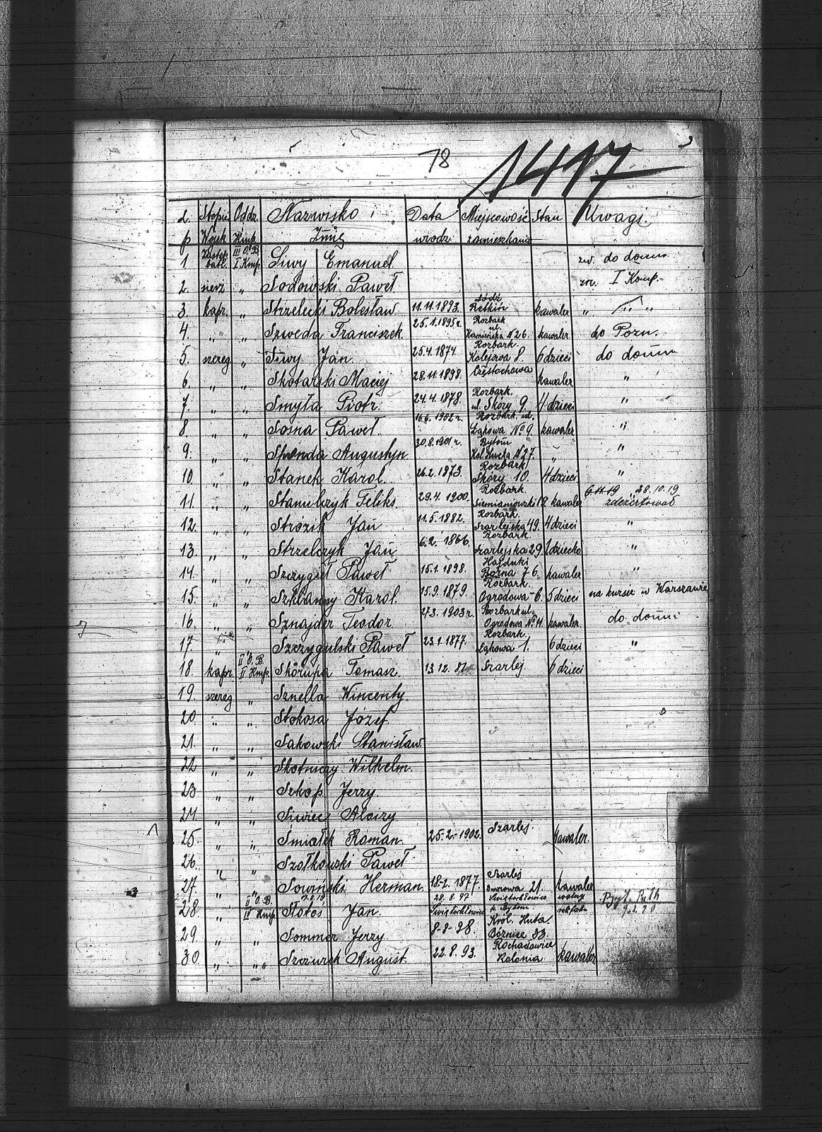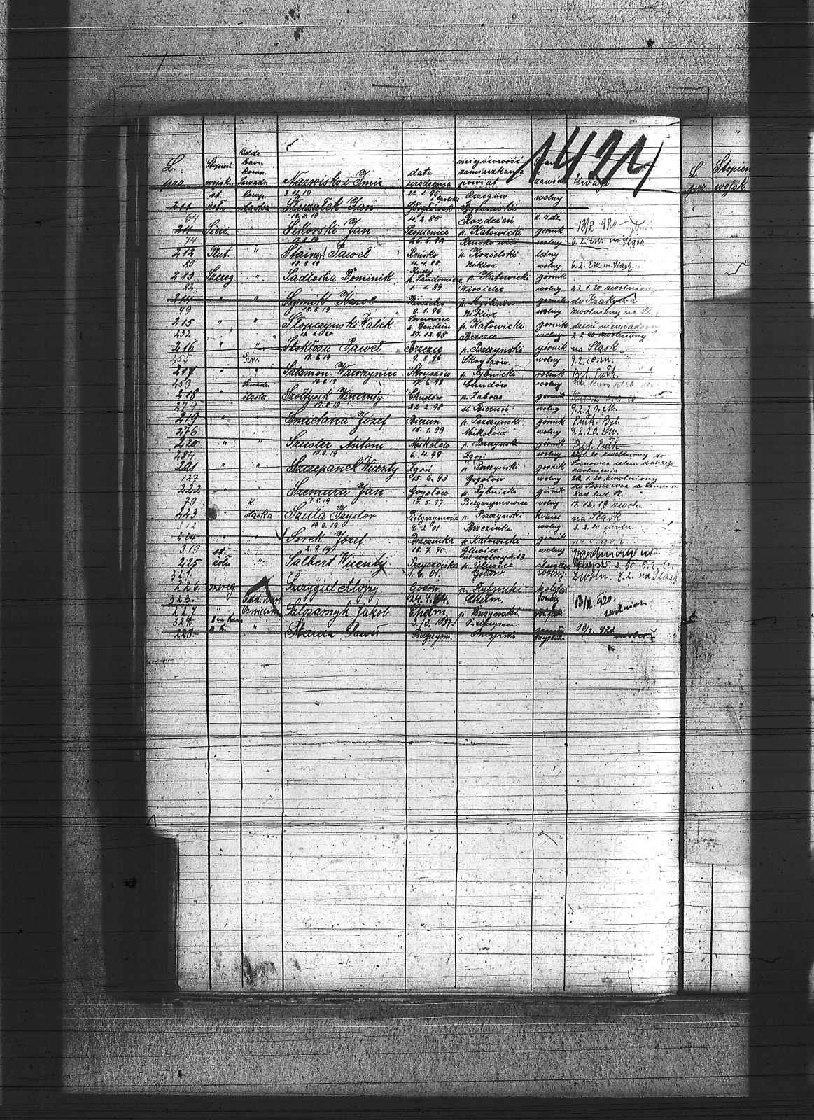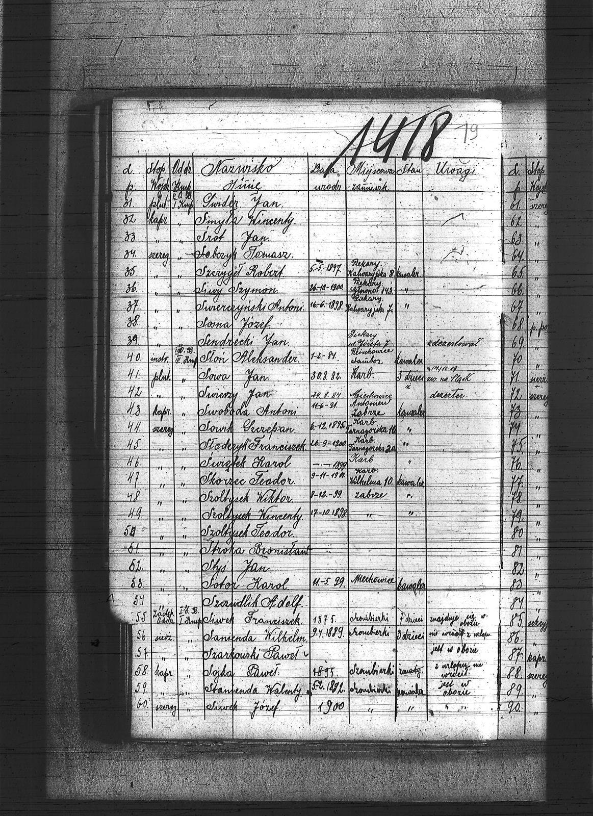 Sadłoska, Dominik; Sakowski, Stanisław; Salamon, Wawrzyniec; Salkert, Wincenty; Sanienda, Wilhelm; Sappa, Ryszard; Sarysz, Walter; Saternus, Franciszek; Saturn, Jan; Scheling, Kurt; Sempowski, ; Sendrecki, Jan; Serafiński, Jan; Sfronda, Agustyn; Siegel, Józef; Sieja, Bronisław; Siendzielorz, Edward; Sikora, Jan; Sikorski, Jan; Sitek, Jan; Siwek, Franciszek; Siwek, Józef; Siwiec, Alojzy; Siwy, Emanuel; Siwy, Franciszek; Siwy, Jan; Siwy, Leon; Siwy, Szymon; Siwy, Wincenty; Skiba, Antoni; Sklawski, Józef; Sklosz, Augustyn; Skorka, Franciszek; Skorupa, Tomasz; Skorzec, Teodor; Skotarski, Marcin; Skotniczy, Wilhelm; Skowronek, Augustyn; Skowronek, Emanuel; Skrzypek, Franciszek; Skrzypek, Wiktor; Skrzypiec, Tomasz; Skupin, Karol; Skutnik, Wilhelm; Slany, Franciszek; Słoboń, Franciszek; Słodyczyk, Franciszek; Słoń, Aleksander; Słopczyński, Walek; Słota, Paweł; Słowik, Jan; Słowiński, Henryk; Słupina, Ryszard; Służałek, Jan; Smykała, Jan; Smyla, Karol; Smyła, Piotr; Smyła, Teofil; Smyła, Wincenty; Sobański, Józef; Sobczyk, Tomasz; Sobczyk, Wilhelm; Sobecki, Antoni; Sobek, Juliusz; Sobota, Franciszek; Sodowski, Paweł; Sojka, Jan; Sojka, Paweł; Sokół, Jerzy; Solecki, Antoni; Solipiwo, Ignacy; Sommer, Jerzy; Sonka, Henryk; Sopala, Wincenty; Sorek, Jan; Sorek, Józef; Sornik, Wilhelm; Sosinka, Karol; Sosna, Józef; Sosna, Paweł; Sosna, Wiktor; Sosz, Tomasz; Sośnica, Piotr; Sotor, Karol; Sowa, Aleksy; Sowa, Jan; Sowa, Piotr; Sowik, Szczepan; Sowiński, Herman; Stach, Jan; Stachowicz, Ernest; Stachowicz, Erwin; Stachura, Franciszek; Stachura, Józef; Stainert, Paweł; Stalmach, Rainchold; Stanek, Karol; Stanek, Piotr; Stania, Józef; Stania, Paweł; Stanienda, Jan; Stanienda, Walenty; Staszek, Wawrzyn; Stawik, Jan; Stein, Paweł; Stokłosa, Paweł; Stokłosa, Piotr; Stokosa, Józef; Stokoś, Jan; Stolarz, Józef; Stolka, Karol; Stonulczyk, Feliks; Stosik, Romuald; Straszydło, Józef; Stroba, Leopold; Stroka, Bronisław; Stroka, Józef; Strózik, Jan; Struzik, Marcin; Strzelczyk, Jan; Strzelecki, Bolesław; Strzępa, Franciszek; Styś, Alojzy; Styś, Augustyn; Styś, Jan; Suchanek, Maksym; Sucharowski, Emanuel; Sucharowski, Józef; Suszek, Tomasz; Suzarek, Antoni; Swiaczny, Jan; Swider, Błażej; Swider, Teofil; Swierczek, Stefan; Swierczy, Jan; Swierczyna, Piotr; Swist; Switula, Hubert; Swoboda, Antoni; Swoboda, Jakób; Syderys, [nieczytelne]; Symieszczyk, Piotr; Szarkowski, Pawel; Szatek, Emanuel; Szatek, Paweł; Szczepanek, Wincenty; Szczudlik, Adolf; Szczurek, August; Szczygieł, Alojzy; Szczygieł, Andrzej; Szczygieł, Herman; Szczygieł, Paweł; Szczygieł, Robert; Szczygulski, Paweł; Szefczyk, Wilhelm; Szeja, Antoni; Szeja, Bernard; Szeja, Franciszek; Szeja, Wojciech; Szemura, Jan; Szendzielorz, Jan; Szewczyk, Augustyn; Szewczyk, Herman; Szewczyk, Teodor; Szewerda, Teodor; Szier, Emil; Szkalec, Tomasz; Szklanny, Karol; Szkop, Jerzy; Szlęga, Aleksy; Szlęga, Jan; Szlosarczyk, Jakub; Szmaga, Tomasz; Sznajder, Teodor; Sznella, Wincenty; Szoblicki, Wilhelm; Szoltysek, Teodor; Szoltysek, Wiktor; Szoltysek, Wincenty; Szołkowski, Paweł; Szołtysik, Ludwik; Szołtysik, Wincenty; Szołytsik, Józef; Szombierski, Jakub; Szopa, Wincenty; Szprenc, Wincenty; Szromek, Alojzy; Szrot, Piotr; Sztetinus, Józef; Sztych, Wincenty; Szubert, Józef; Szulc, Frydrych; Szuła, Izydor; Szuster, Antoni; Szwajnoch; Szwajnoch, Paweł; Szweda, Franciszek; Szweda, Jan; Szwoczyk, Józef; Szyderys, Mikołaj; Szymik, Karol; Szymonek, Piotr; Szyndera, Józef; Ścigała, Karol; Śmiałek, Roman; Śmieja, Jan; Śmietana, Józef; Śrot, Jan; Świder, Jan; Świerczyński, Antoni; Świerzy, Jan; Świętek, Franciszek; Świętek, Karol; Świętek, Stanisław; Świstała, Franciszek; Świtała, Teodor; |