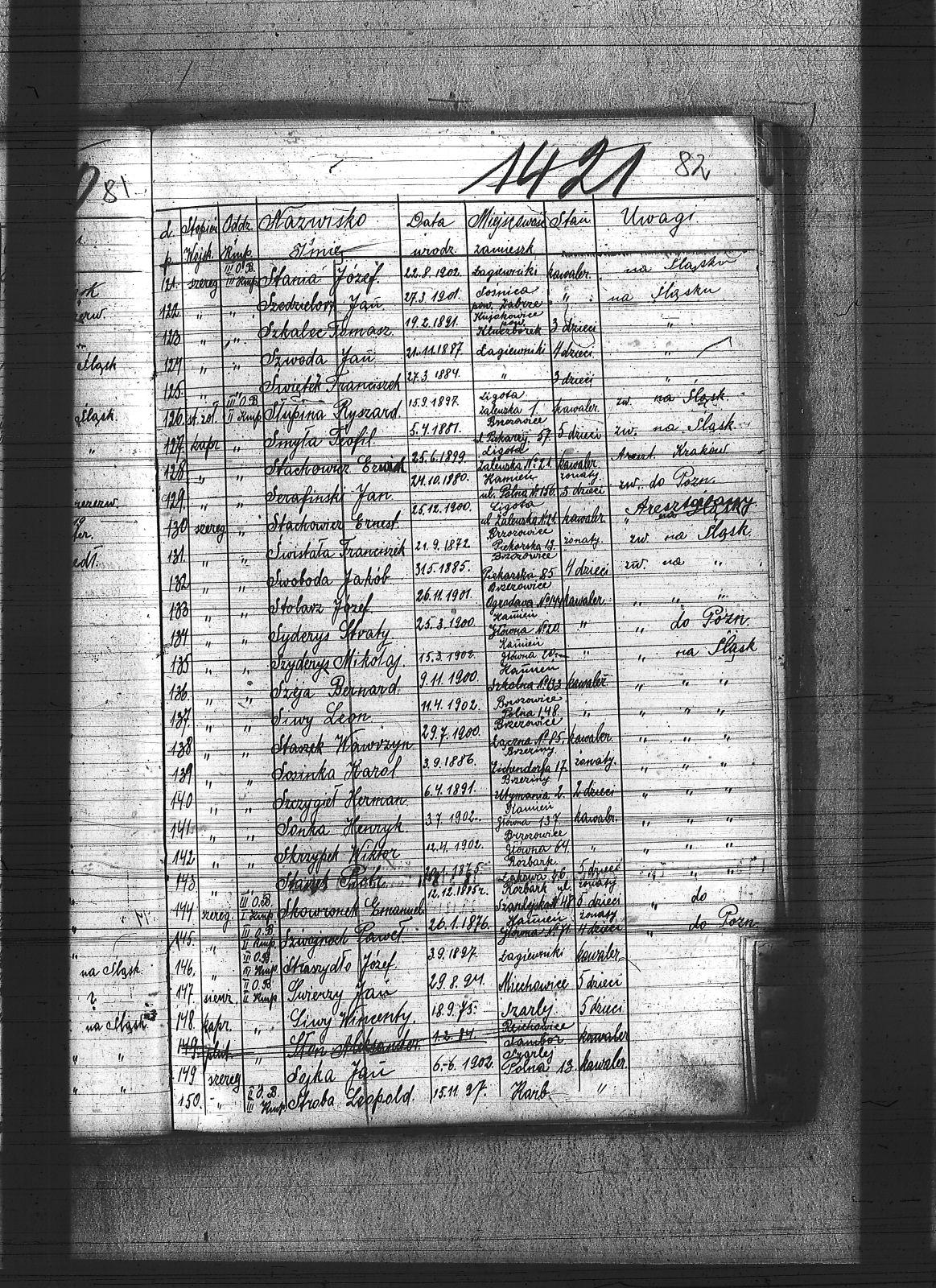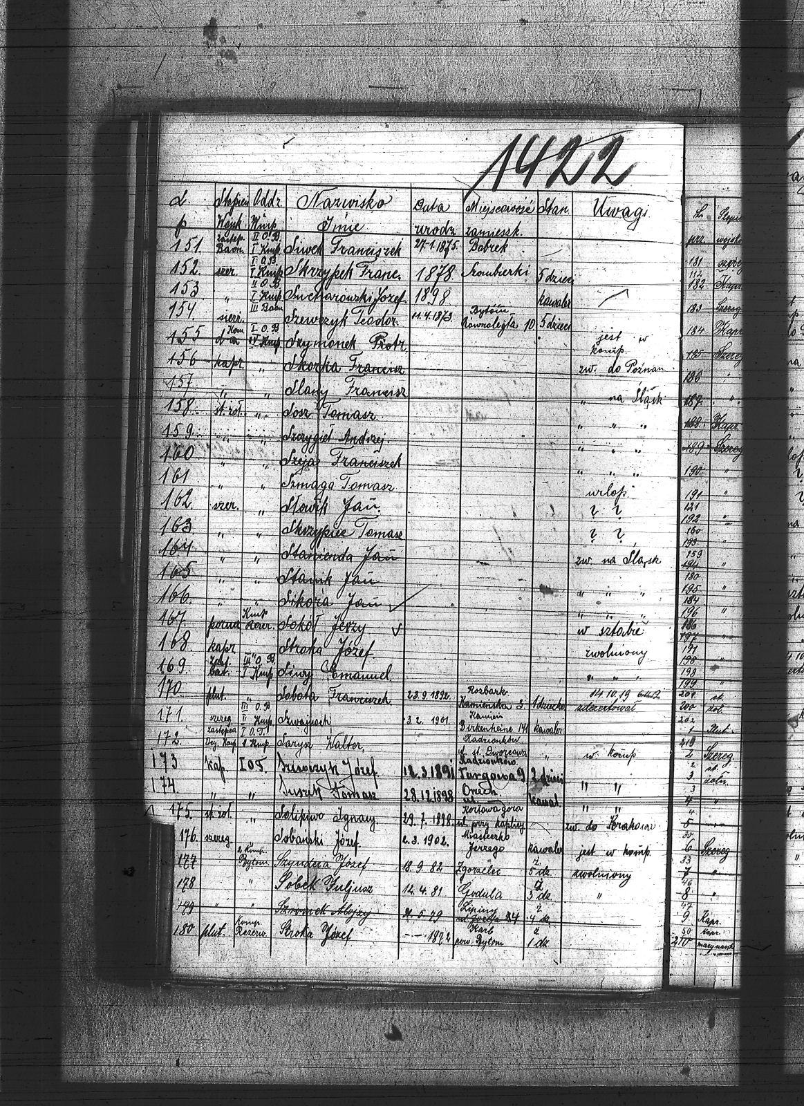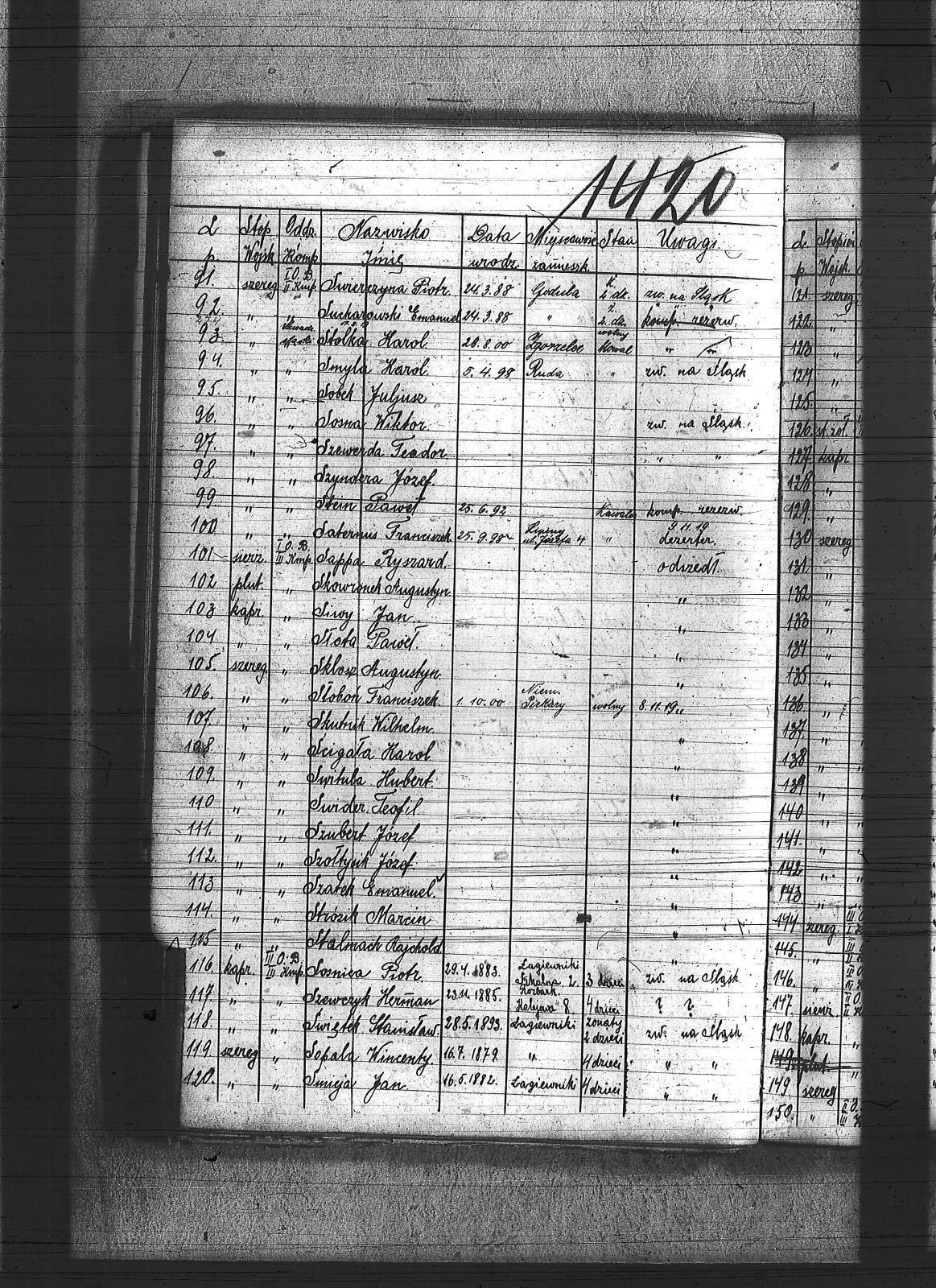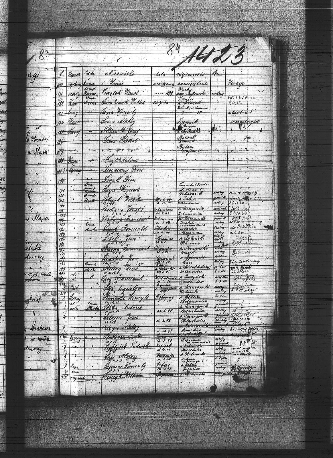 Sadłoska, Dominik; Sakowski, Stanisław; Salamon, Wawrzyniec; Salkert, Wincenty; Sanienda, Wilhelm; Sappa, Ryszard; Sarysz, Walter; Saternus, Franciszek; Saturn, Jan; Scheling, Kurt; Sempowski, ; Sendrecki, Jan; Serafiński, Jan; Sfronda, Agustyn; Siegel, Józef; Sieja, Bronisław; Siendzielorz, Edward; Sikora, Jan; Sikorski, Jan; Sitek, Jan; Siwek, Franciszek; Siwek, Józef; Siwiec, Alojzy; Siwy, Emanuel; Siwy, Franciszek; Siwy, Jan; Siwy, Leon; Siwy, Szymon; Siwy, Wincenty; Skiba, Antoni; Sklawski, Józef; Sklosz, Augustyn; Skorka, Franciszek; Skorupa, Tomasz; Skorzec, Teodor; Skotarski, Marcin; Skotniczy, Wilhelm; Skowronek, Augustyn; Skowronek, Emanuel; Skrzypek, Franciszek; Skrzypek, Wiktor; Skrzypiec, Tomasz; Skupin, Karol; Skutnik, Wilhelm; Slany, Franciszek; Słoboń, Franciszek; Słodyczyk, Franciszek; Słoń, Aleksander; Słopczyński, Walek; Słota, Paweł; Słowik, Jan; Słowiński, Henryk; Słupina, Ryszard; Służałek, Jan; Smykała, Jan; Smyla, Karol; Smyła, Piotr; Smyła, Teofil; Smyła, Wincenty; Sobański, Józef; Sobczyk, Tomasz; Sobczyk, Wilhelm; Sobecki, Antoni; Sobek, Juliusz; Sobota, Franciszek; Sodowski, Paweł; Sojka, Jan; Sojka, Paweł; Sokół, Jerzy; Solecki, Antoni; Solipiwo, Ignacy; Sommer, Jerzy; Sonka, Henryk; Sopala, Wincenty; Sorek, Jan; Sorek, Józef; Sornik, Wilhelm; Sosinka, Karol; Sosna, Józef; Sosna, Paweł; Sosna, Wiktor; Sosz, Tomasz; Sośnica, Piotr; Sotor, Karol; Sowa, Aleksy; Sowa, Jan; Sowa, Piotr; Sowik, Szczepan; Sowiński, Herman; Stach, Jan; Stachowicz, Ernest; Stachowicz, Erwin; Stachura, Franciszek; Stachura, Józef; Stainert, Paweł; Stalmach, Rainchold; Stanek, Karol; Stanek, Piotr; Stania, Józef; Stania, Paweł; Stanienda, Jan; Stanienda, Walenty; Staszek, Wawrzyn; Stawik, Jan; Stein, Paweł; Stokłosa, Paweł; Stokłosa, Piotr; Stokosa, Józef; Stokoś, Jan; Stolarz, Józef; Stolka, Karol; Stonulczyk, Feliks; Stosik, Romuald; Straszydło, Józef; Stroba, Leopold; Stroka, Bronisław; Stroka, Józef; Strózik, Jan; Struzik, Marcin; Strzelczyk, Jan; Strzelecki, Bolesław; Strzępa, Franciszek; Styś, Alojzy; Styś, Augustyn; Styś, Jan; Suchanek, Maksym; Sucharowski, Emanuel; Sucharowski, Józef; Suszek, Tomasz; Suzarek, Antoni; Swiaczny, Jan; Swider, Błażej; Swider, Teofil; Swierczek, Stefan; Swierczy, Jan; Swierczyna, Piotr; Swist; Switula, Hubert; Swoboda, Antoni; Swoboda, Jakób; Syderys, [nieczytelne]; Symieszczyk, Piotr; Szarkowski, Pawel; Szatek, Emanuel; Szatek, Paweł; Szczepanek, Wincenty; Szczudlik, Adolf; Szczurek, August; Szczygieł, Alojzy; Szczygieł, Andrzej; Szczygieł, Herman; Szczygieł, Paweł; Szczygieł, Robert; Szczygulski, Paweł; Szefczyk, Wilhelm; Szeja, Antoni; Szeja, Bernard; Szeja, Franciszek; Szeja, Wojciech; Szemura, Jan; Szendzielorz, Jan; Szewczyk, Augustyn; Szewczyk, Herman; Szewczyk, Teodor; Szewerda, Teodor; Szier, Emil; Szkalec, Tomasz; Szklanny, Karol; Szkop, Jerzy; Szlęga, Aleksy; Szlęga, Jan; Szlosarczyk, Jakub; Szmaga, Tomasz; Sznajder, Teodor; Sznella, Wincenty; Szoblicki, Wilhelm; Szoltysek, Teodor; Szoltysek, Wiktor; Szoltysek, Wincenty; Szołkowski, Paweł; Szołtysik, Ludwik; Szołtysik, Wincenty; Szołytsik, Józef; Szombierski, Jakub; Szopa, Wincenty; Szprenc, Wincenty; Szromek, Alojzy; Szrot, Piotr; Sztetinus, Józef; Sztych, Wincenty; Szubert, Józef; Szulc, Frydrych; Szuła, Izydor; Szuster, Antoni; Szwajnoch; Szwajnoch, Paweł; Szweda, Franciszek; Szweda, Jan; Szwoczyk, Józef; Szyderys, Mikołaj; Szymik, Karol; Szymonek, Piotr; Szyndera, Józef; Ścigała, Karol; Śmiałek, Roman; Śmieja, Jan; Śmietana, Józef; Śrot, Jan; Świder, Jan; Świerczyński, Antoni; Świerzy, Jan; Świętek, Franciszek; Świętek, Karol; Świętek, Stanisław; Świstała, Franciszek; Świtała, Teodor; |