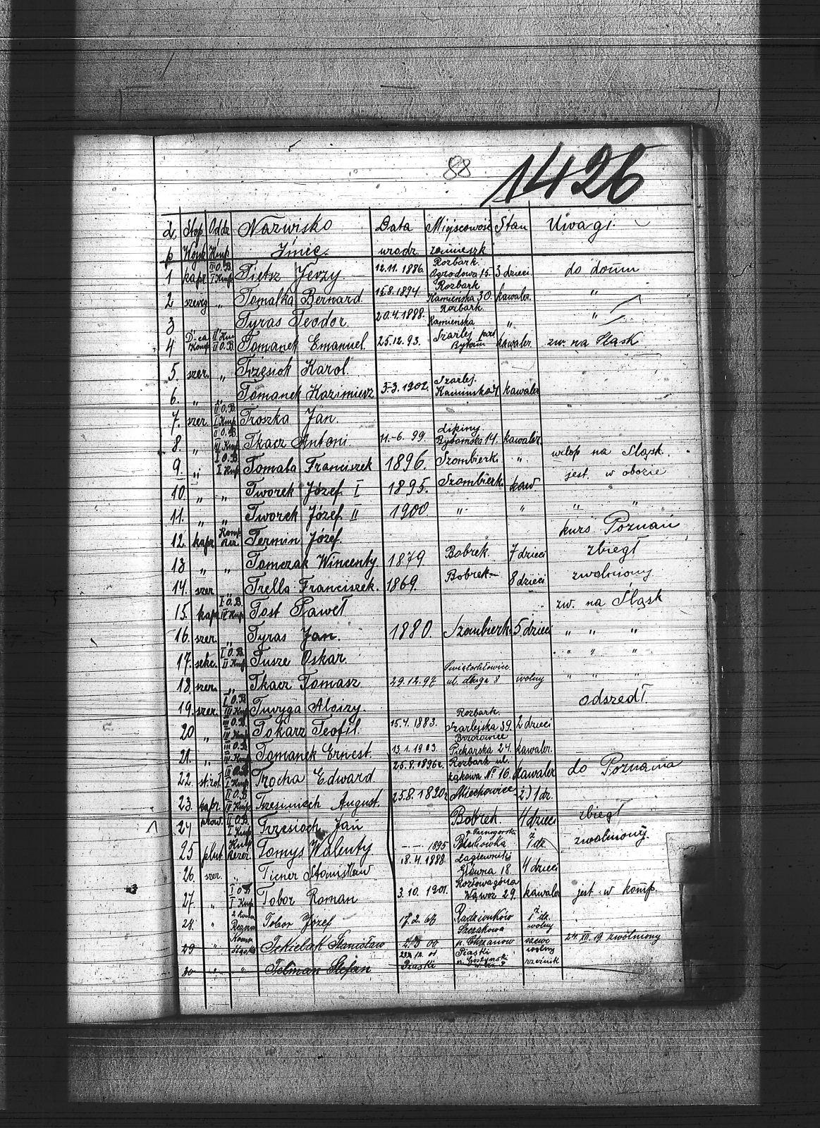 Tabor, Roman; Targiel, Jan; Tekielak, Stanisław; Telman, Stefan; Termin, Józef; Ticner, Stanisław; Tietsz, Jerzy; Tkacz, Antoni; Tkacz, Tomasz; Tobor, Józef; Tobor, Roman; Tobor, Tomasz; Toborek, Jan; Tokarz, Teofil; Tomala, Franciszek; Tomalka, Bernard; Tomanek, Emanuel; Tomanek, Ernest; Tomanek, Kazimierz; Tomczak, Wincenty; Tomiczek, Augustyn; Tomys, Walenty; Torz, Izydor; Tost, Paweł; Trocha, Edward; Troszka, Jan; Trzesioch, Jan; Trzesiok, Karol; Trzęsimiech, August; Tulla, Franciszek; Turyga, Aloizy; Tusza, Oskar; Twardzik, Jan; Tworek, Józef I; Tworek, Józef II; Tyras, Jan; Tyras, Teodor; |