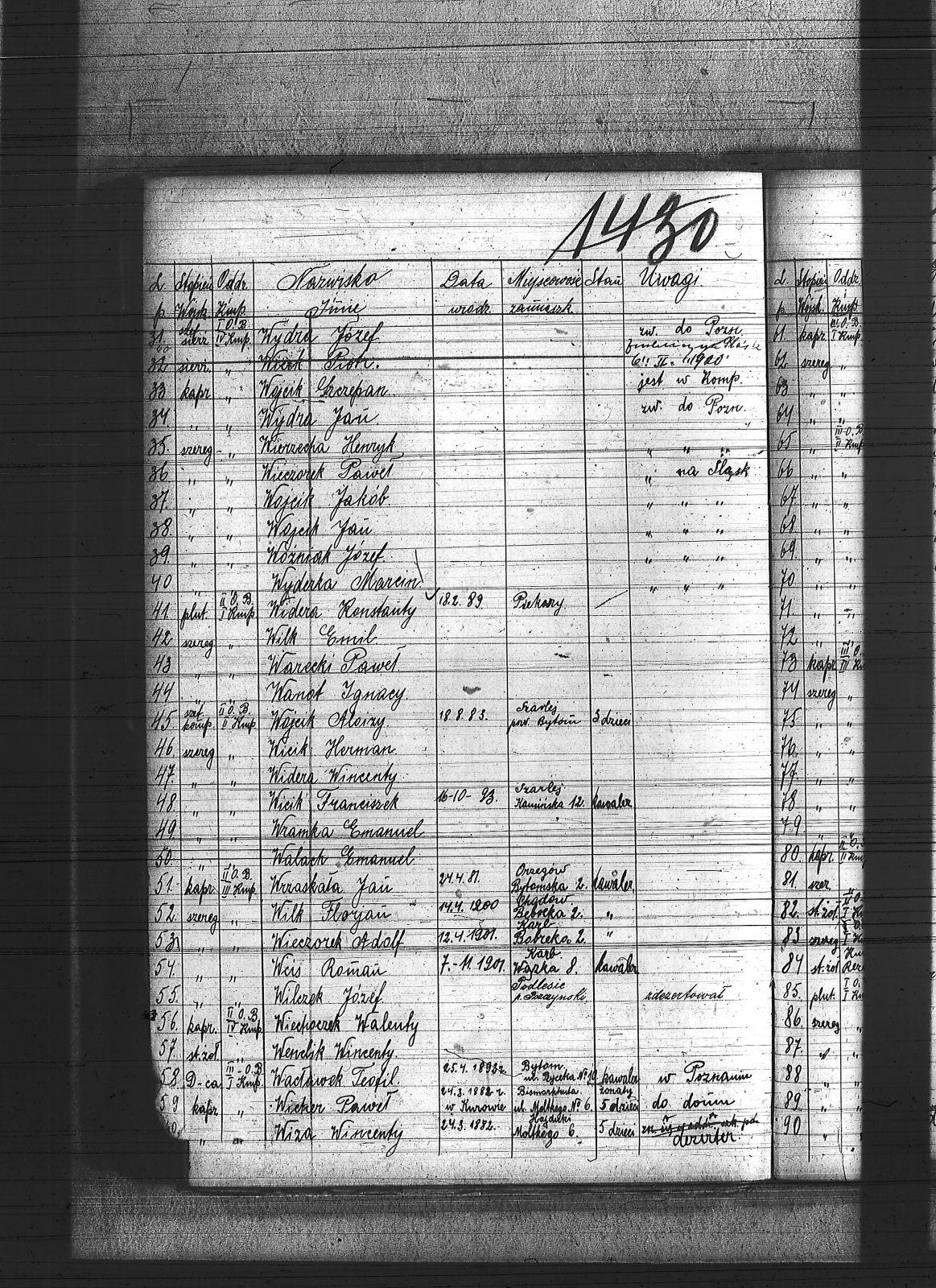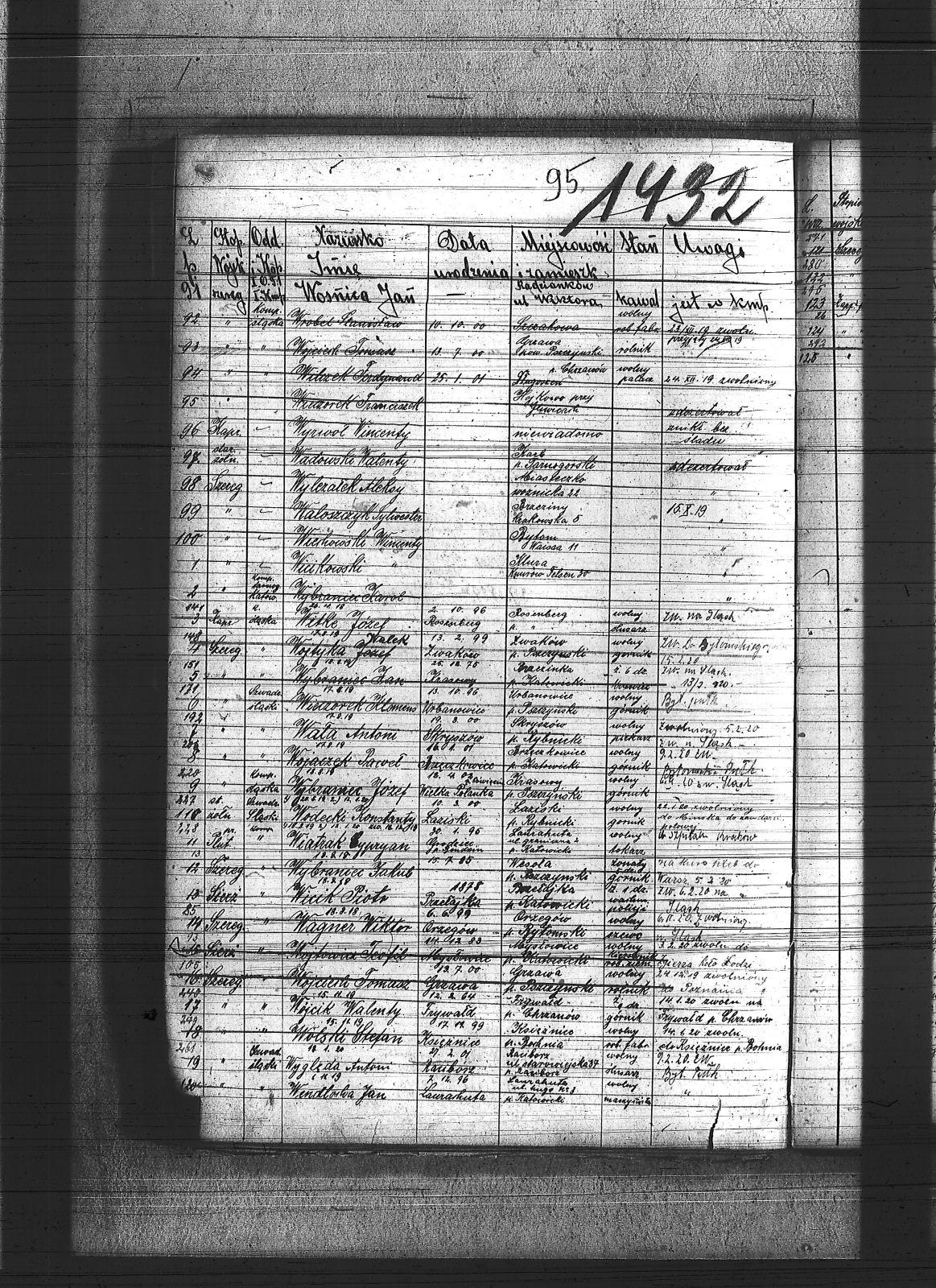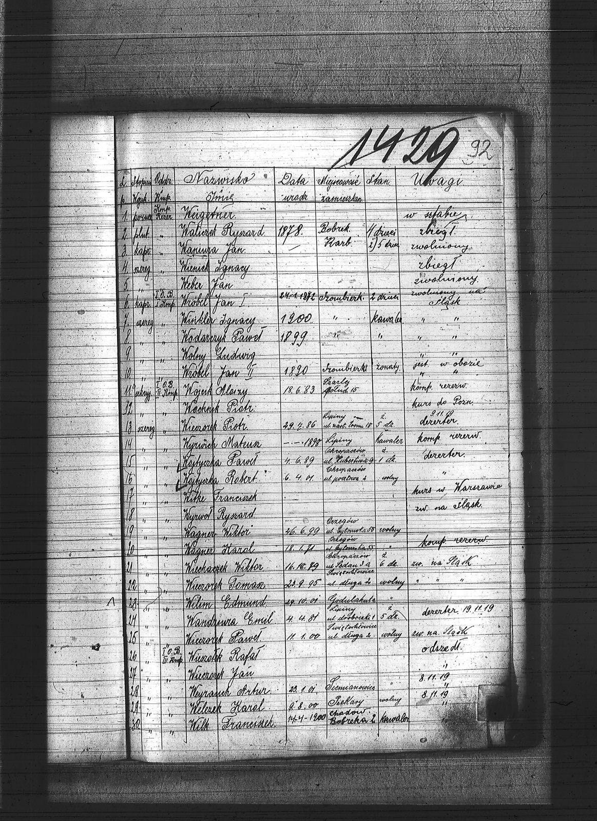 Wacławek, Teofil; Waczerka, Franciszek; Wadowski, Walenty; Wagner, Karol; Wagner, Wiktor; Walach, Emanuel; Walaszczyk, Joachim; Walaszczyk, Stanisław; Walaszek, Piotr; Waliczek, Ryszard; Waloszczyk, Sylwester; Wała, Antoni; Wandziura, Emil; Waniura, Jan; Wanot, Ignacy; Warciak, Augustyn; Warczok, Augustyn; Warczok, Karol; Warczok, Michał; Warecki, Paweł; Warwas, Jakub; Warzecha, Antoni; Warzecha, Paweł; Wastal, Paweł; Wcis, Roman; Weber, Jan; Weigetner; Welezek, Karol; Wenclik, Wincenty; Wendlorka, Jan; Wesoły, Antoni; Wesoły, Roman; Weyranch, Artur; Wiatrak, [Cyprian]; Wicek, Piotr; Wicher, Antoni; Wicher, Paweł; Wicik, Franciszek; Wicik, Herman; Wicik, Piotr; Wicikowski; Wicikowski, Leon; Widera, Edmund; Widera, Jan; Widera, Konstanty; Widera, Ludwik; Widera, Wincenty; Wiechaczek, Wiktor; Wiechoczek, Walenty; Wieczorek, Adolf; Wieczorek, Franciszek; Wieczorek, Jan; Wieczorek, Klemens; Wieczorek, Paweł; Wieczorek, Piotr; Wieczorek, Tomasz; Wieniek, Ignacy; Wierkowski, Wincenty; Wierzecha, Henryk; Wieszołek, Rafał; Wikarek, Bernardy; Wiktor, Franciszek; Wilczek, Ferdynad; Wilczek, Józef; Wilim, Edmund; Wilk, Emil; Wilk, Florian; Wilk, Franciszek; Winkler, Ignacy; Witke, Franciszek; Witke, Józef; Wiza, Wincenty; Wochnik, Piotr; Wodarczyk, Paweł; Wodecki, Konstanty; Wojaczek, Paweł; Wojak, Franciszek; Wojciech, Tomasz; Wojcik, Szczepan; Wojtal, Józef; Wojtala, Józef; Wojtowicz, Teofil; Wojtyczka, Paweł; Wojtyczka, Robert; Wojtyka, Walek; Wolny, Ludwig; Wolny, Sylwester; Wolski, Stefan; Wośnica, Jan; Woźniak, Józef; Wójcik, Aloizy; Wójcik, Alojzy; Wójcik, Jakub; Wójcik, Jan; Wójcik, Szczepan; Wójcik, Walenty; Wramka, Emanuel; Wrona, Ignacy; Wróbel, Franciszek; Wróbel, Jan I; Wróbel, Jan II; Wróbel, Stanisław; Wrzaskała, Jan; Wuwer, Feliks; Wybraniec, Jakub; Wybraniec, Jan; Wybraniec, Józef; Wybraniec, Karol; Wyderka, Marcin; Wydra, Jan; Wydra, Józef; Wyględa, Antoni; Wyleżałek, Aleksy; Wyleżałek, Józef; Wyrwich, Mateusz; Wyrwoł, Ryszard; Wyrwoł, Wincenty; Wyzgoł, Józef; |