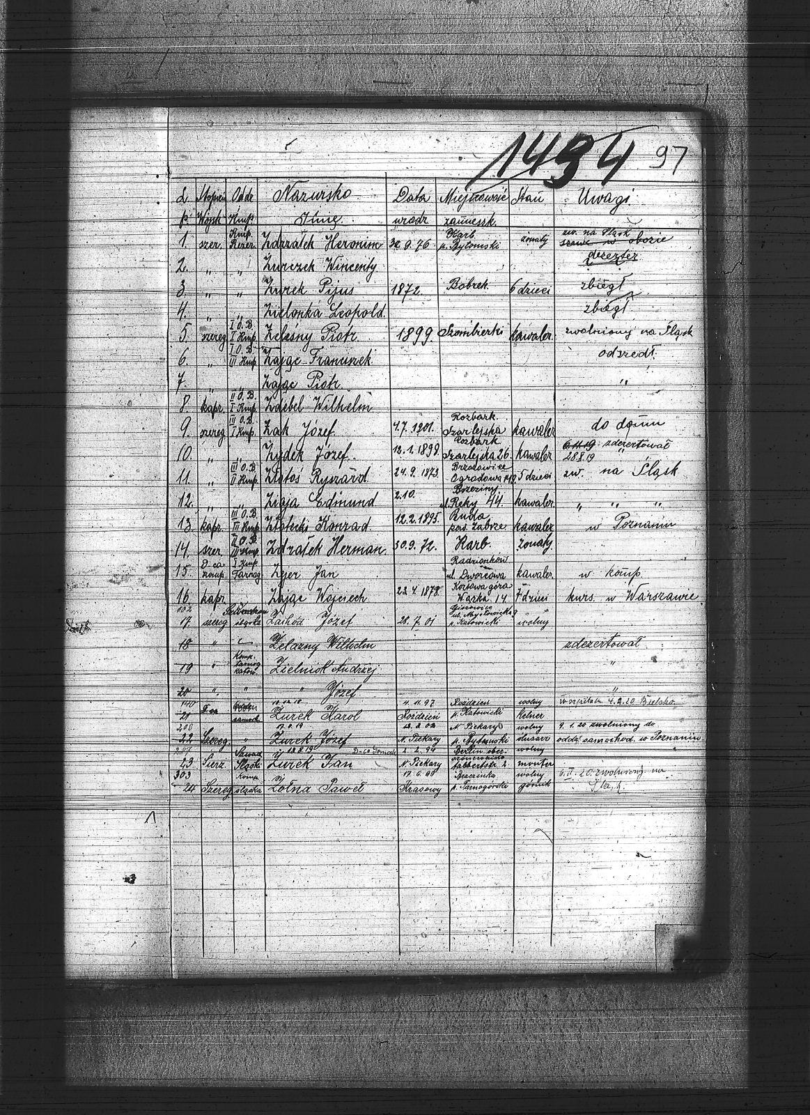 | Osoby | Zachód, Józef; Zając, Franciszek; Zając, Piotr; Zając, Wojciech; Zdebel, Wilhelm; Zdrzałek, Herman; Zdrzałek, Hieronim; Zejer, Jan; Ziaja, Edmund; Zielniok, Andrzej; Zielniok, Józef; Zielonka, Leopold; Złotecki, Konrad; Złotoś, Ryszard; Żak, Józef; Żelażny, Wilhelm; Żeleźny, Piotr; Żołna, Paweł; Żurczek, Wincenty; Żurek, Jan; Żurek, Jóżef; Żurek, Karol; Żurek, Pijus; Żydek, Józef; |