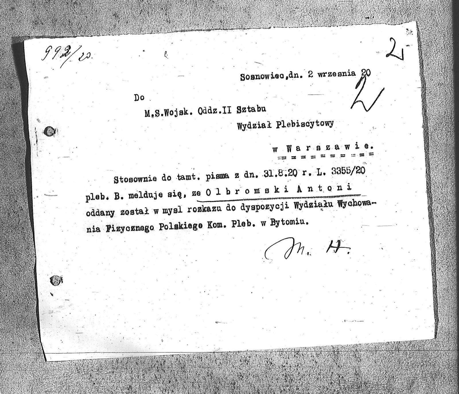 Tytuł Dokument do M.S. Wojsk. II Odział Wydział Plebiscytowy