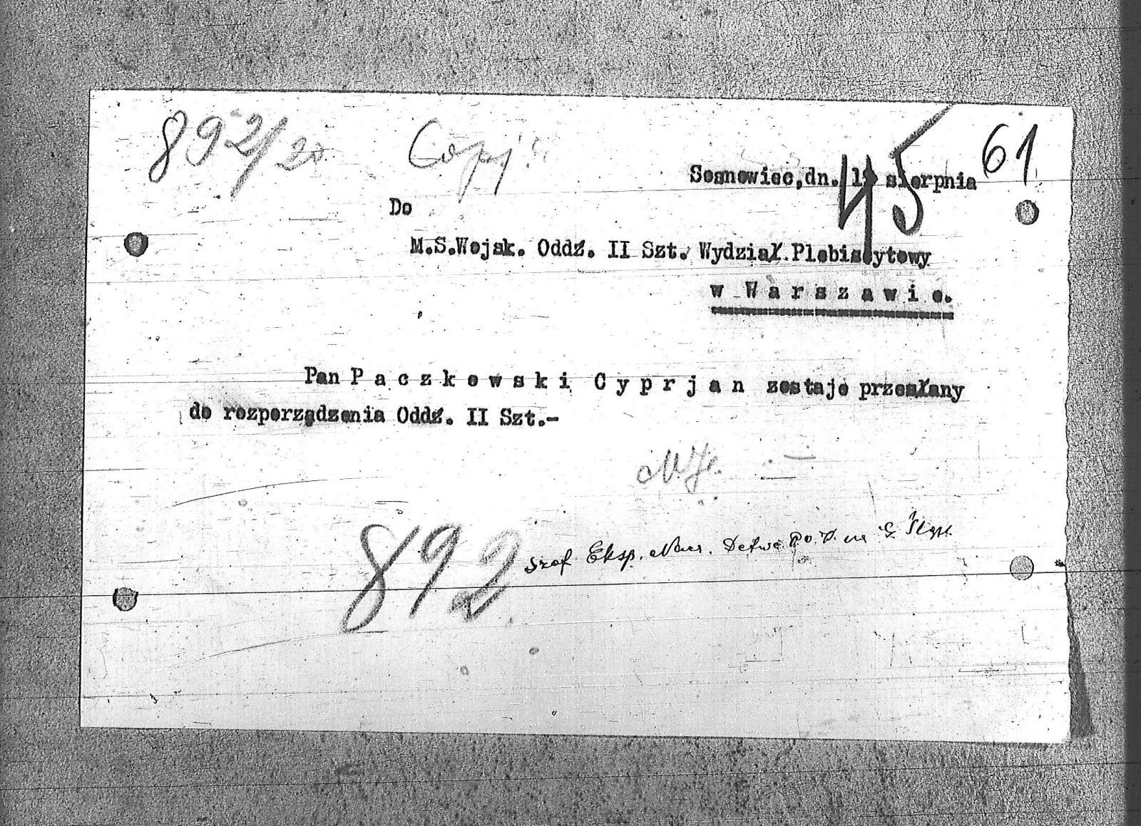 | Tytuł | Do Ministerstwa Spraw Wojskowych Oddział II Sztabu Wydział Plebiscytowy |