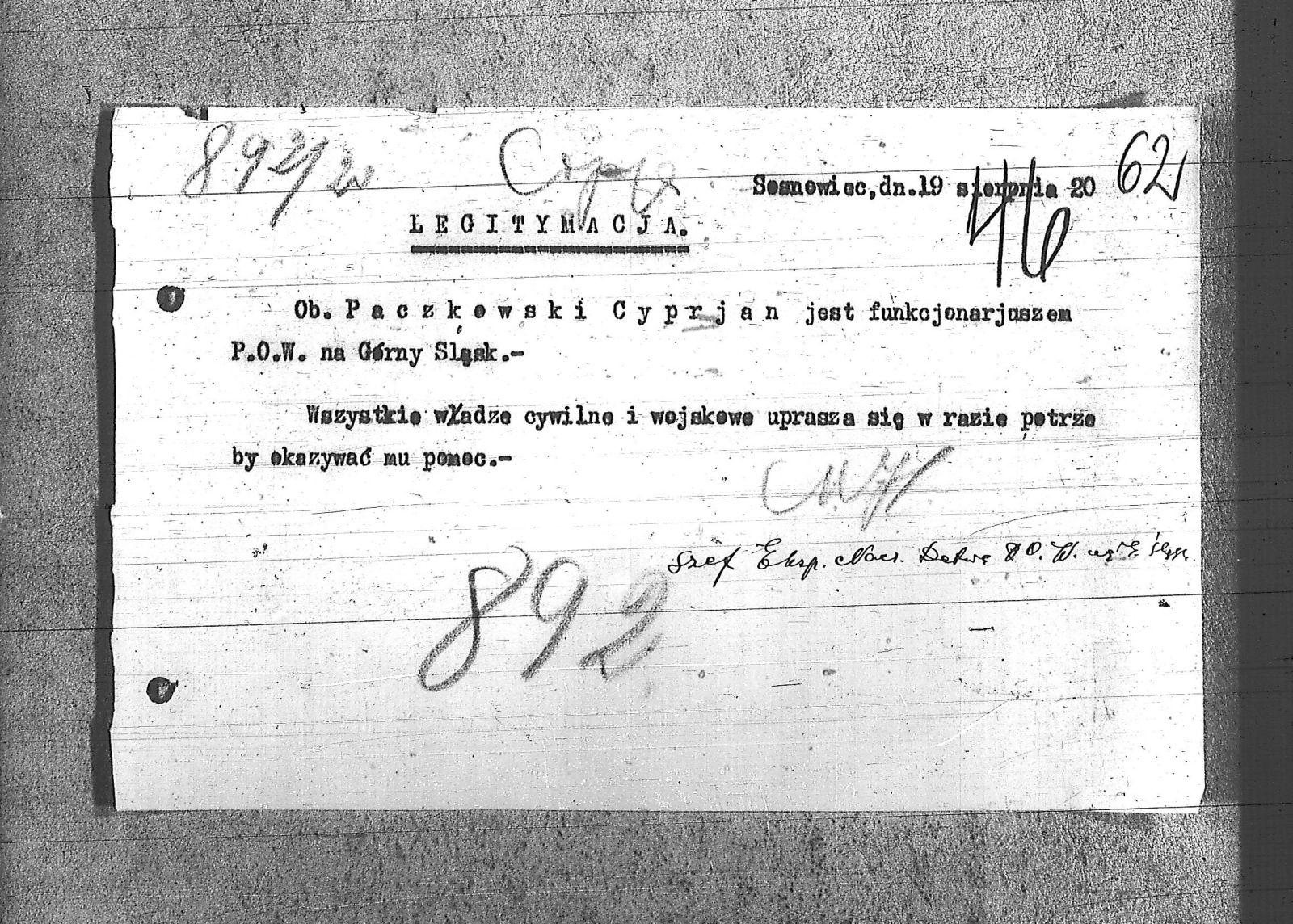 Tytuł teczki[Naczelne Dowództwo POW na Górnym Śląsku - protokoły, korespondencja, legitymacje, przepustki i upoważnienia]