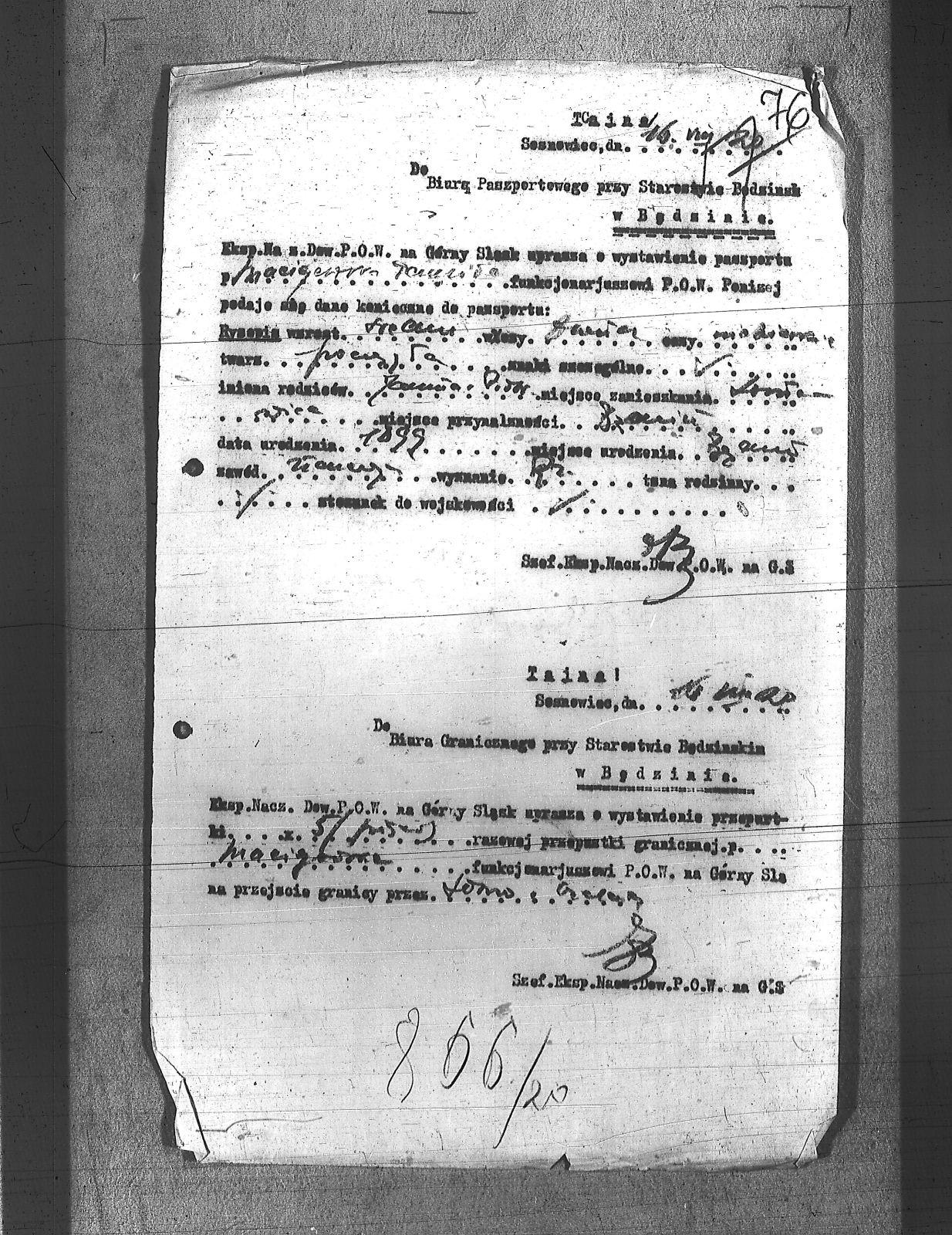 | Tytuł | Do Biura Paszportowego i Granicznego przy Starostwie Będzińskim w Będzinie - tajne. |