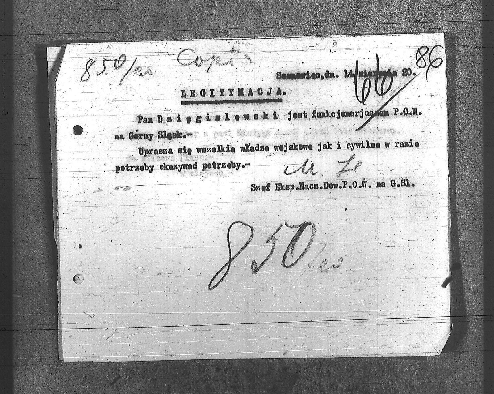 Tytuł teczki[Naczelne Dowództwo POW na Górnym Śląsku - protokoły, korespondencja, legitymacje, przepustki i upoważnienia]
