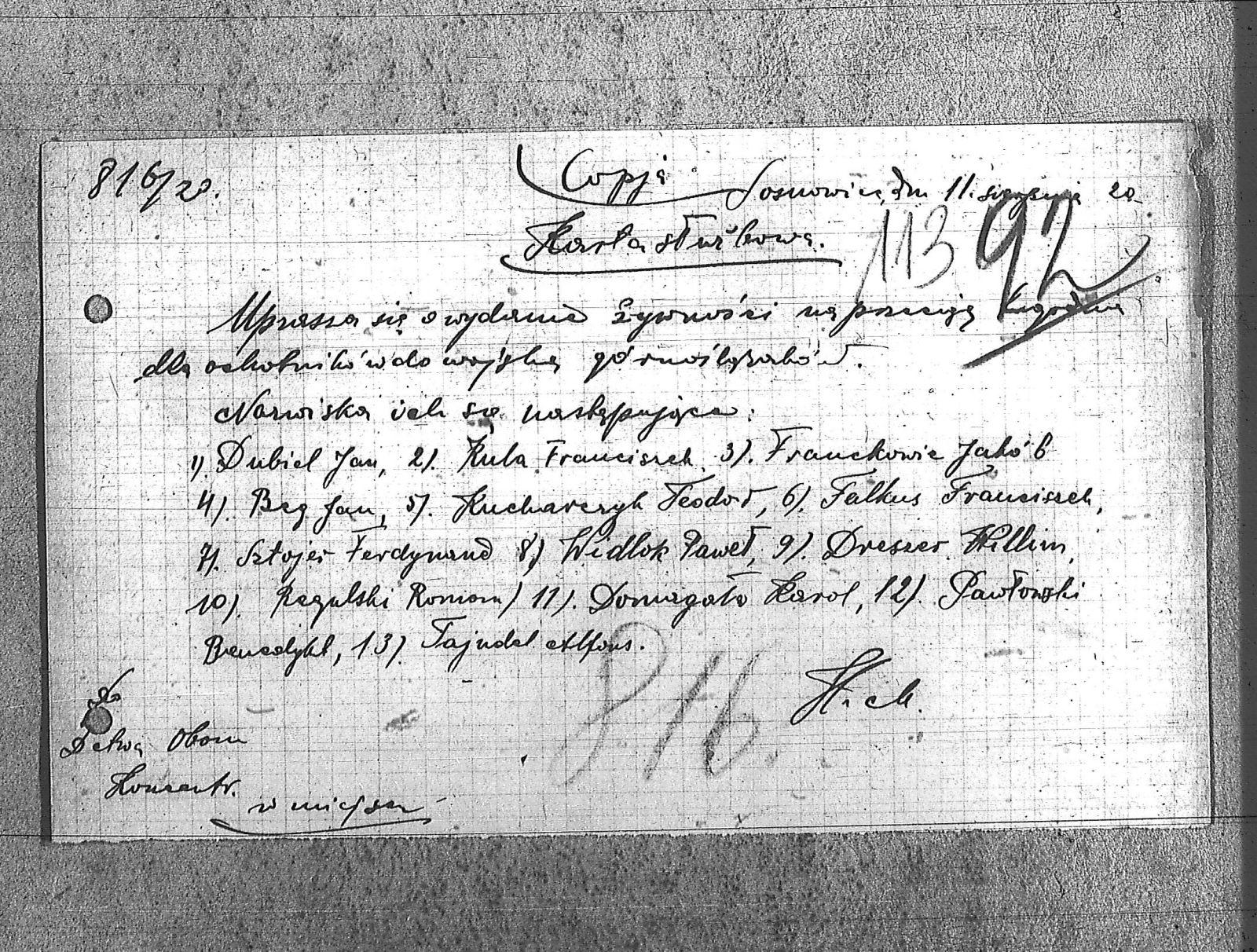 | Osoby | Beg, Jan; Domagała, Karol; Dreszer, Willim; Dubiel, Jan; Falkus, Franciszek; Franckowic, Jakób; Kucharczyk, Teodor; Kula, Franciszek; Pawłowski, Benedykt; Regulski, Roman; Sztojer, Ferdynand; Tajudel, Alfons; Widlok, Paweł; |