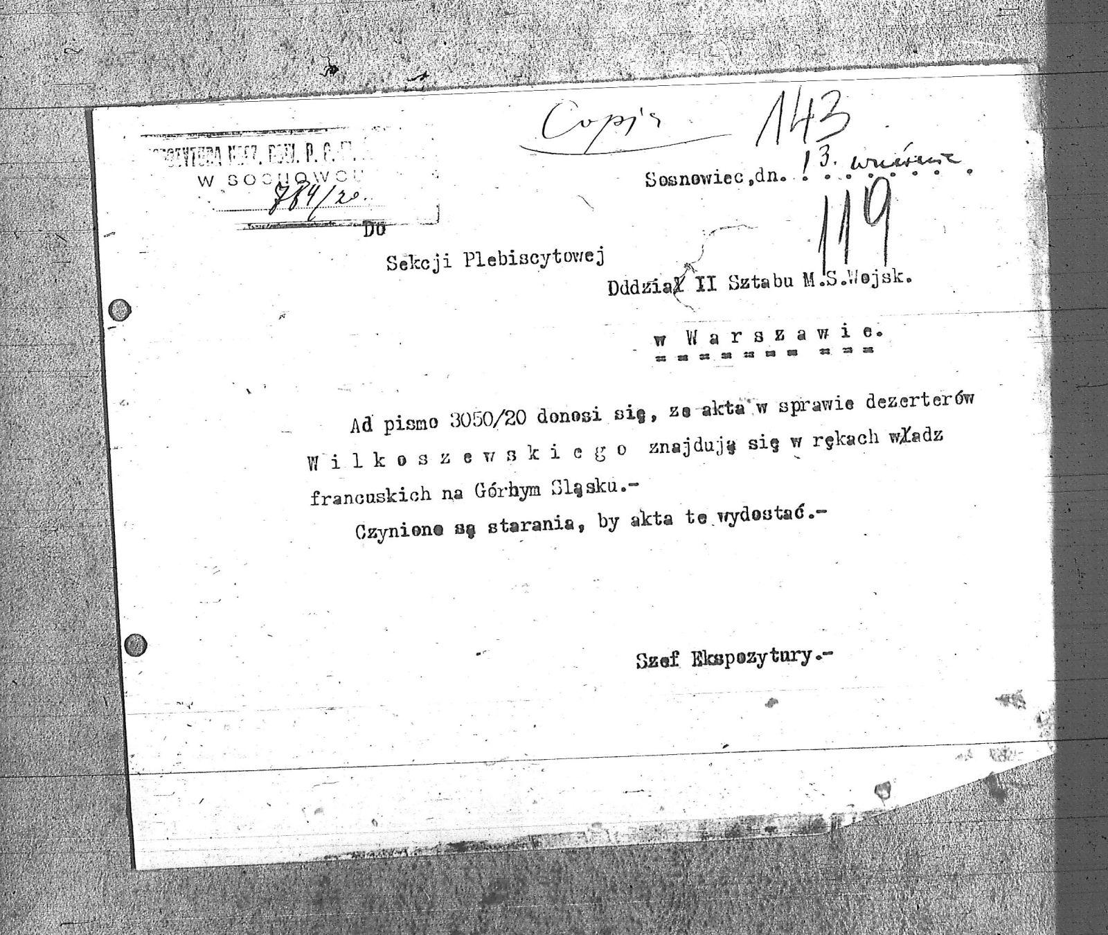 Tytuł Do Sekcji Plebiscytowej Oddział II Sztabu Ministerstwa Spraw Wojskowych w Warszawie