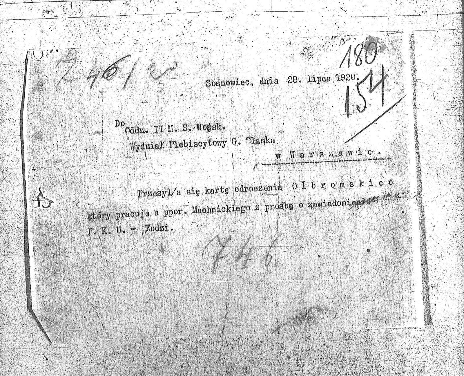 Tytuł Do Oddziału II Ministerstwa Spraw Wojskowych Wydział Plebiscytowy Górnego Śląska w Warszawie