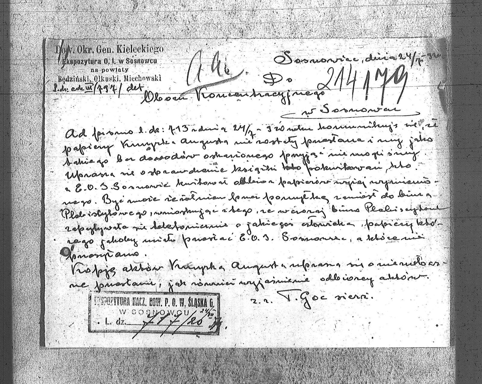 | Instytucje | Dowództwo Okręgu Generalnago Kieleckiego Ekspozytura O.I. w Sosnowcu na powiaty Będziński; Miechowski; Olkuski |