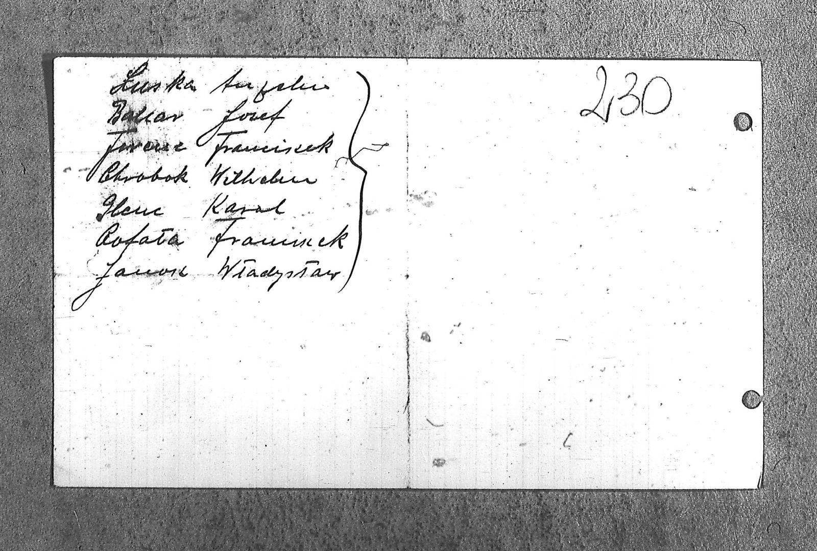 | Osoby | Bakar, Józef; Chrobok, Wilhelm; Cofała, Franciszek; Ferenc, Franciszek; Glenc, Karol; Janok, Władysław; Luska, Anzelm; Zgrzebniak; |