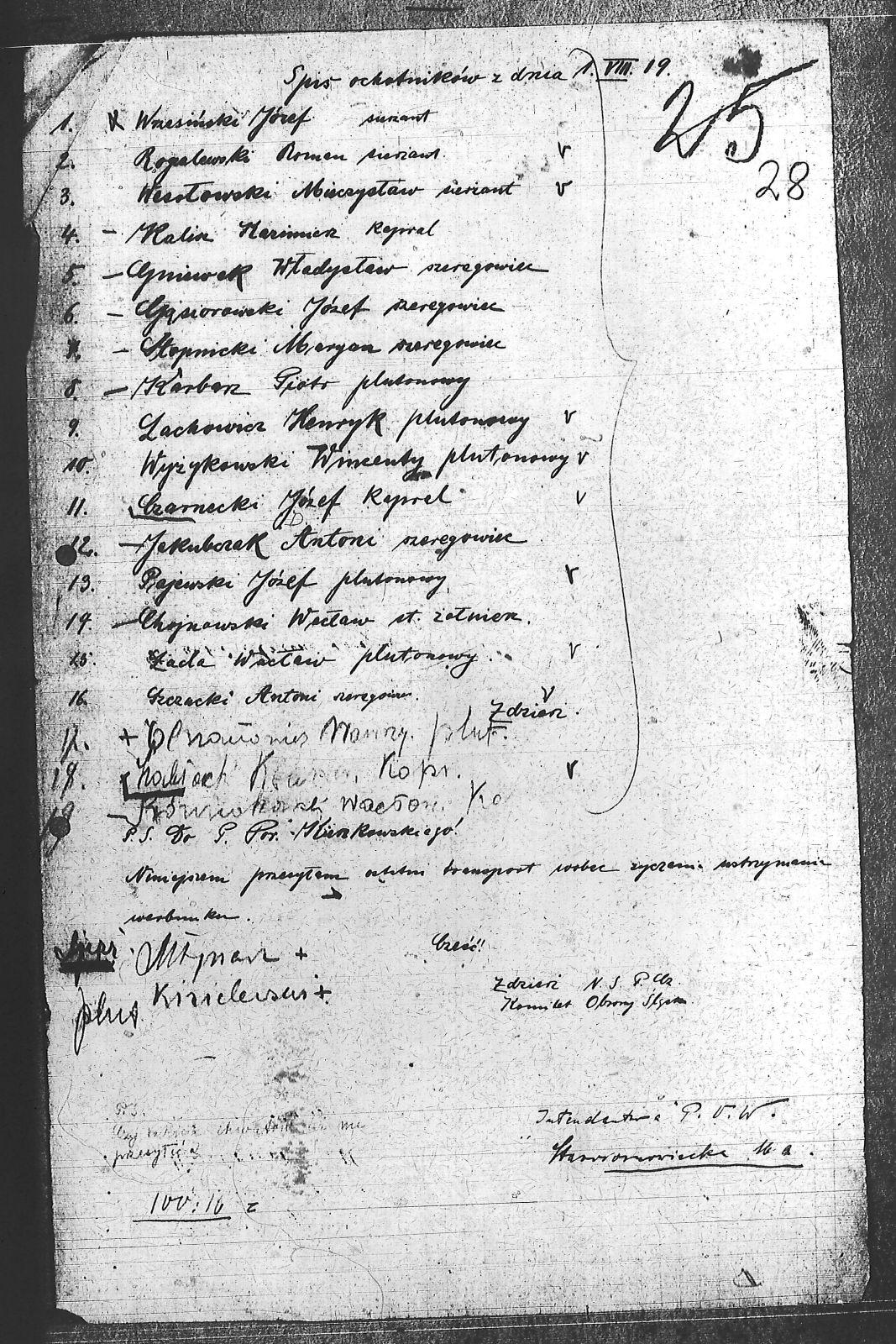 | Osoby | Chojnawski, Wacław; Czarnecki, Józef; Gąsiorowski, Józef; Gniewak, Władysław; Hochłach, Ksawery; Jakubczak, Antoni; Kalisz, Kazimierz; Karbarz, Piotr; Kienkowski, ; Kisielewski; Lachowicz, Henryk; Łada, Wacław; Młynarz; Olszanowicz, Marian; Pajewski, Józef; Rogalewski, Roman; Równiakowski, Wacław; Stopnicki, Marian; Szczucki, Antoni; Wesołowski, Mieczysław; Wrzesiński, Józef; Wyżykowski, Wincenty; |