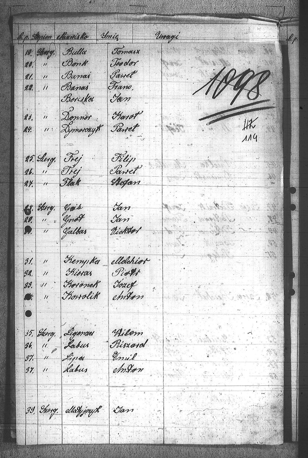 Adamiec, Ludwig; Andraczyk, Paweł; Banaś, Franciszek; Banaś, Paweł; Berczka, Jan; Bonk, Edmund; Bonk, Teodor; Bulla, Tomasz; Donner, Karol; Dramski, Wincenty; Dymarczyk, Paweł; Flak, Stefan; Frej, Filip; Frej, Paweł; Galbas, Wiktor; Gałbas, Emanuel; Gnot, Jan; Grzib, Jan; Kaida, Grzegorz; Kampf, Bolesław; Keil, Emanuel; Kempka, Melchior; Kieras, Piotr; Koronek, Józef; Kowolik, Antoni; Labus, Antoni; Labus, Ryszard; Ligenza, Wilem; Lihs, Emanuel; Lipa, Emil; Matyjczyk, Jan; Matyjczyk, Wilem; Mazur, Józef; Micka, Paweł; Mitrenga, Józef; Mrozek, Józef; Mrozek, Stanisław; Musioł, Józef; Nolewaika, Teofil; Nowak, Ignac; Opiełka, Stanisław; Ormienski, Jan; Palęga, Jan; Pietryga, Franciszek; Pietryga, Ludwig; Pietrzik, Józef; Porczyk, Jan; Reichel, Jan; Sapa, Antoni; Słota, Teofil; Sowa, Jan; Sowa, Roman; Streuhzel, Wincenty; Szeliga, Paweł; Szeliga, Piotr; Szlęga, Aleks; Tobor, Ludwig; Tobor, Tomasz; Tyczka, Jan; Urbańczyk, Paweł; Wieczek, Rudolf; Włodarczyk, Teodor; Wostal, Paweł; Wrzeszniowski, Jan; Wylazałek, Maciej; Wyrwoł, Józef; Wyspoł, Franciszek; Zakrzowski, Teodor; |