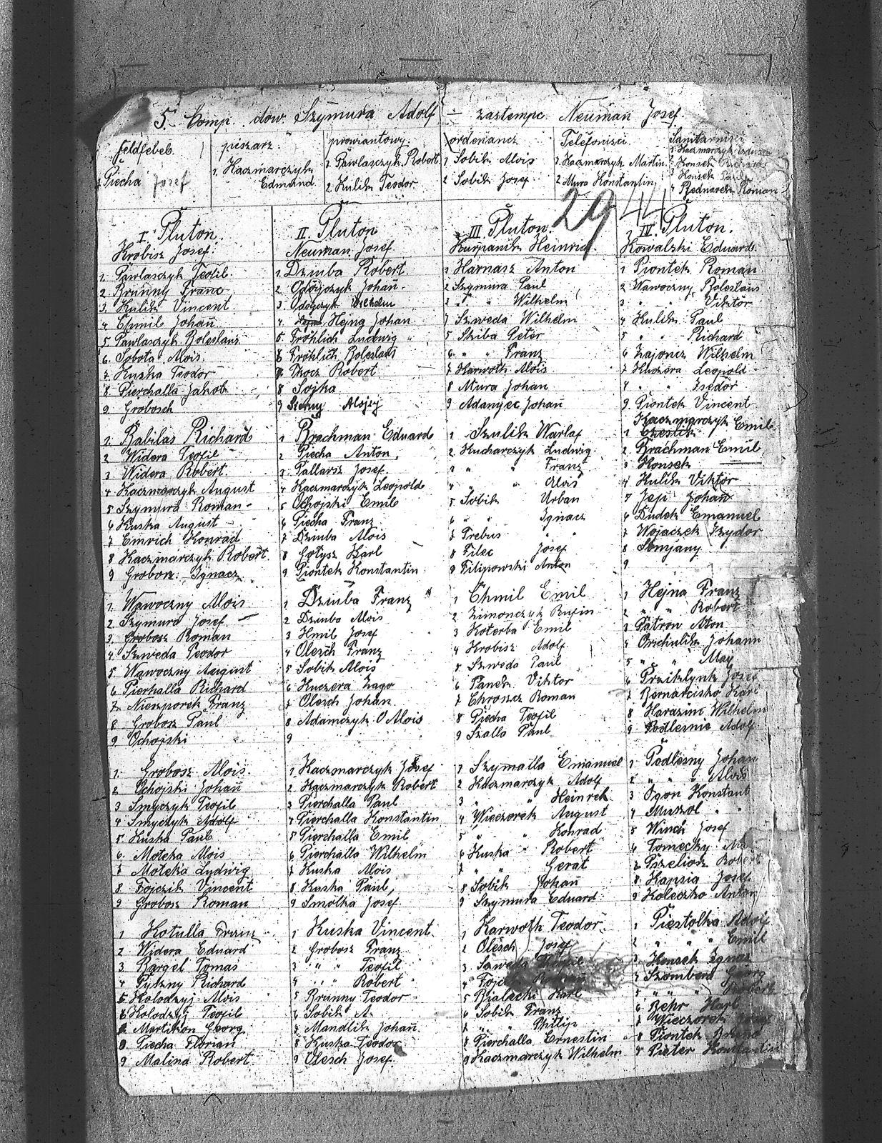 [Adamiec], Johan; [Agon], [Konstanty]; [Bernarcisko], Karl; [Fojcik], Roman; [Fojczik], Vincent; [Frohlich], [Bolesław]; [Frohlich], Ludwig; [Gołysz], Karl; [Groborz], [Ignacz]; [Grobosch]; [Hmil], Józef; [Karwoth], [Alois]; [Kolodzyj], [Alois]; [Kolodzyj], Teofil; [Konsek], Paul; [Konsek], Richard; [Krobisz], Adolf; [Kulisz], Teodor; [Martikon], Georg; [nieczytelne], Johan; [Orzchulik], [May]; [Orzchulik], Johann; [Panesz], Viktor; [Piontek], Bruno; [Piontek], Konstantin; [Piontek], Roman; [Piontek], Vincent; [Podlesnia], Adolf; [Podlesny], Alois; [Podlesny], Johan; [Prebus], [Ignacy]; [Prziklynk], Jozef; [Pszeliok], Robert; [Somjany]; [Szerny], Alojzy; [Teofil], Theofil; [Wawoczny], Bolesław; [Wawoczny], Viktor; [Zajoncz], Wilhelm; Adamczyk, [Alois]; Babilas, Richard; Bargel, Tomas; Bednarek, Roman; Behr, Karl; Bialecki, Karol; Brachman, Edward; Brachman, Emil; Brunny, Franc; Brunny, Teodor; Chmil, Emil; Chroszcz, Roman; Dudek, Emanuel; Dziuba, [Alois]; Dziuba, Franz; Dziuba, Robert; Emrich, Konrad; Filec, Josef; Filipowski, Anton; Grobosz, [Alois]; Grobosz, [Franz]; Grobosz, Paul; Grobosz, Robert; Grobosz, Roman; Grobosz, Teofil; Harasim, Wilhelm; Harnasz, Anton; Hejna, Franz; Hejna, Robert; Hejng, Johan; Jap, Johan; Kaczmarczyk, [Heinrch]; Kaczmarczyk, Adolf; Kaczmarczyk, August; Kaczmarczyk, E.; Kaczmarczyk, Edmund; Kaczmarczyk, Emil; Kaczmarczyk, Josef; Kaczmarczyk, Leopold; Kaczmarczyk, Martin; Kaczmarczyk, Robert; Kaczmarczyk, Wilhelm; Kapsia, Josef; Karwoth, Teodor; Koleczko, Amton; Konsek; Konsek, [Ignacy]; Koterba, Emil; Kotulla, [Franz]; Kowalski, Edward; Krobisz, Josef; Kucharczyk, [Alois]; Kucharczyk, [Franz]; Kucharczyk, Ludwig; Kuczera, [Zagr]; Kuczera, Isedor; Kuczera, Leopold; Kulik, Paul; Kulik, Richard; Kulik, Viktor; Kulik, Vincent; Kurpanik, Heinrich; Kuska, [Alois]; Kuska, August; Kuska, Gerat; Kuska, Paul; Kuska, Robert; Kuska, Teodor; Kuska, Vincent; Malina, Robert; Mandlik, Johan; Moteka, [Alois]; Moteka, Ludwig; Mura, Johan; Muro, Konstantin; Muszol, [Konstanty]; Neuman, Josef; Nieszporek, [Franz]; Ochojski; Ochojski, Emil; Ochojski, Johan; Odojczyk, Johan; Odojczyk, Wilhelm; Olesch, Franz; Olesch, Johan; Olesch, Josef; Pallarsz, Josef; Patron, Aton; Pawlaszczyk, Bolesław; Pawlaszczyk, Robert; Pawlaszczyk, Teofil; Piecha, Anton; Piecha, Florian; Piecha, Franz; Piecha, Józef; Piecha, Teofil; Pierchalla, [Ernestin]; Pierchalla, [Jakob]; Pierchalla, Emil; Pierchalla, Konstantin; Pierchalla, Paul; Pierchalla, Richard; Pierchalla, Wilhelm; Piestolka, Adolf; Piestolka, Emil; Pieter, Konstantin; Pyszny, Richard; Skiba, [Franz]; Skiba, Peter; Smolka, Josef; Smyczyk, Adolf; Smyczyk, Teofil; Sobik, [Alois]; Sobik, [Ignacy]; Sobik, A.; Sobik, Franz; Sobik, Johan; Sobik, Philip; Sobik, Urban; Sobisz, [Alojzy]; Sobisz, [Józef]; Sobota, [Alois]; Sojka; Szalla, Paul; Szombera, Georg; Szombera, Robert; Szulik, [Warlaf]; Szweda, Paul; Szweda, Teodor; Szweda, Wilhelm; Szymalla, Emanuel; Szymura, Adolf; Szymura, Edward; Szymura, Josef; Szymura, Paul; Szymura, Robert; Szymura, Wilhelm; Tkocz, Robert; Tomecky, M.; Wawroczny, [Alois]; Wawroczny, August; Widera, Edward; Widera, Robert; Widera, Teofil; Wieczorek, August; Wieczorek, Josef; Wieczorek, Konrad; Winch, Josef; Wojaczek, Izydor; Zimonczyk, [Rufin]; |